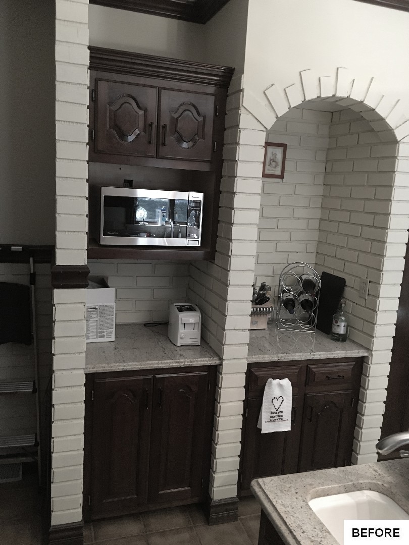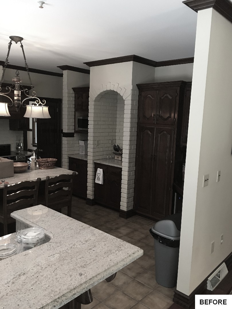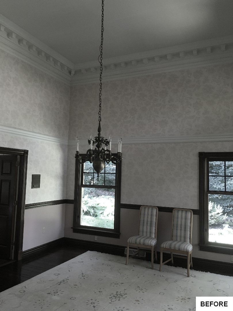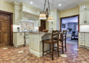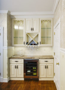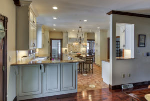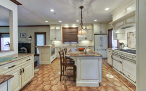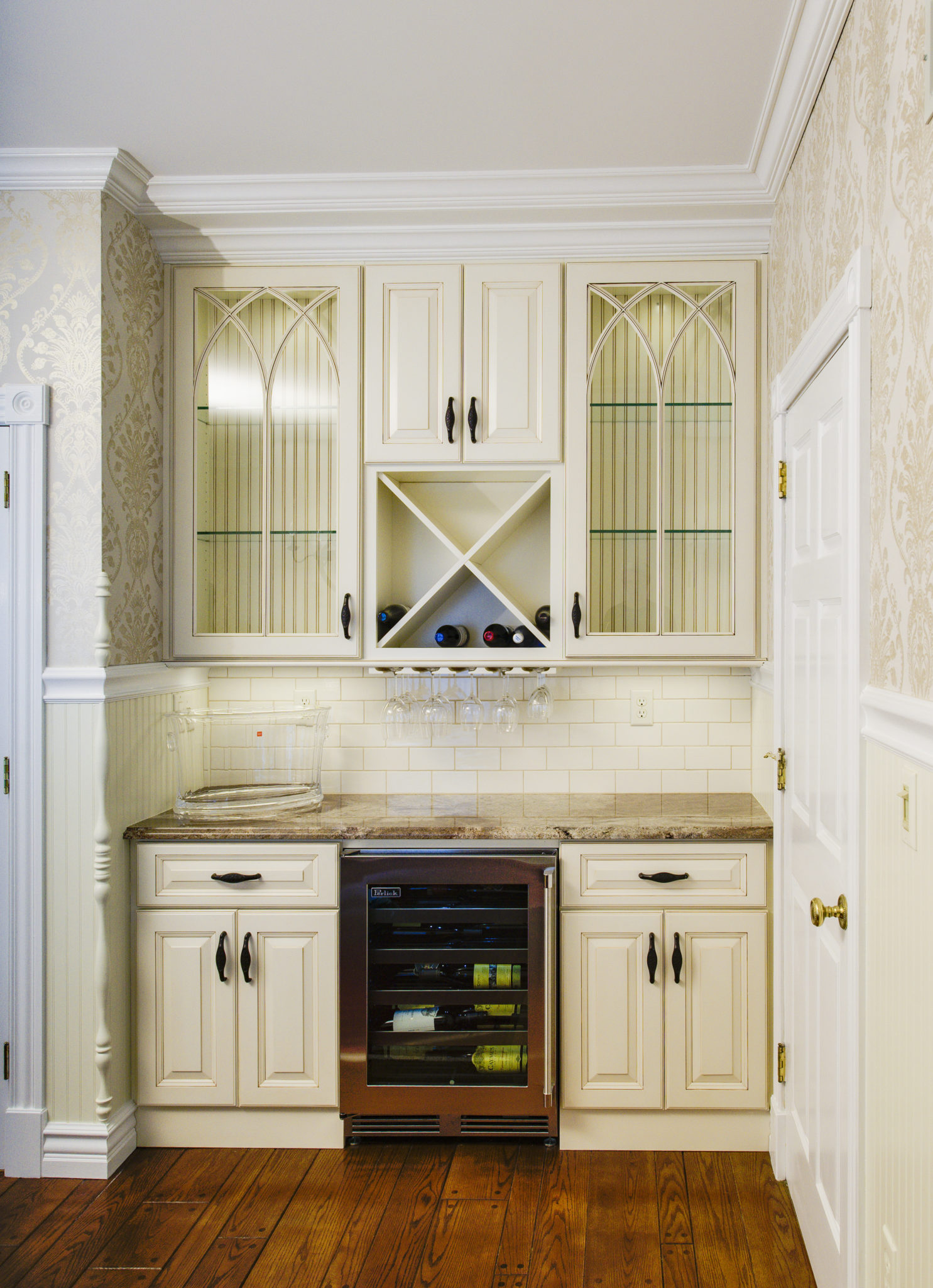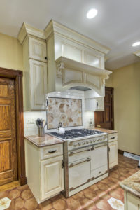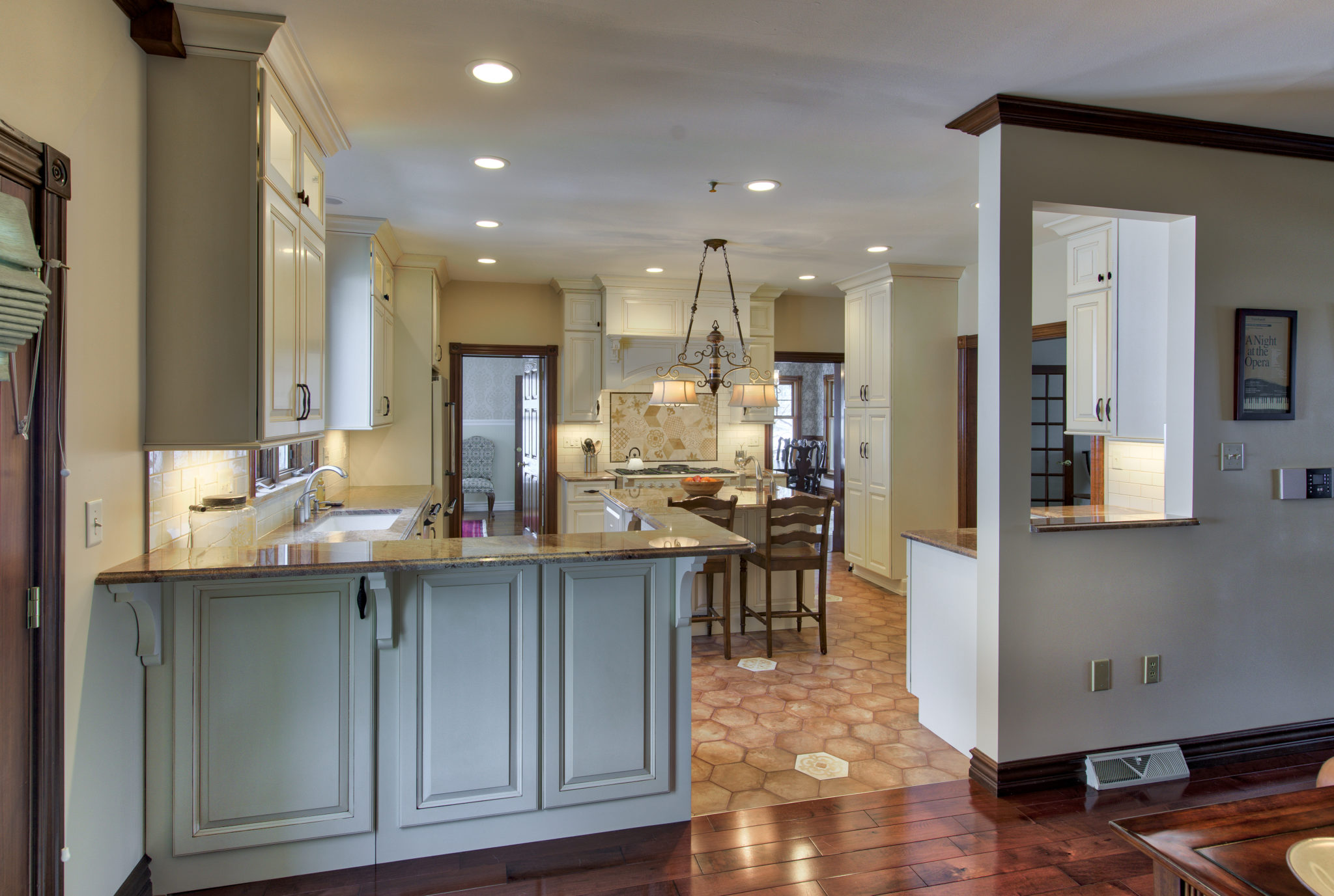 This kitchen and dining area makeover replaced dark, formal cabinetry with antiqued white cabinetry and many more amenities, including a new butler area with built in wine storage and chiller. A tiled feature above the gourmet stove serves as the focal point to the kitchen, pulling in the shape of the floor tiles and copper colors of the floor and granite countertops throughout. In addition to the added butler area in the dining space, new hardwood flooring, wallpaper, and moldings were added to create a grand new dining space that perfectly complements the new gourmet kitchen.