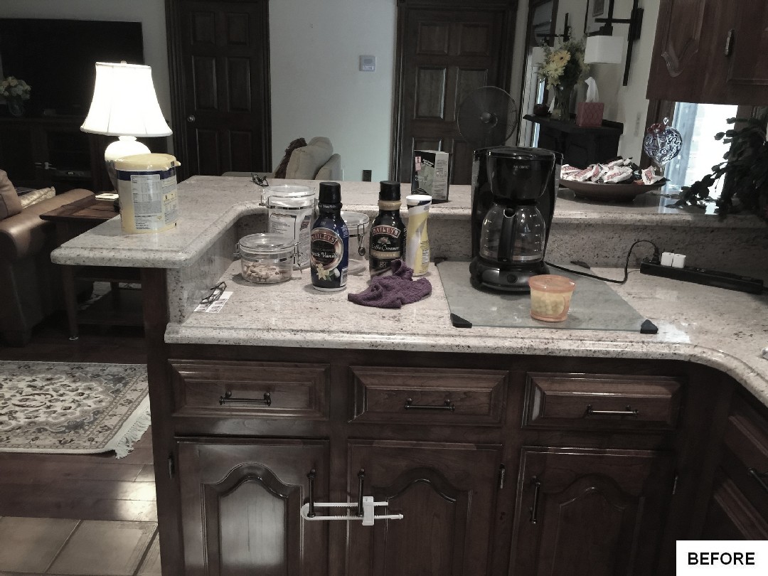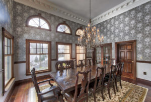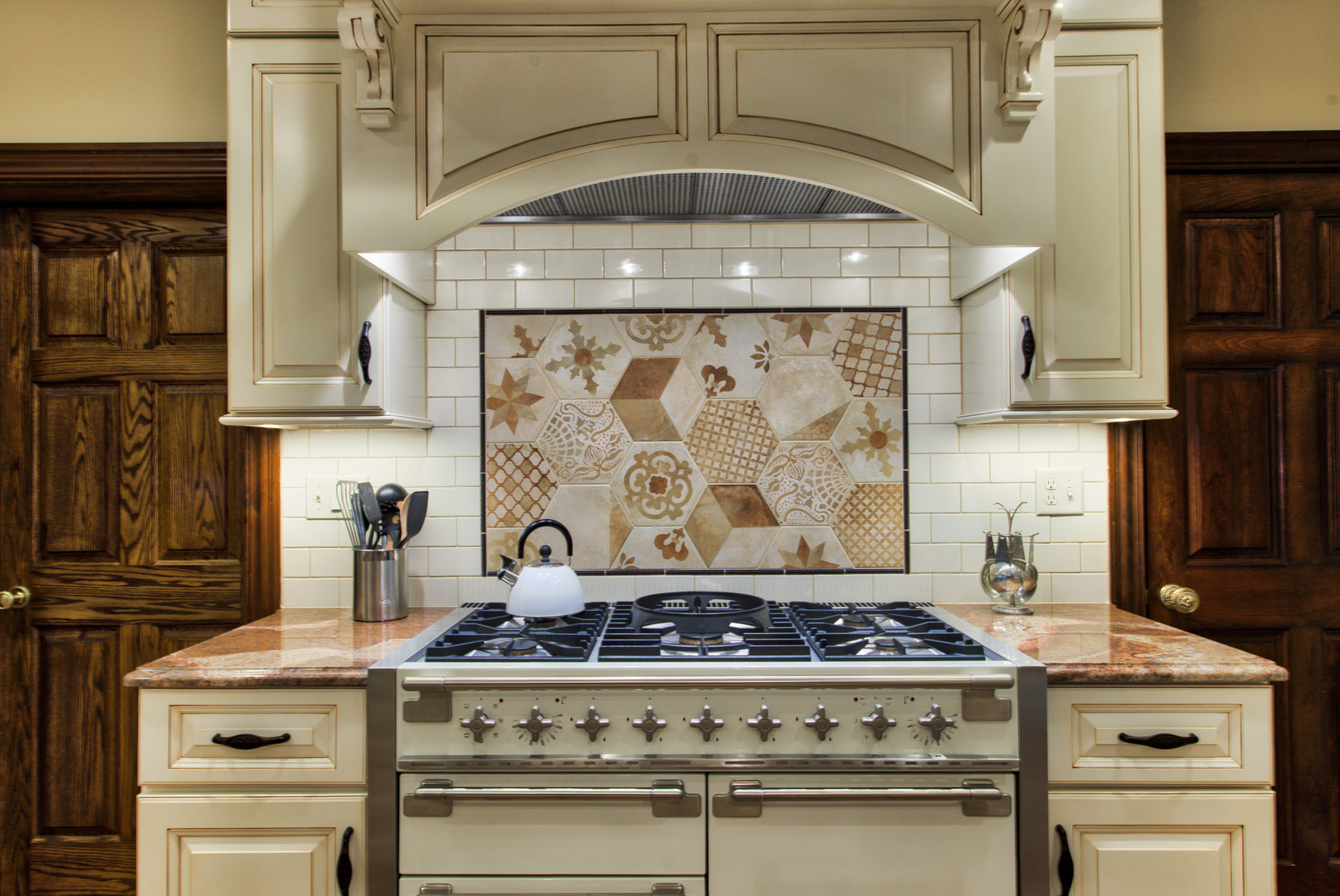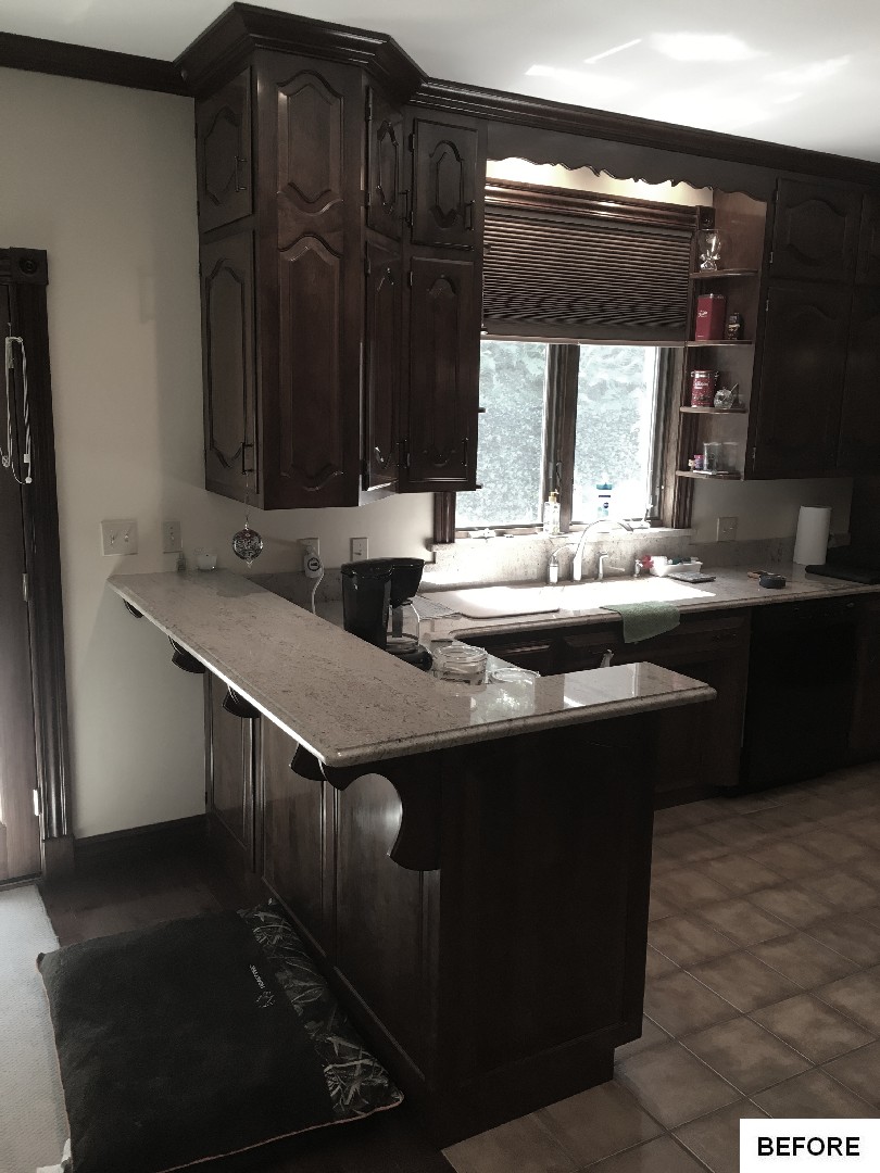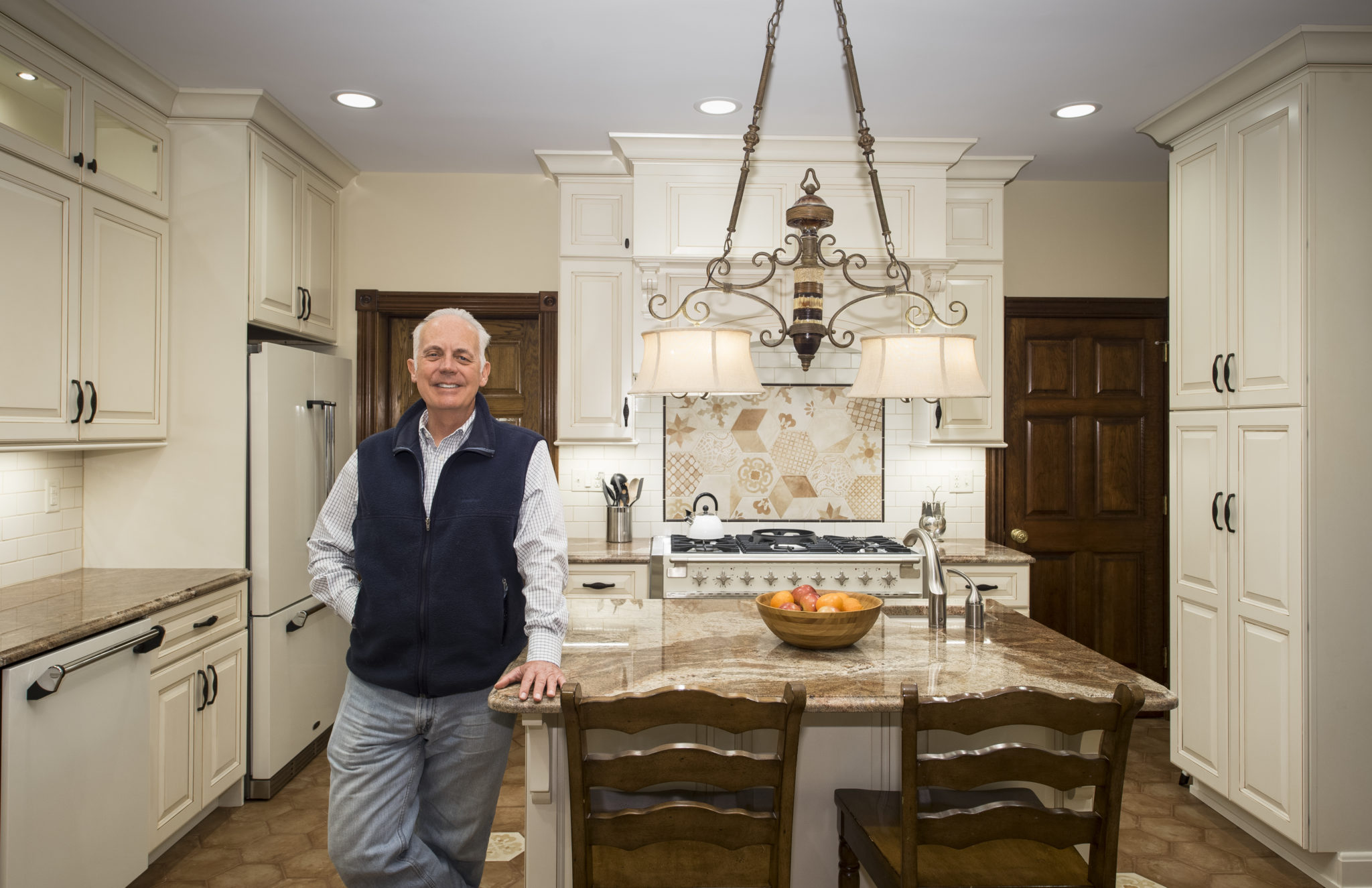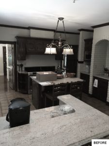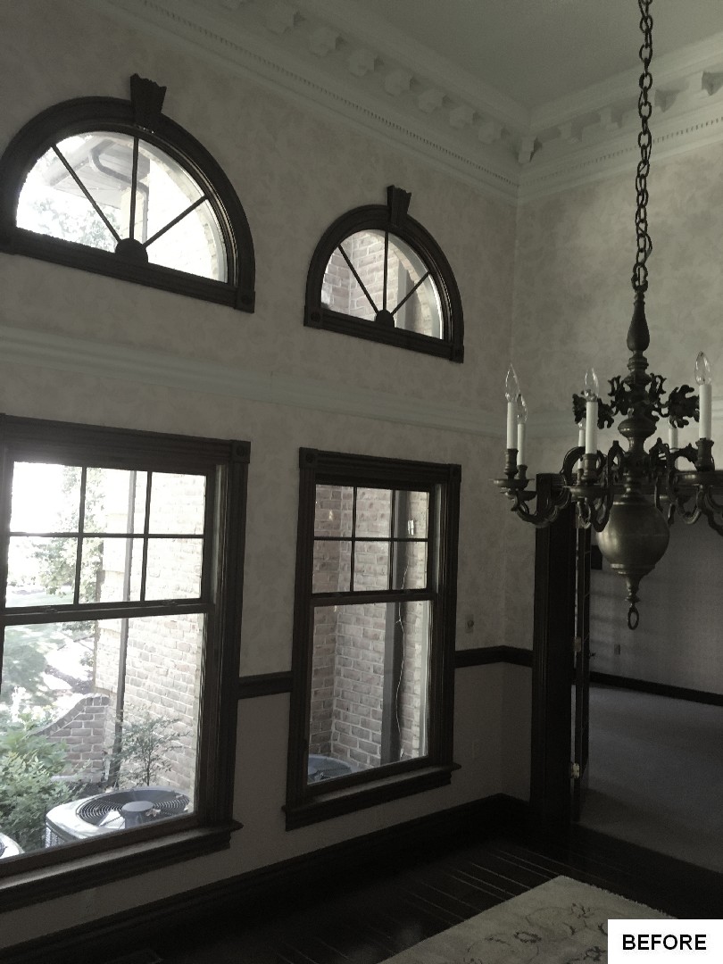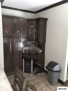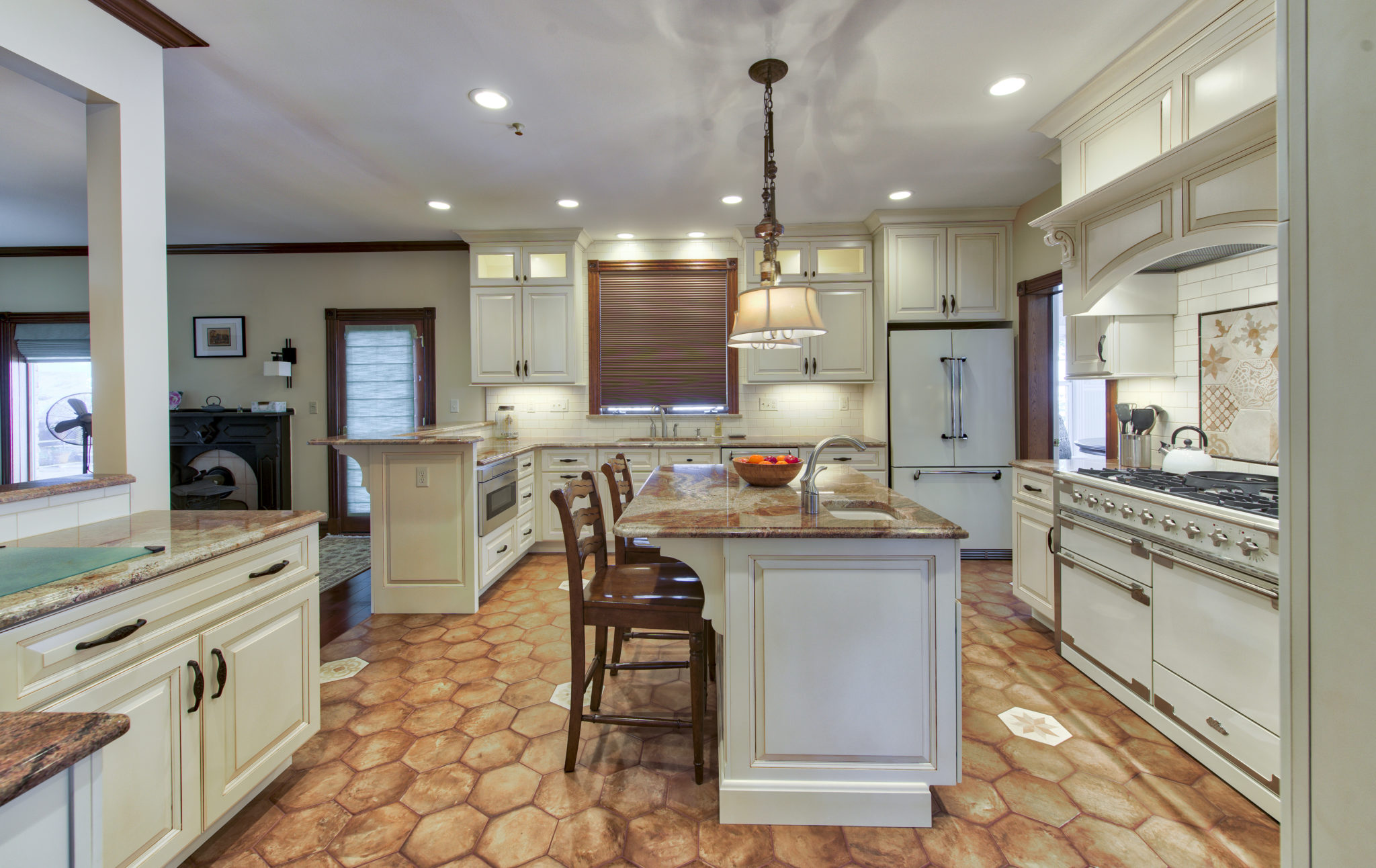 This kitchen and dining area makeover replaced dark, formal cabinetry with antiqued white cabinetry and many more amenities, including a new butler area with built in wine storage and chiller. A tiled feature above the gourmet stove serves as the focal point to the kitchen, pulling in the shape of the floor tiles and copper colors of the floor and granite countertops throughout. In addition to the added butler area in the dining space, new hardwood flooring, wallpaper, and moldings were added to create a grand new dining space that perfectly complements the new gourmet kitchen.