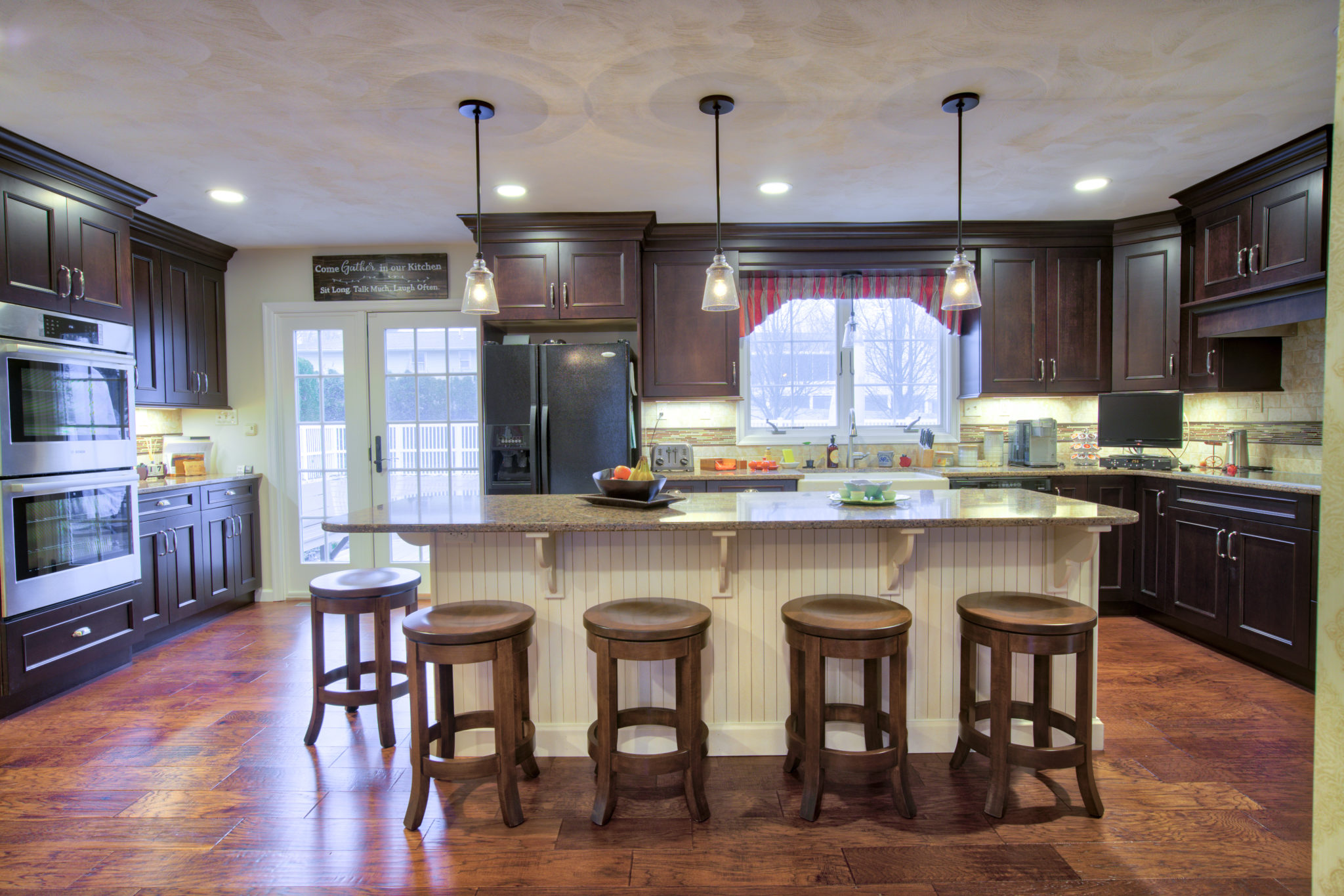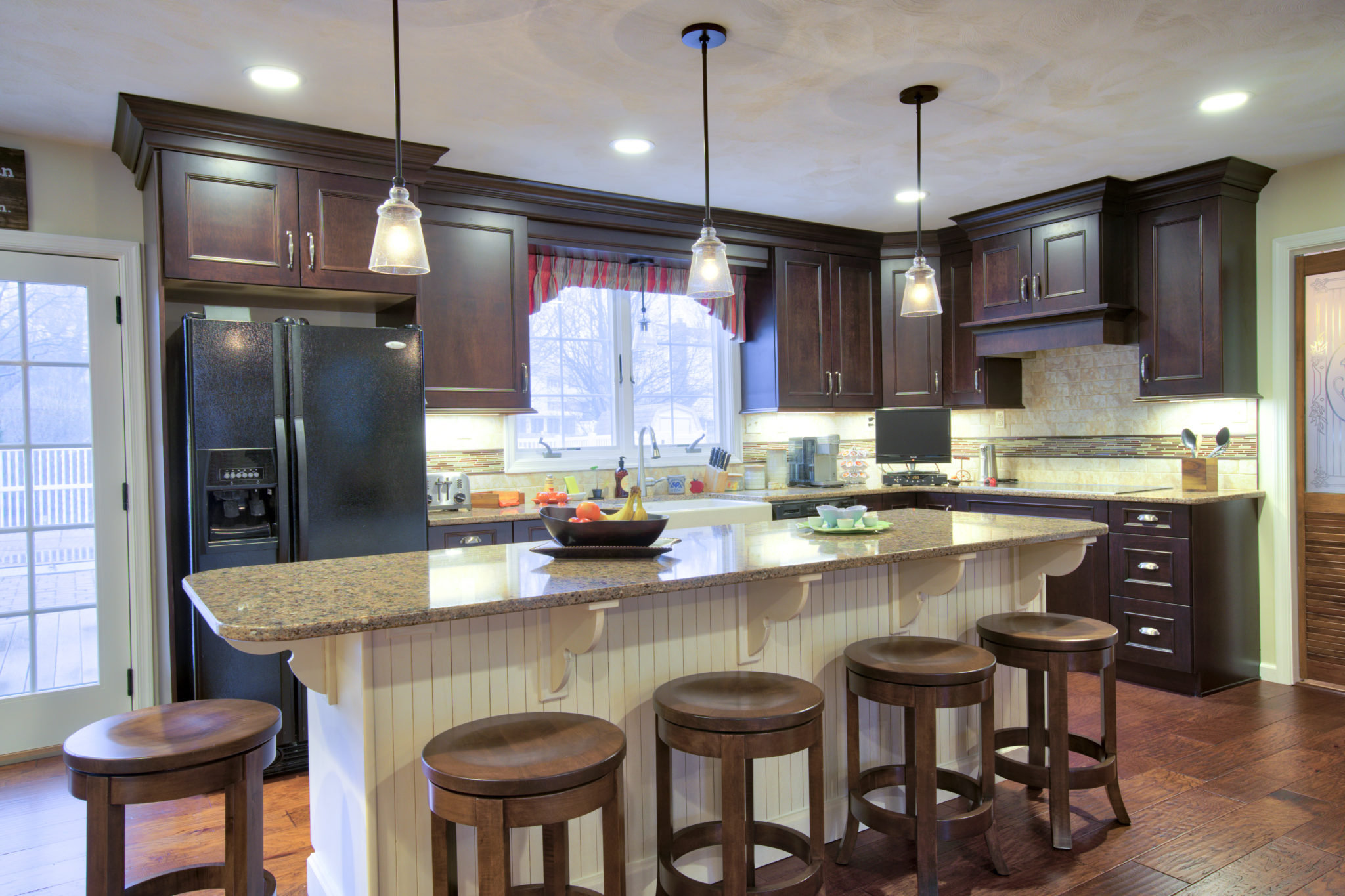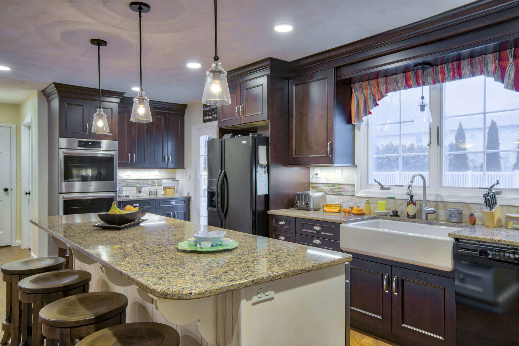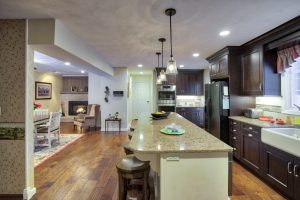 This beautiful open kitchen design was created by removing a dividing wall between the former kitchen and living room area. Now the kitchen area is open and inviting, and there is plenty of space for guests to mingle and relax. The previous living room was also repurposed as a dining area. A former pantry was removed as part of the remodel, with new cabinetry, granite counters, and a space-saving and convenient microwave drawer providing plenty of storage and workspace. Design features include a farmer’s sink, a large contrasting color island and patterned wallpaper in the dining area to pull everything together.