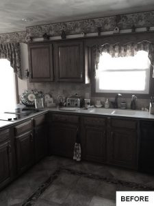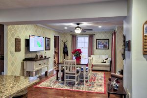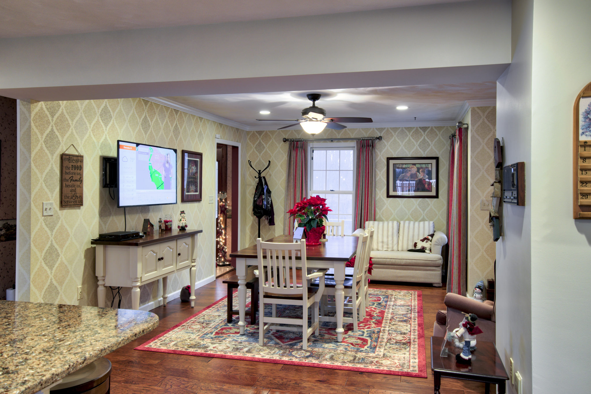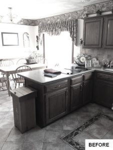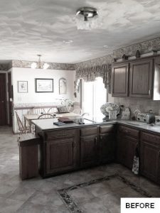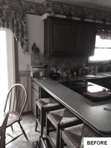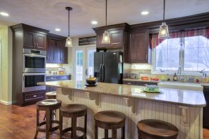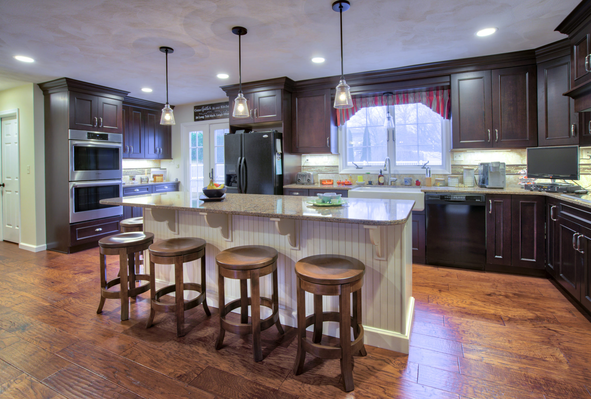 This beautiful open kitchen design was created by removing a dividing wall between the former kitchen and living room area. Now the kitchen area is open and inviting, and there is plenty of space for guests to mingle and relax. The previous living room was also repurposed as a dining area. A former pantry was removed as part of the remodel, with new cabinetry, granite counters, and a space-saving and convenient microwave drawer providing plenty of storage and workspace. Design features include a farmer’s sink, a large contrasting color island and patterned wallpaper in the dining area to pull everything together.