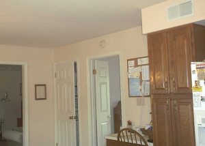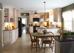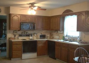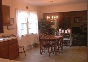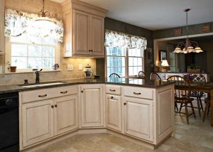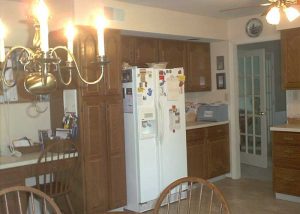 This formerly dark and dated kitchen got a beautiful make-over with glass-paneled white cabinetry and shiny new granite countertops.