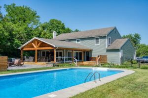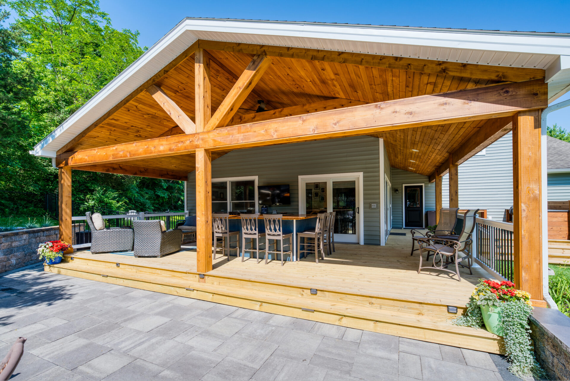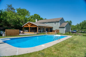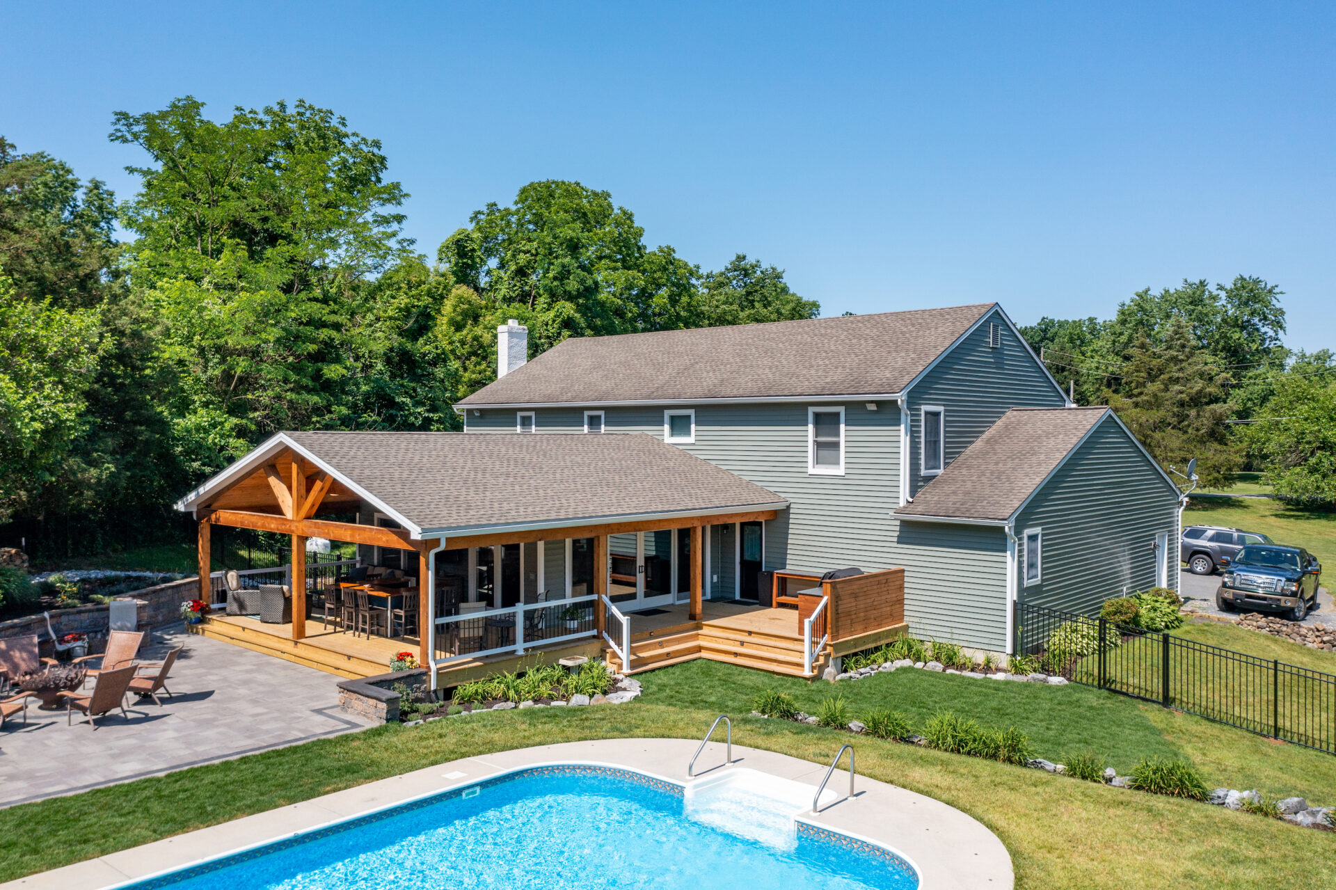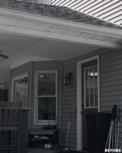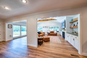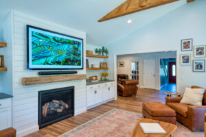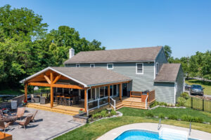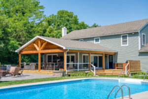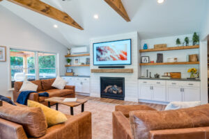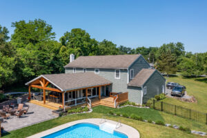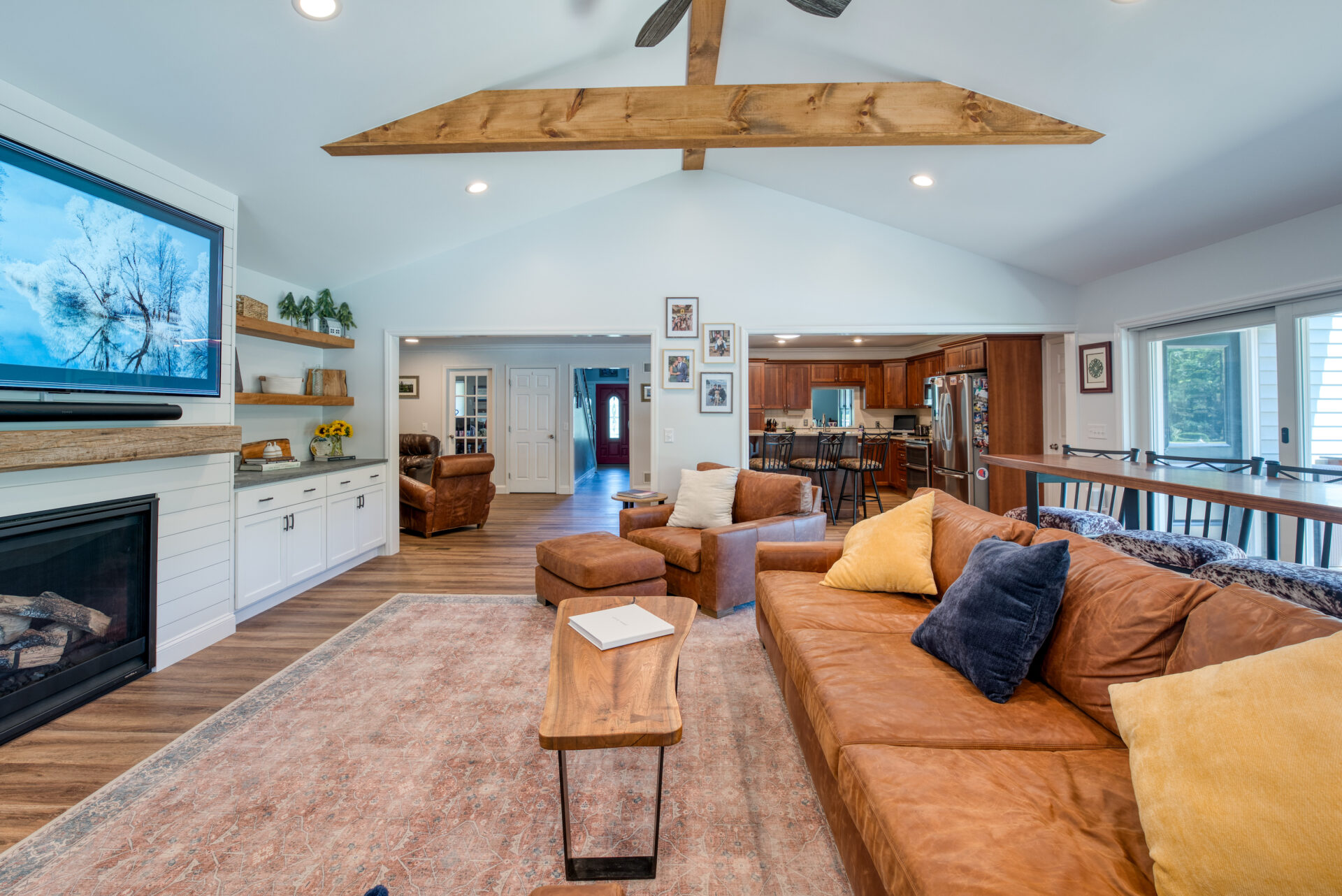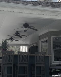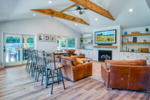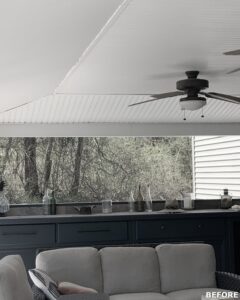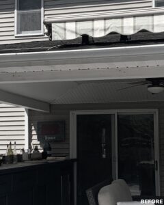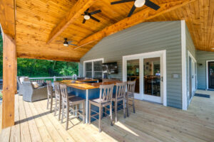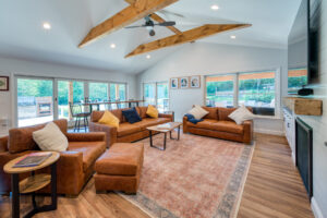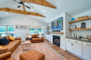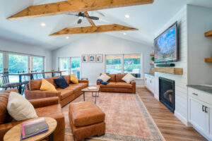 This family significantly expanded the living space in their home with an addition featuring lots of lounging space, a tv, and a fireplace. The high ceiling with wooden beams adds even more space and character to the room, and all the windows let in natural light and provide views to the beautiful covered outdoor space, the pool, and lawn. The covered outdoor space is perfect for protected dining, with outdoor ceiling fans and lights in the pitched roof for added comfort and enjoyment. The front porch of the home was also remodeled as part of this project.