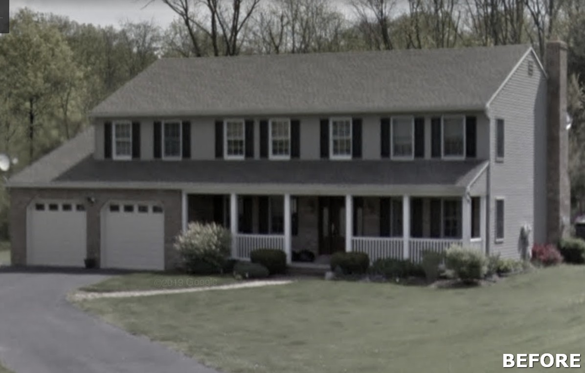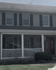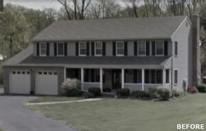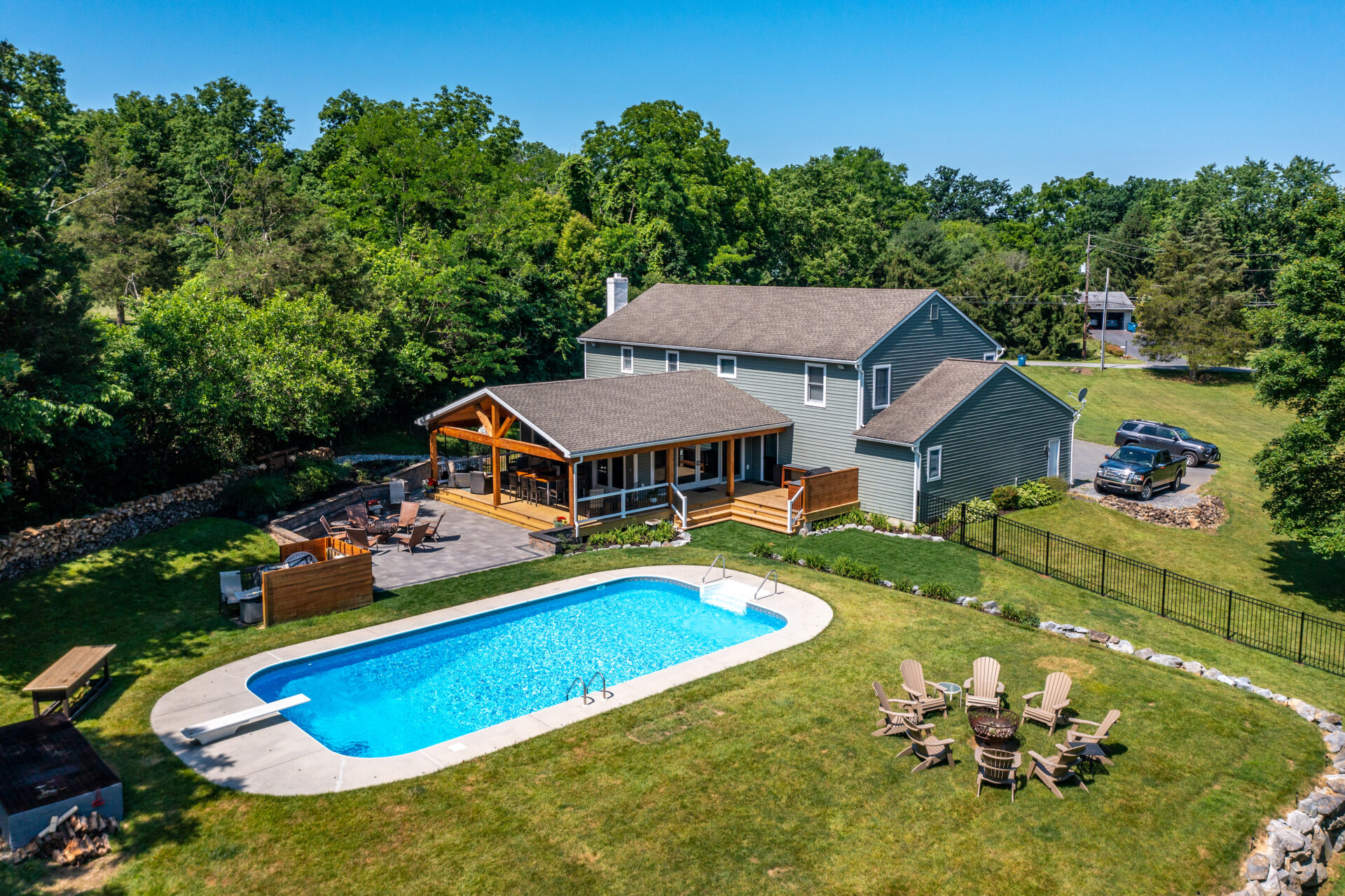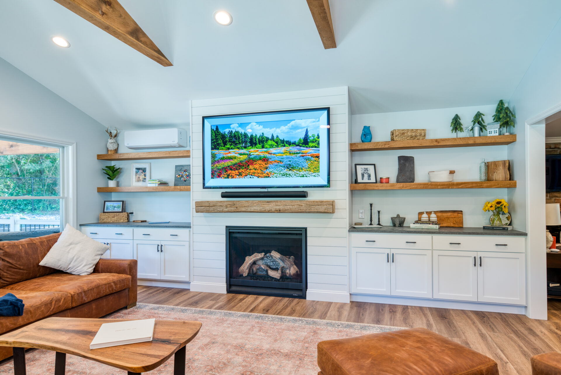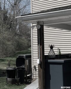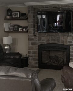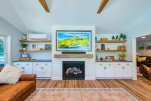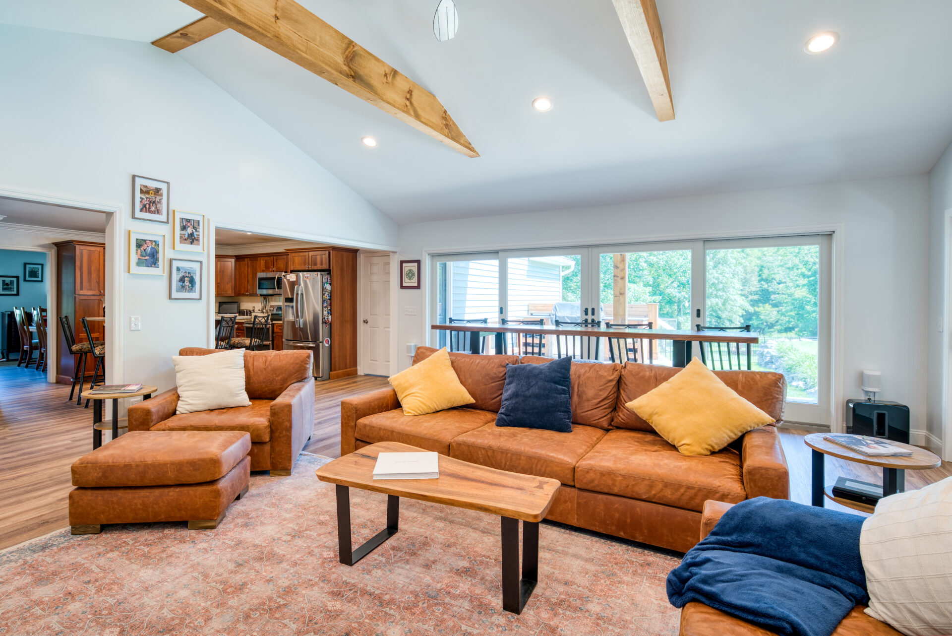 This family significantly expanded the living space in their home with an addition featuring lots of lounging space, a tv, and a fireplace. The high ceiling with wooden beams adds even more space and character to the room, and all the windows let in natural light and provide views to the beautiful covered outdoor space, the pool, and lawn. The covered outdoor space is perfect for protected dining, with outdoor ceiling fans and lights in the pitched roof for added comfort and enjoyment. The front porch of the home was also remodeled as part of this project.