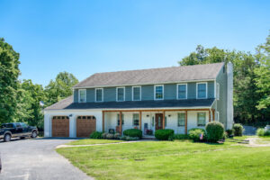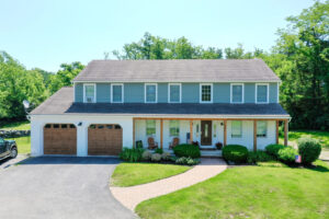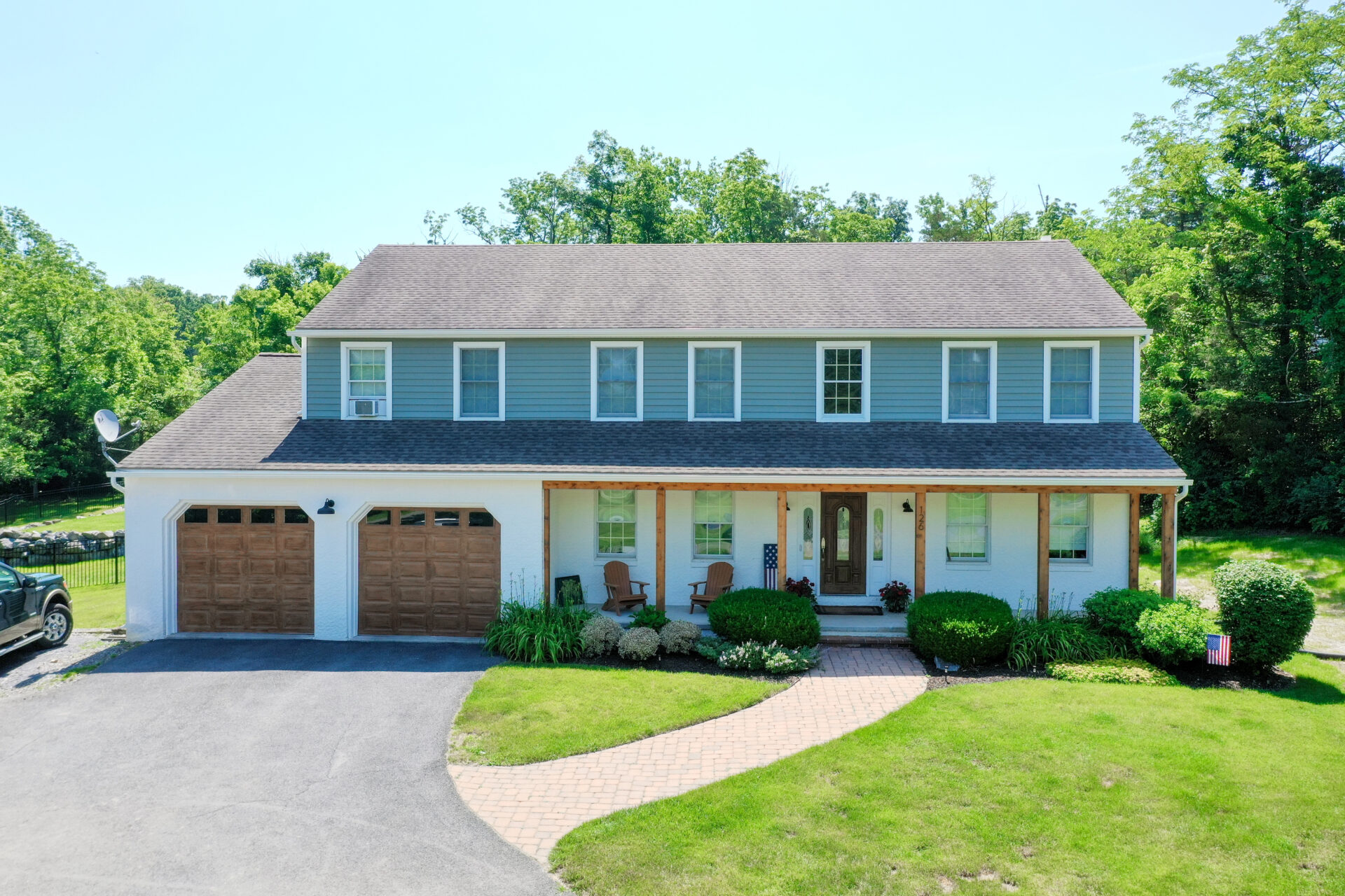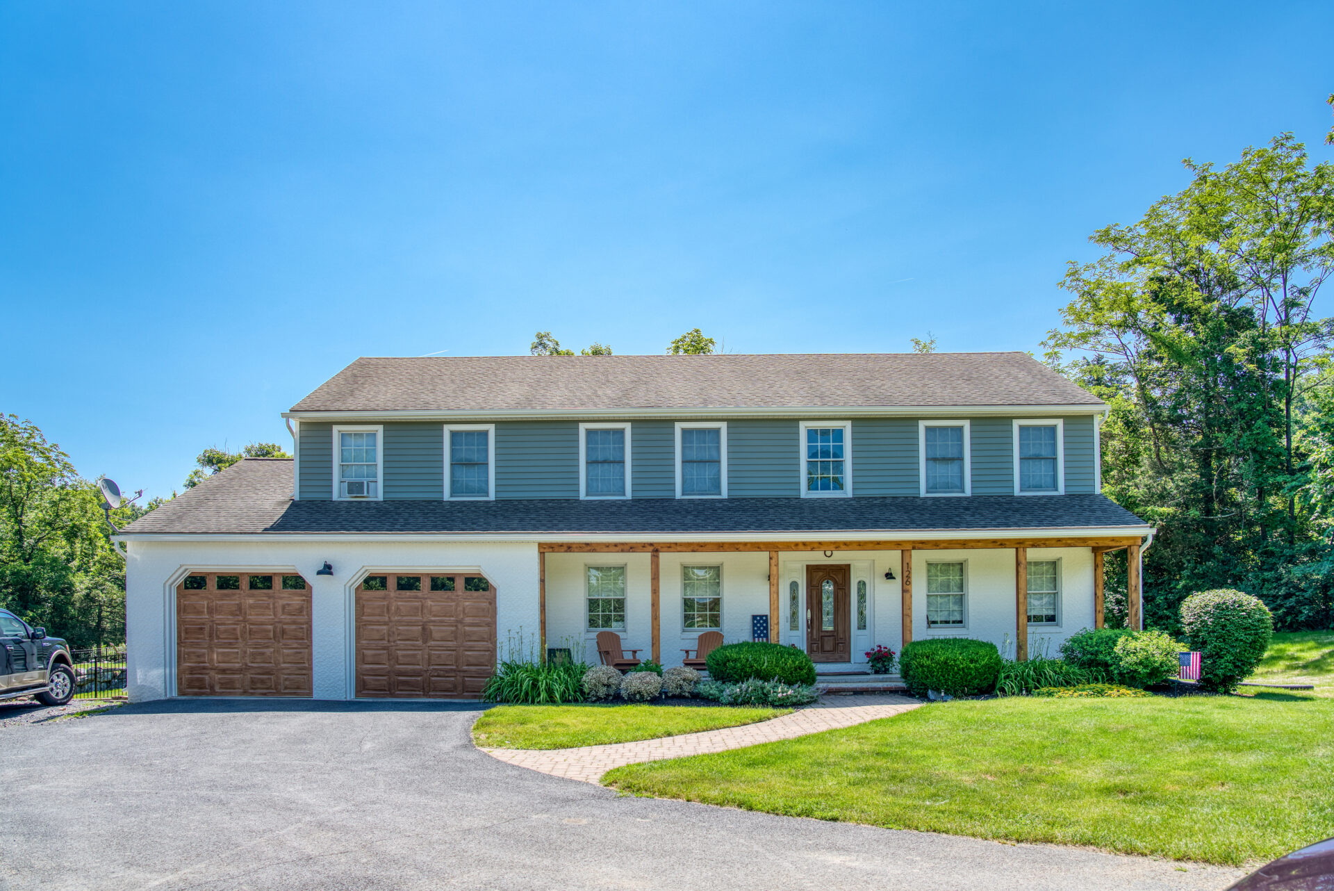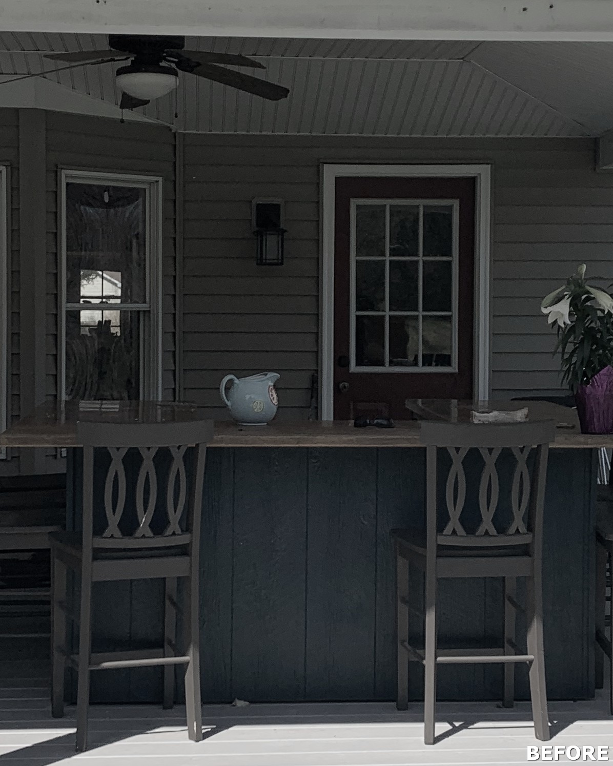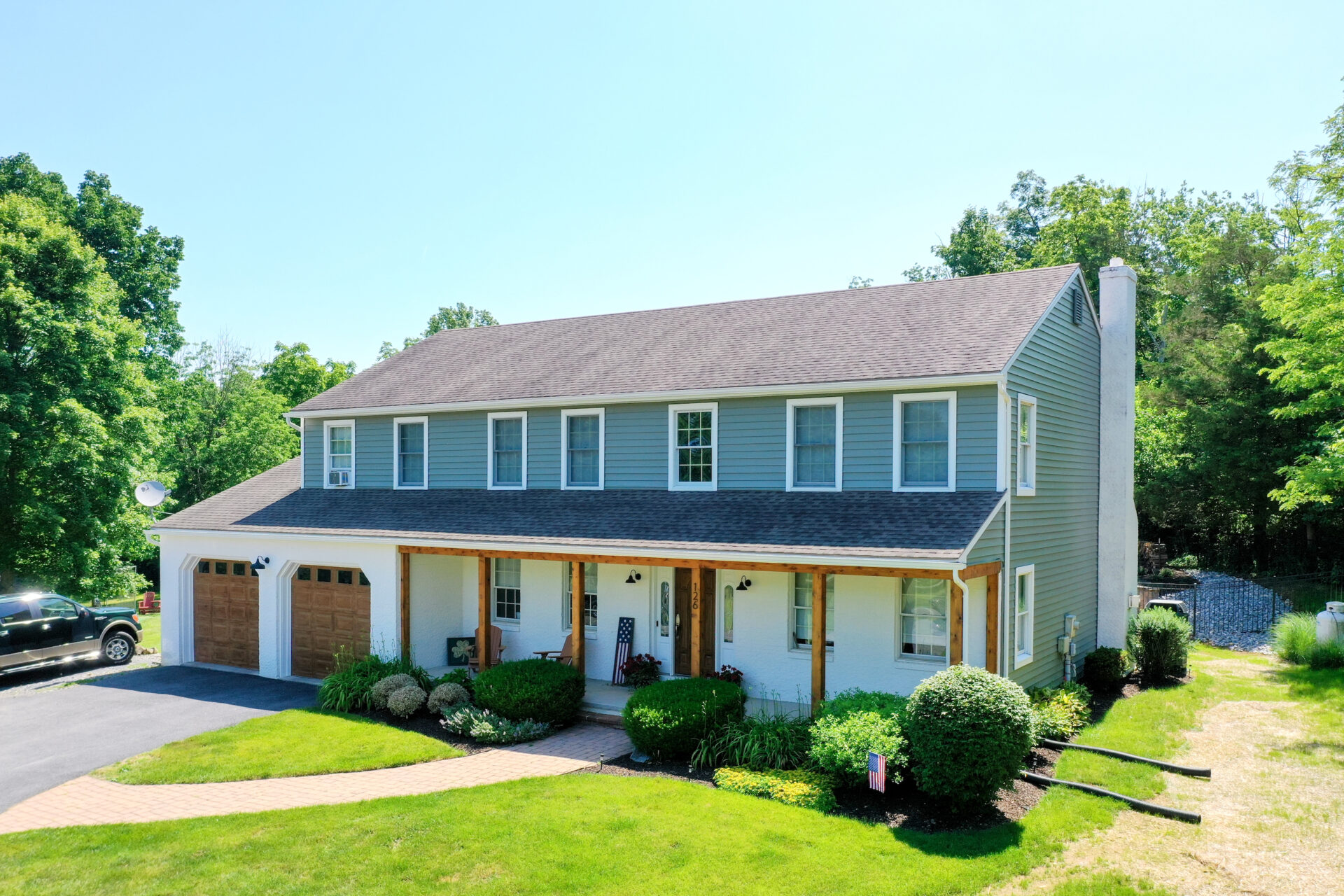 This family significantly expanded the living space in their home with an addition featuring lots of lounging space, a tv, and a fireplace. The high ceiling with wooden beams adds even more space and character to the room, and all the windows let in natural light and provide views to the beautiful covered outdoor space, the pool, and lawn. The covered outdoor space is perfect for protected dining, with outdoor ceiling fans and lights in the pitched roof for added comfort and enjoyment. The front porch of the home was also remodeled as part of this project.