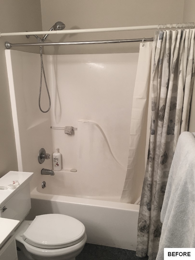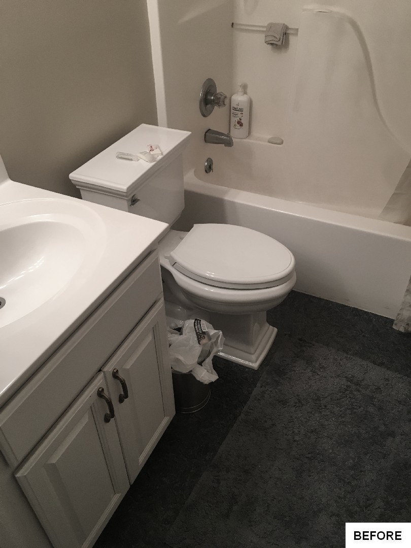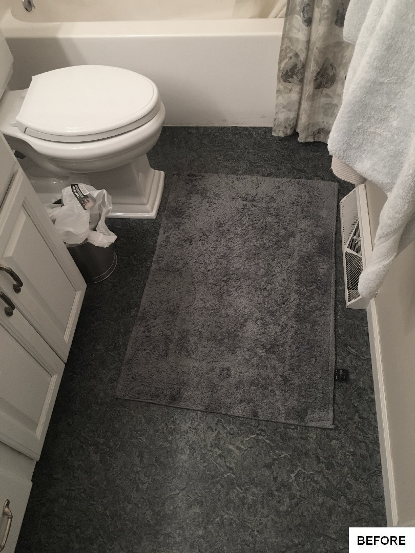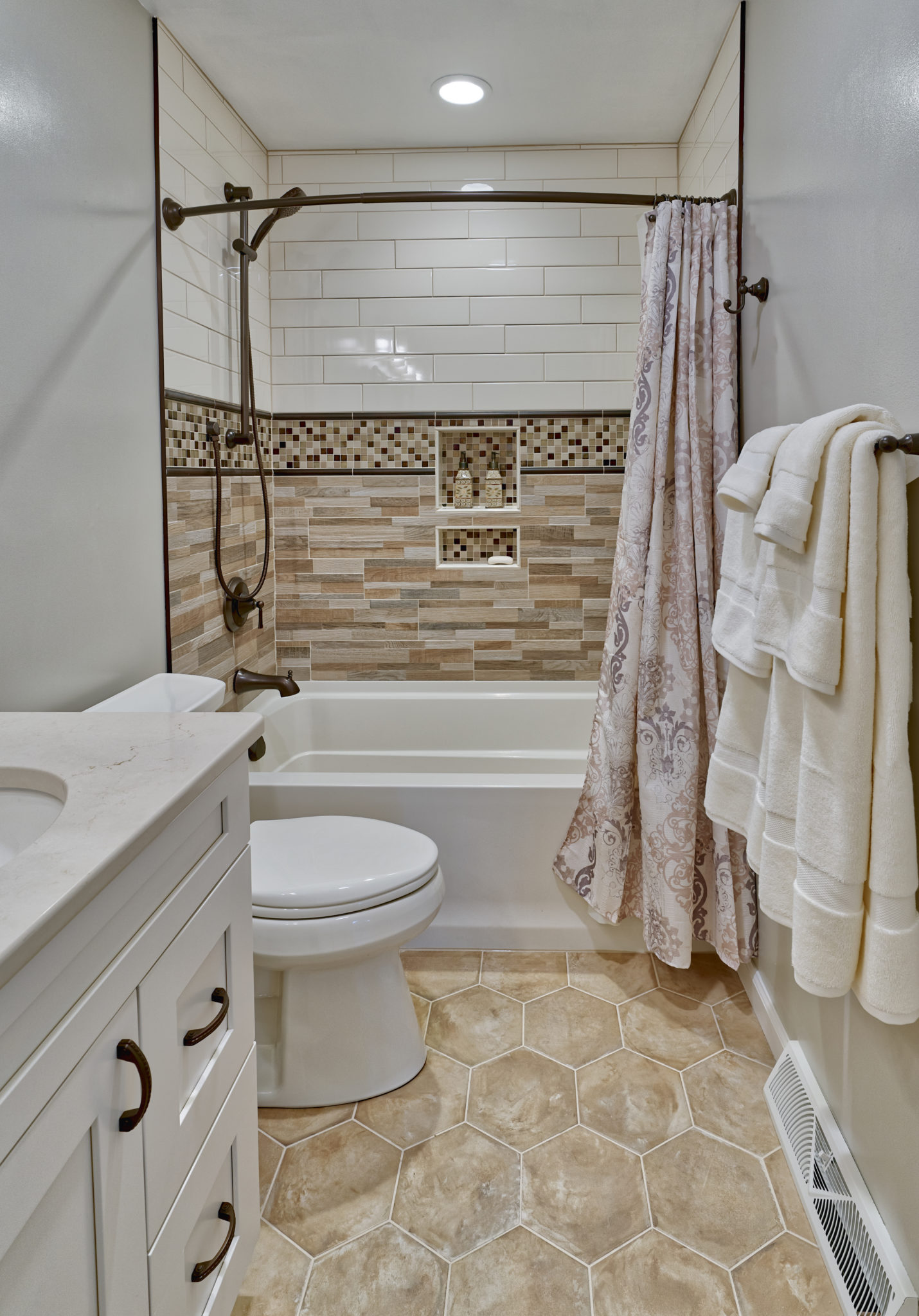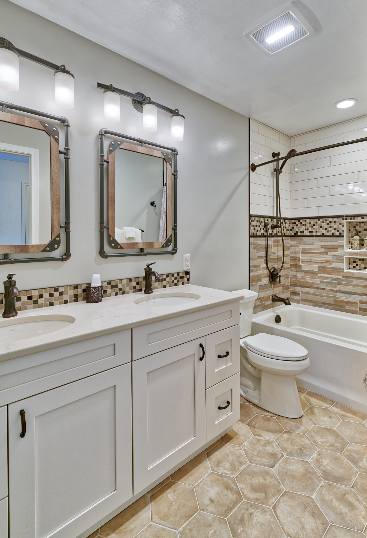 This bathroom got an on-trend update with aged bronze fixtures, a tiled shower with mosaic detail and inset holders for soap and shampoo, and a new bathtub, among other features. The outdated flooring was also replaced with modern hexagonal tile, and a new vanity, industrial-inspired mirrors, and updated lighting complete the look.