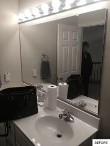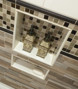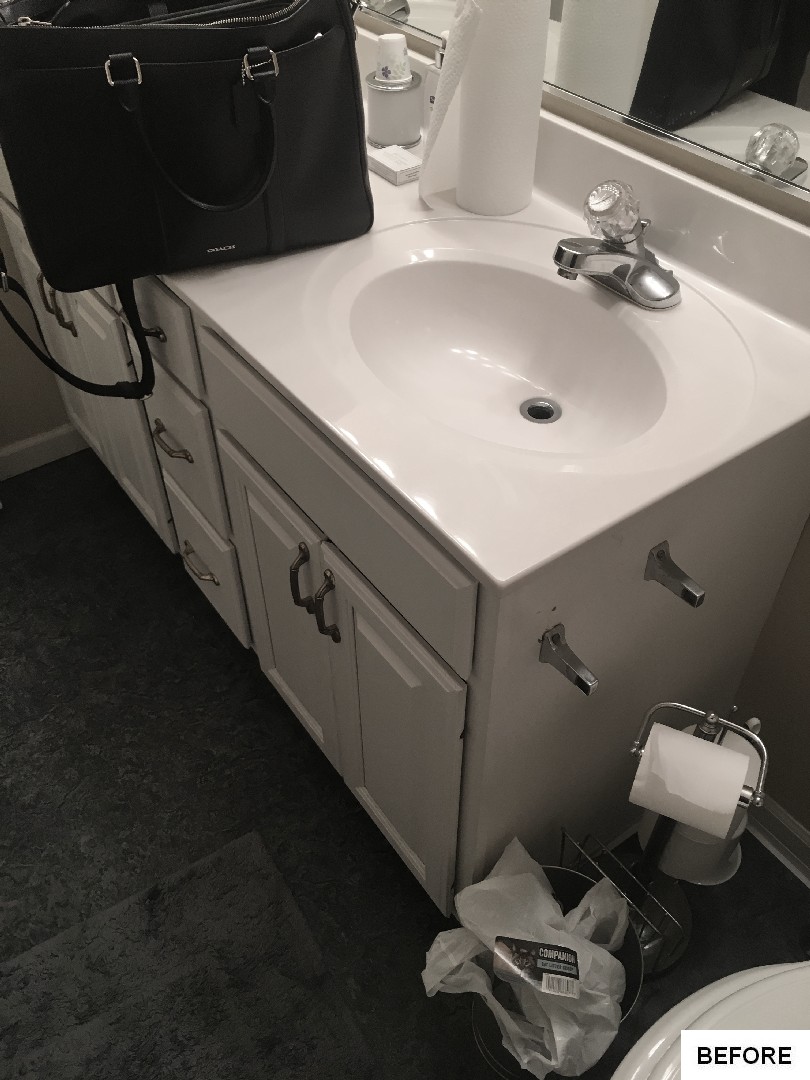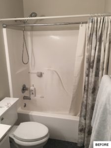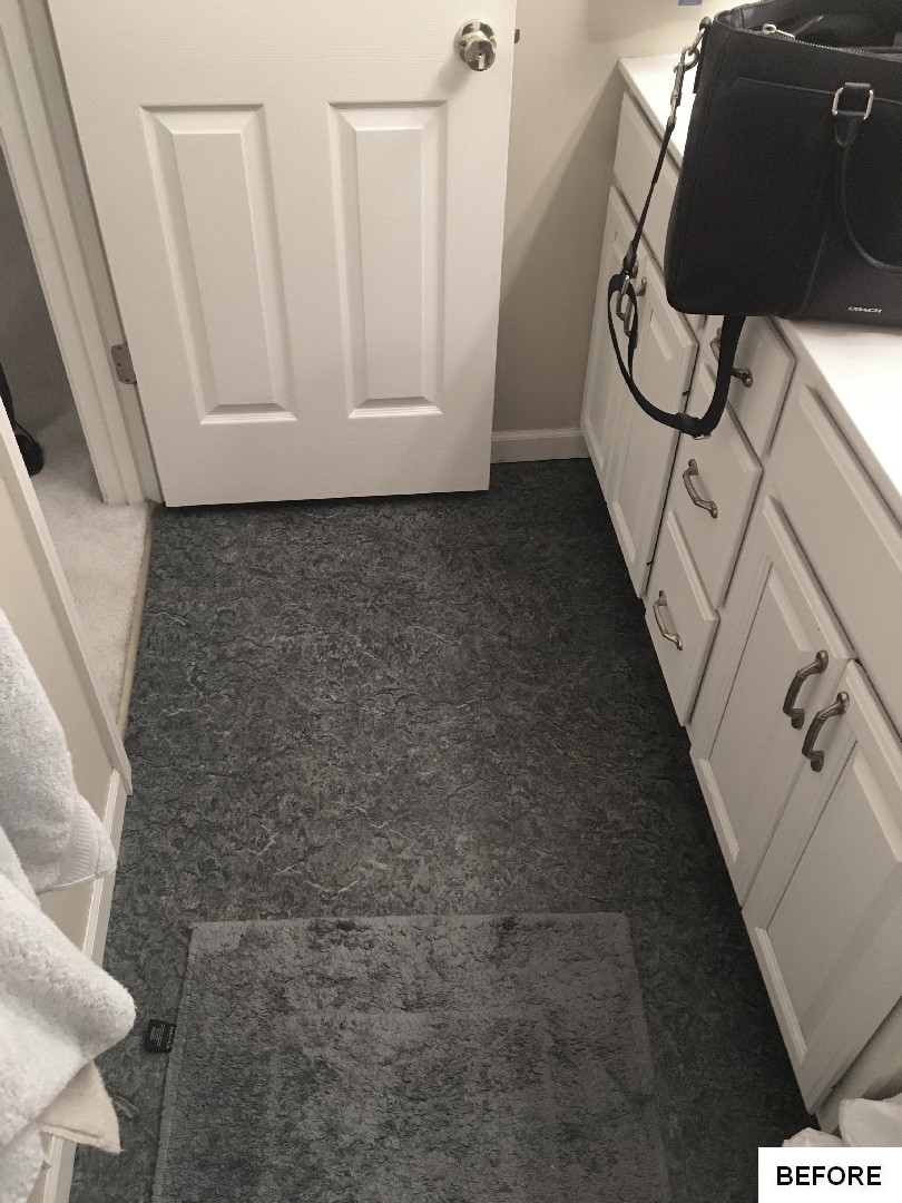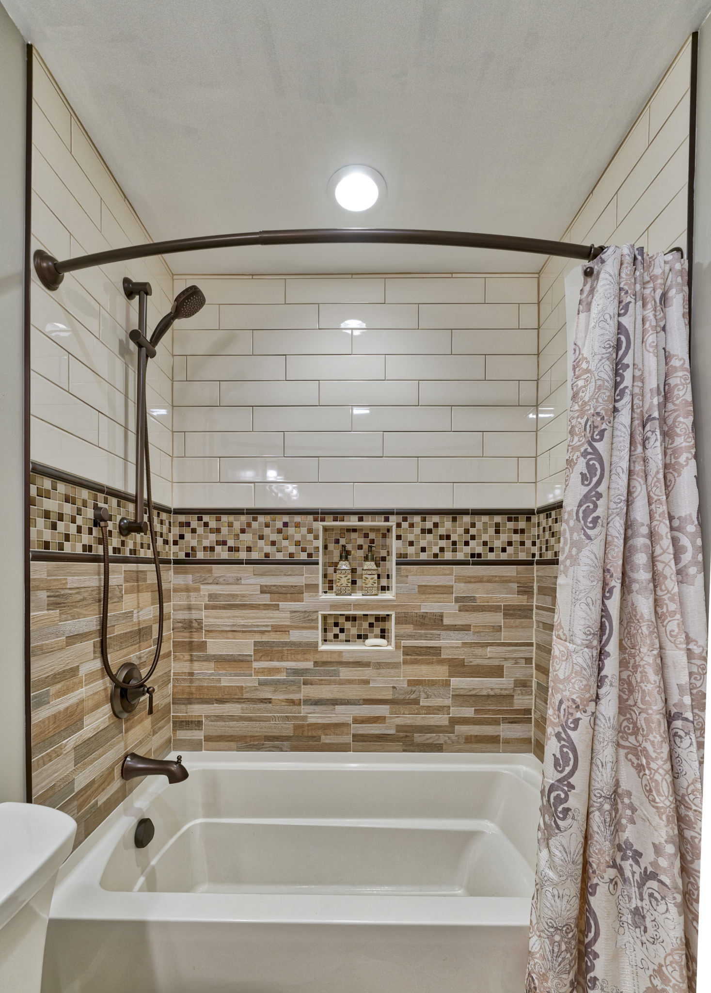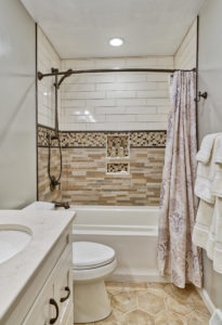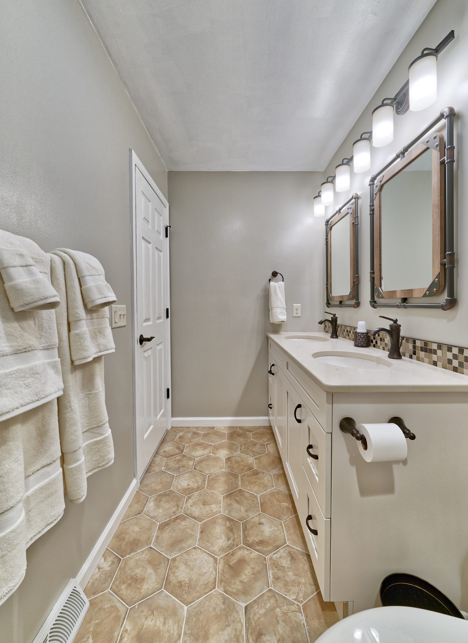 This bathroom got an on-trend update with aged bronze fixtures, a tiled shower with mosaic detail and inset holders for soap and shampoo, and a new bathtub, among other features. The outdated flooring was also replaced with modern hexagonal tile, and a new vanity, industrial-inspired mirrors, and updated lighting complete the look.