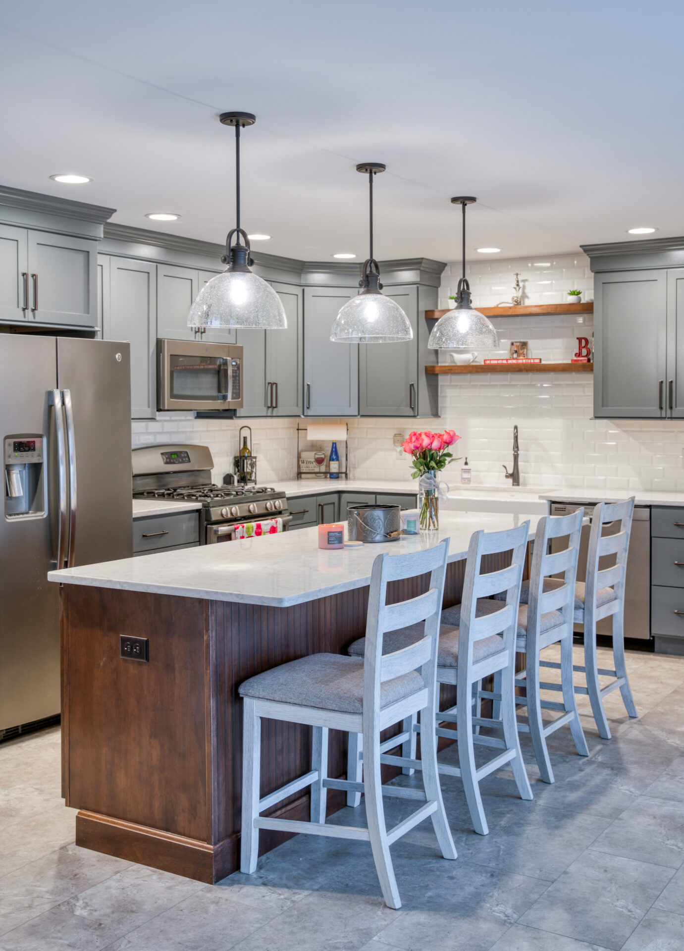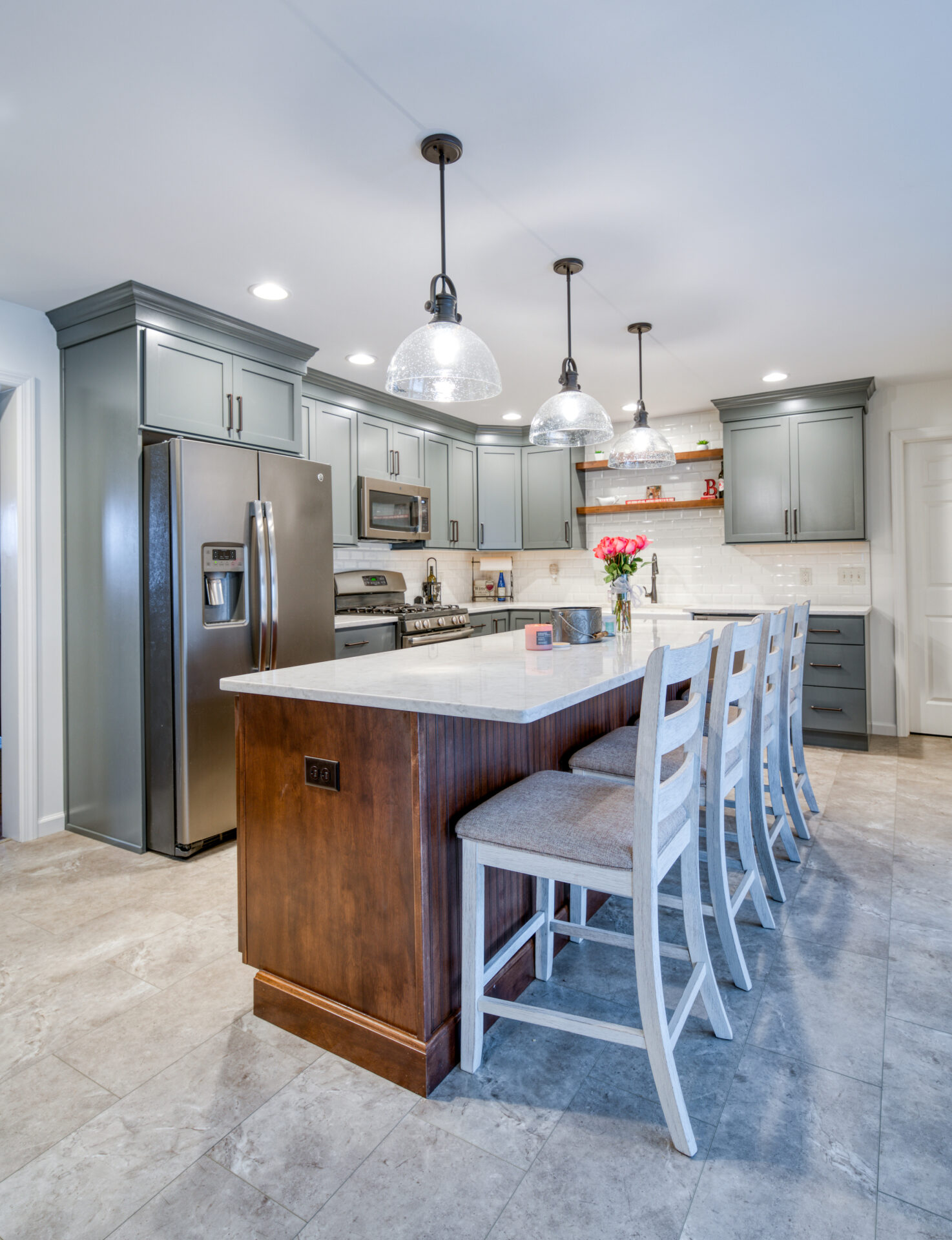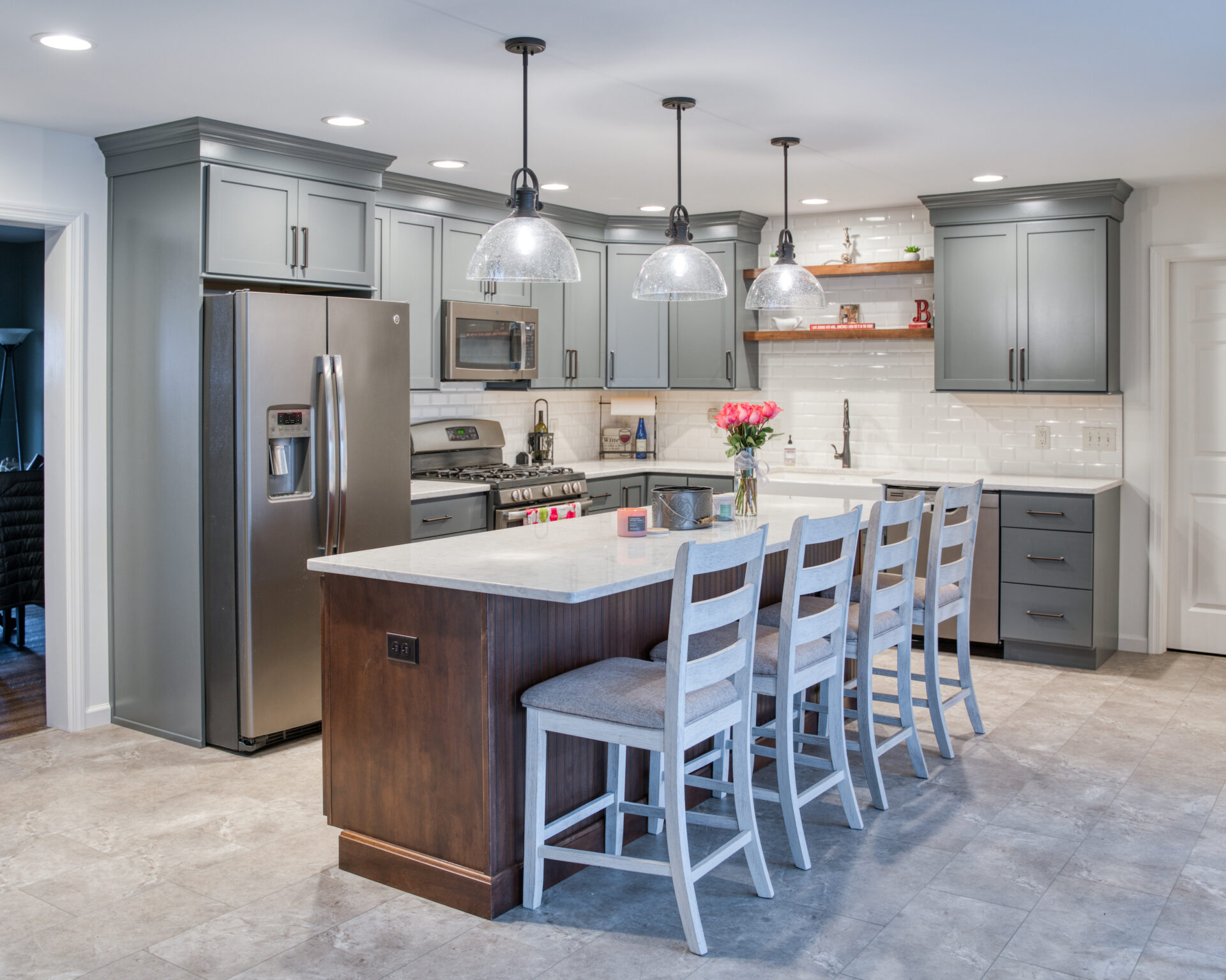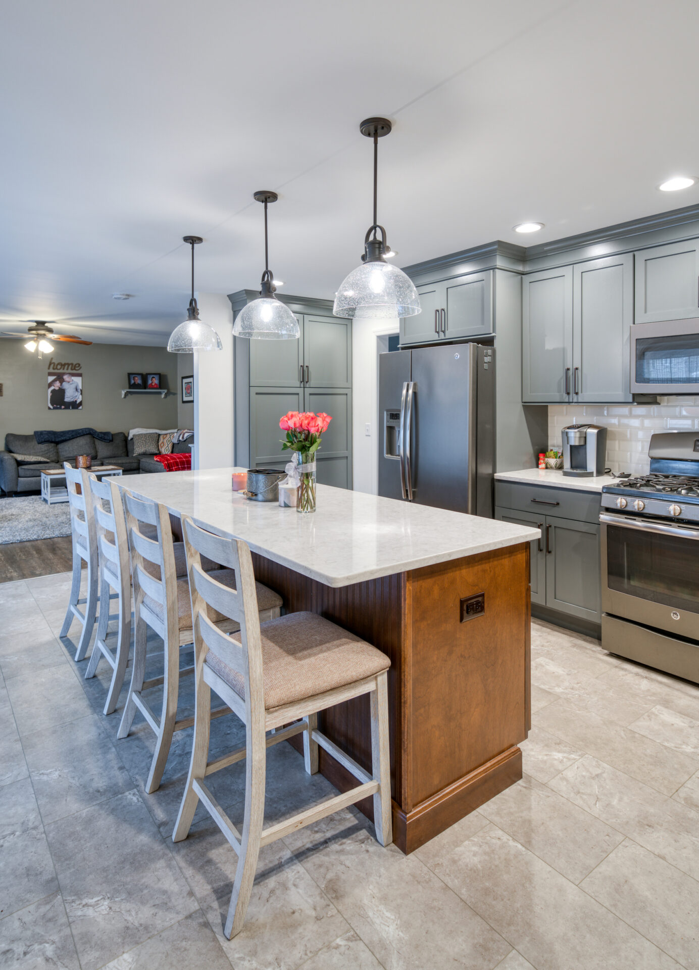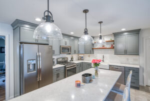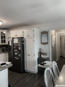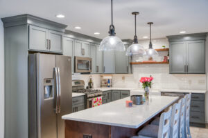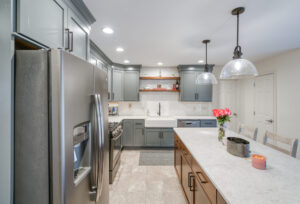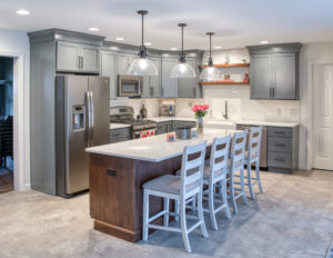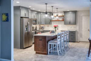 The focal point of this kitchen remodel is the large wooden center island which serves as both prep space and seating. The lighter color palette and new appliances in the space brighten the overall look of the kitchen, and the ceiling-height cabinetry, crown moulding and lighting create an open and airy feel as well. The kitchen area now flows organically into the dining area and an added pantry provides plenty of storage.