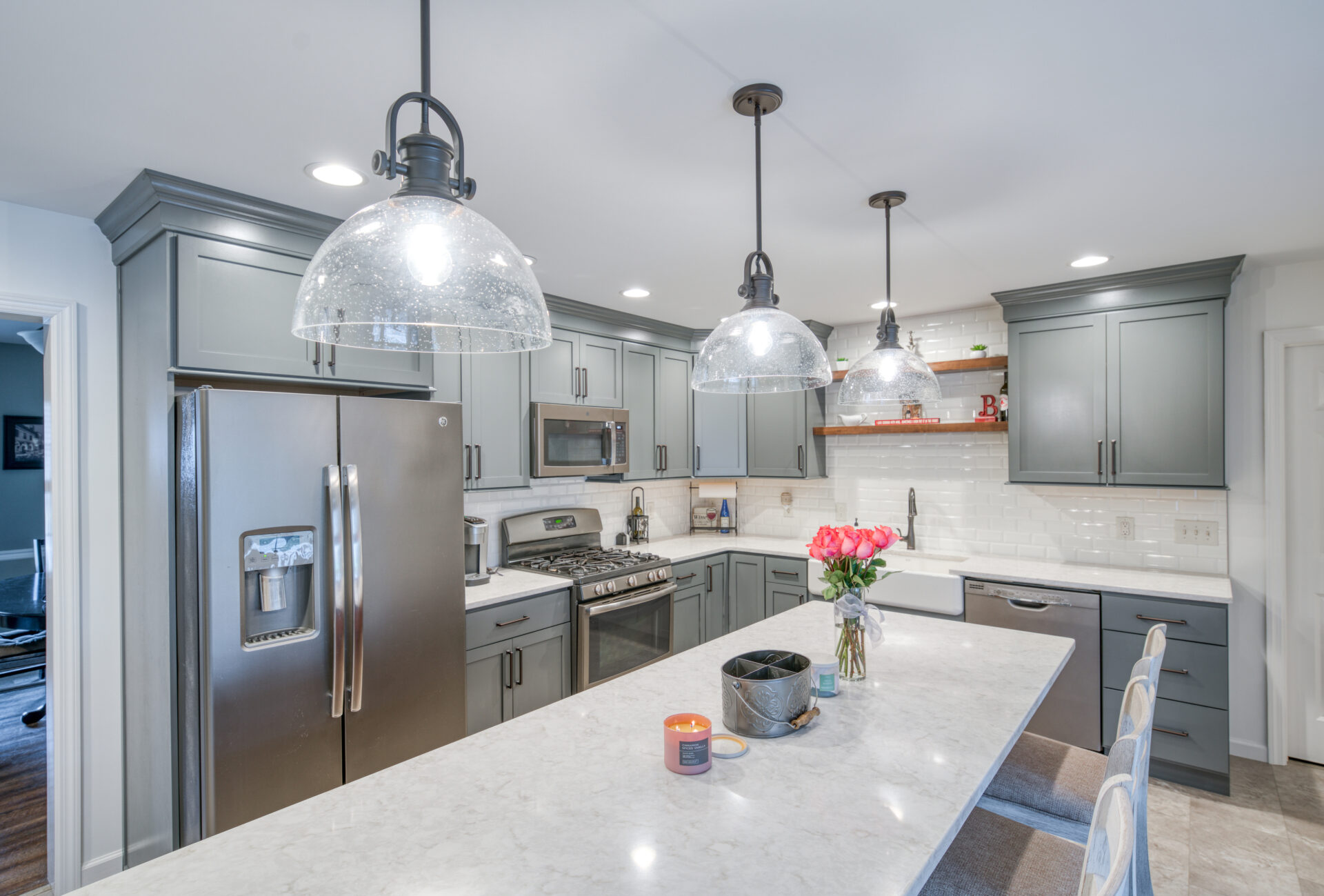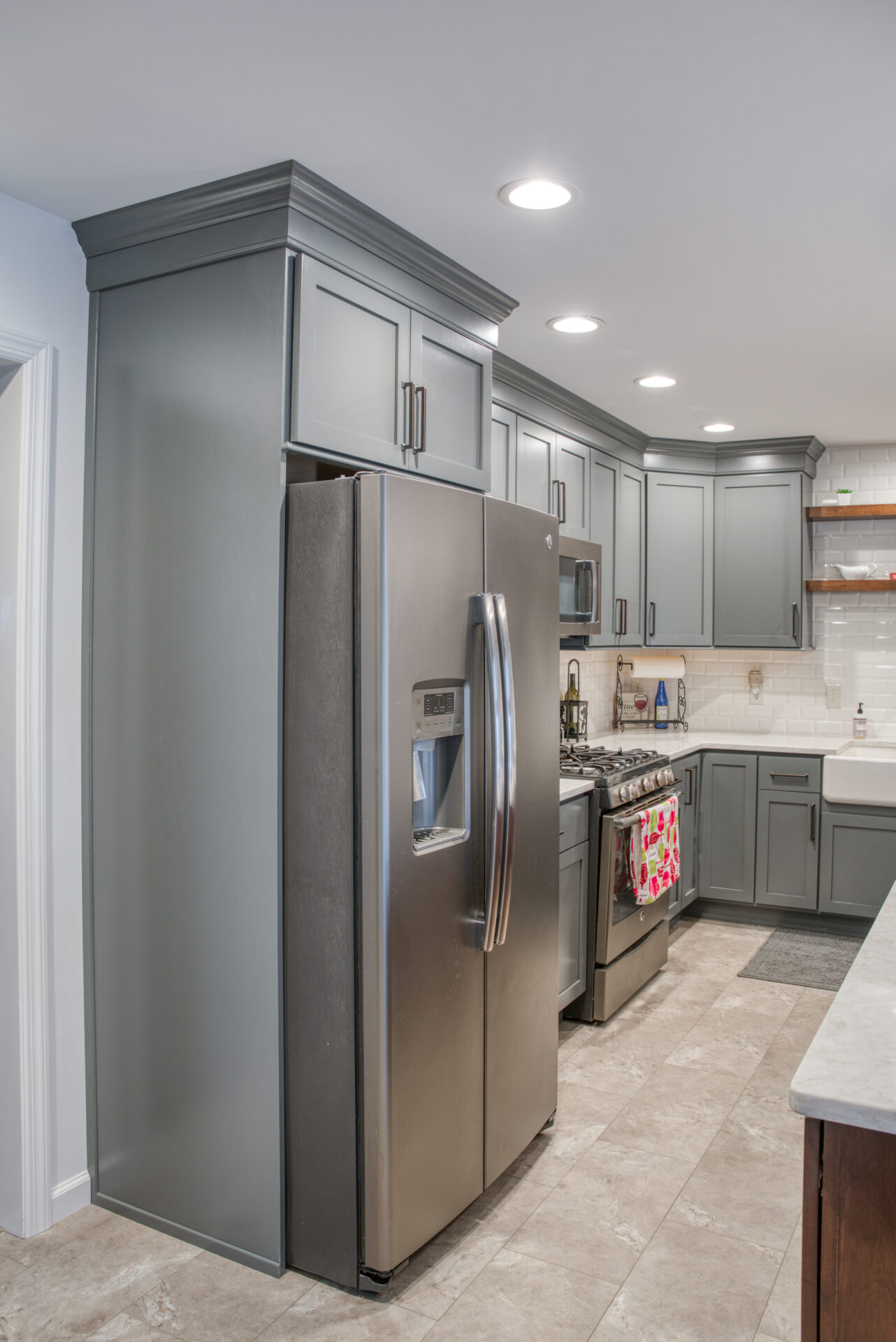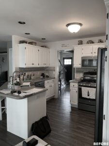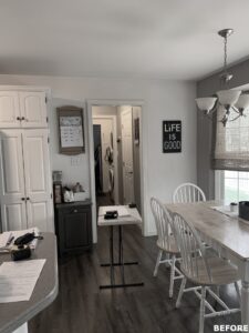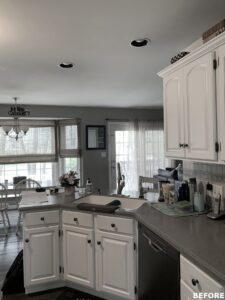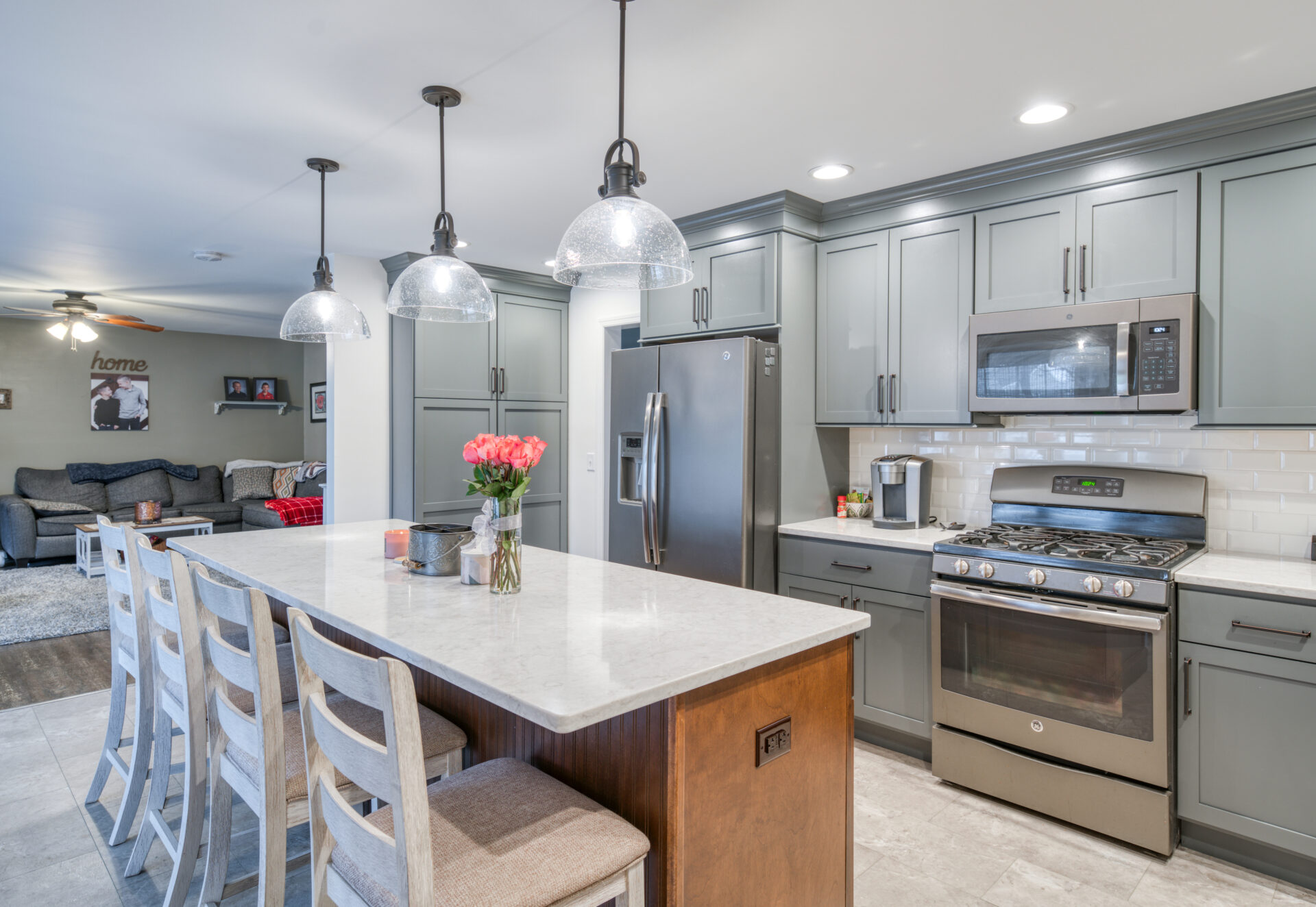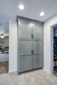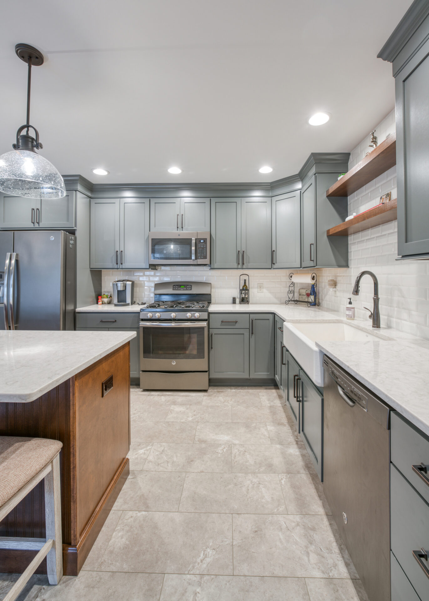 The focal point of this kitchen remodel is the large wooden center island which serves as both prep space and seating. The lighter color palette and new appliances in the space brighten the overall look of the kitchen, and the ceiling-height cabinetry, crown moulding and lighting create an open and airy feel as well. The kitchen area now flows organically into the dining area and an added pantry provides plenty of storage.