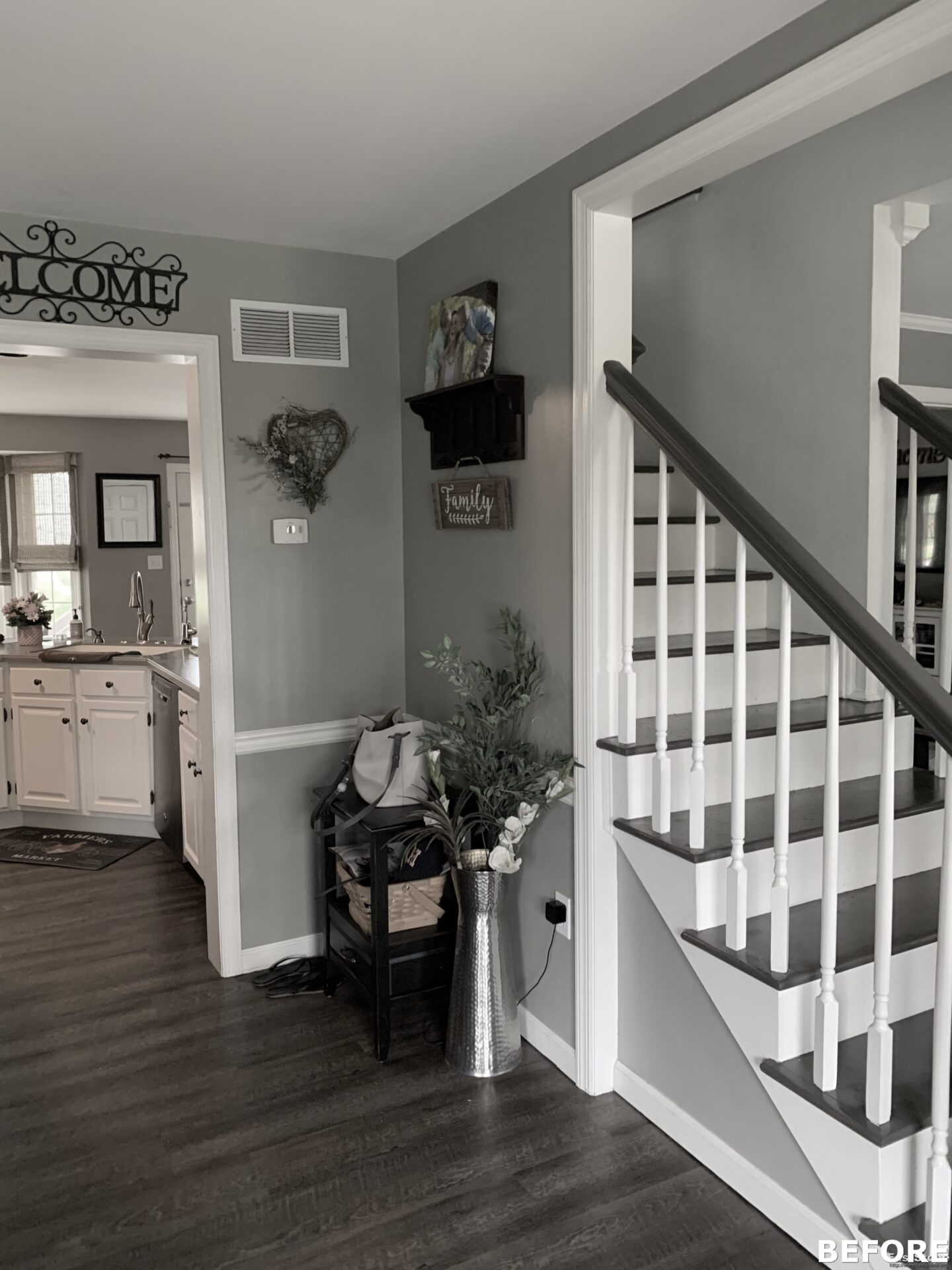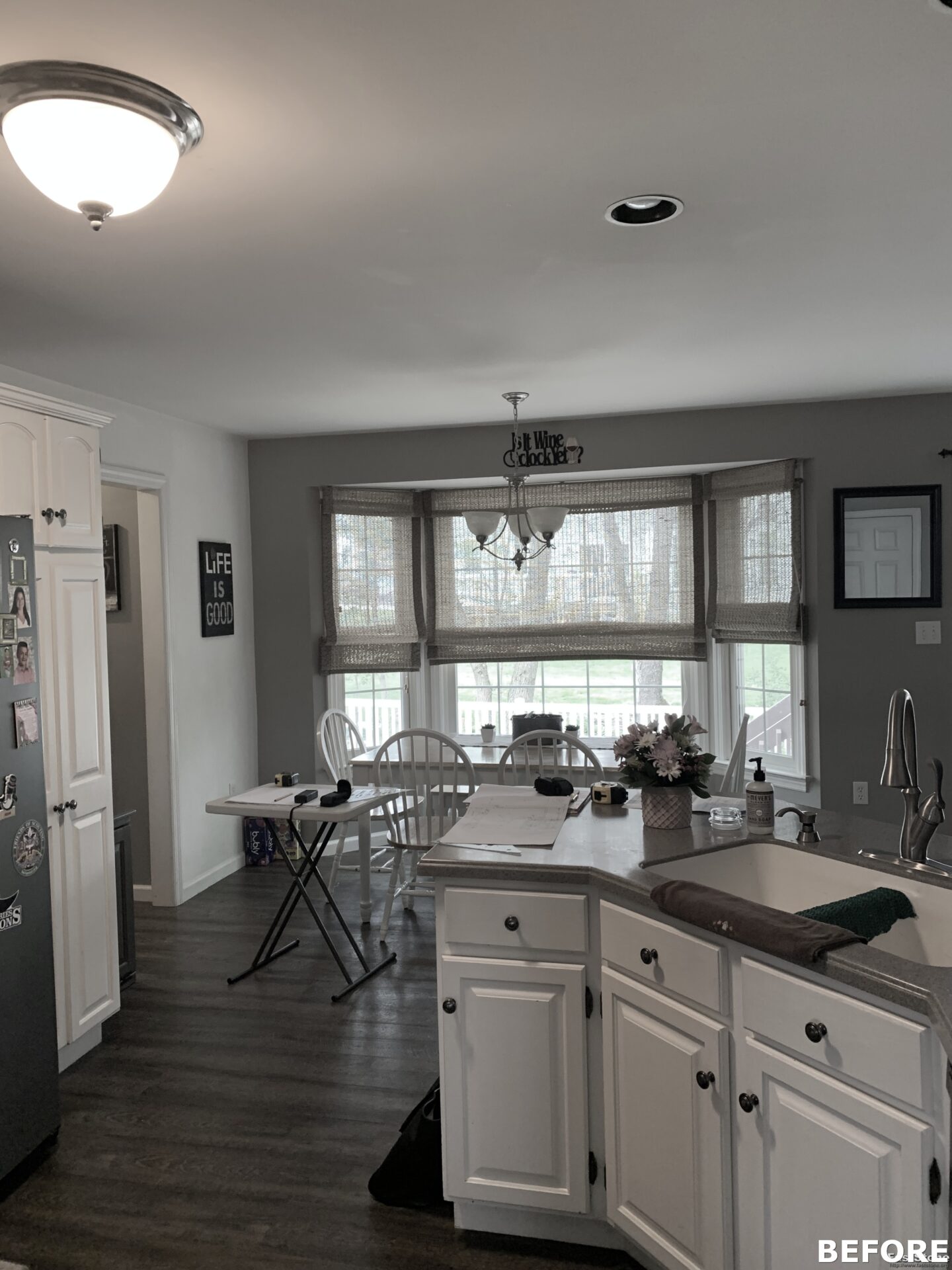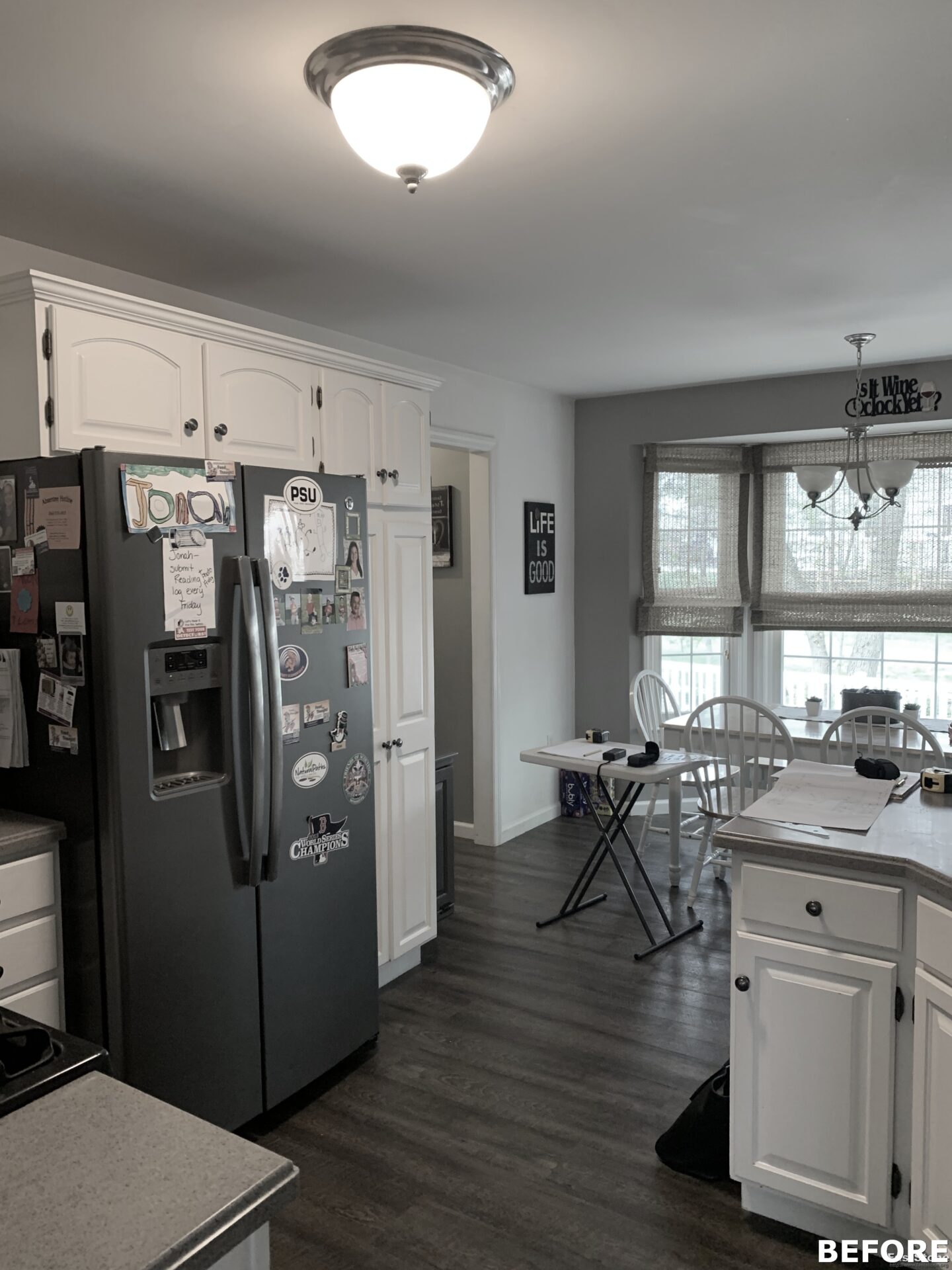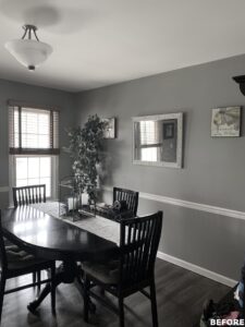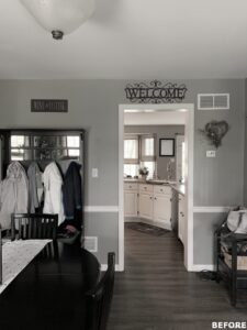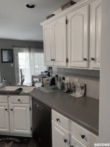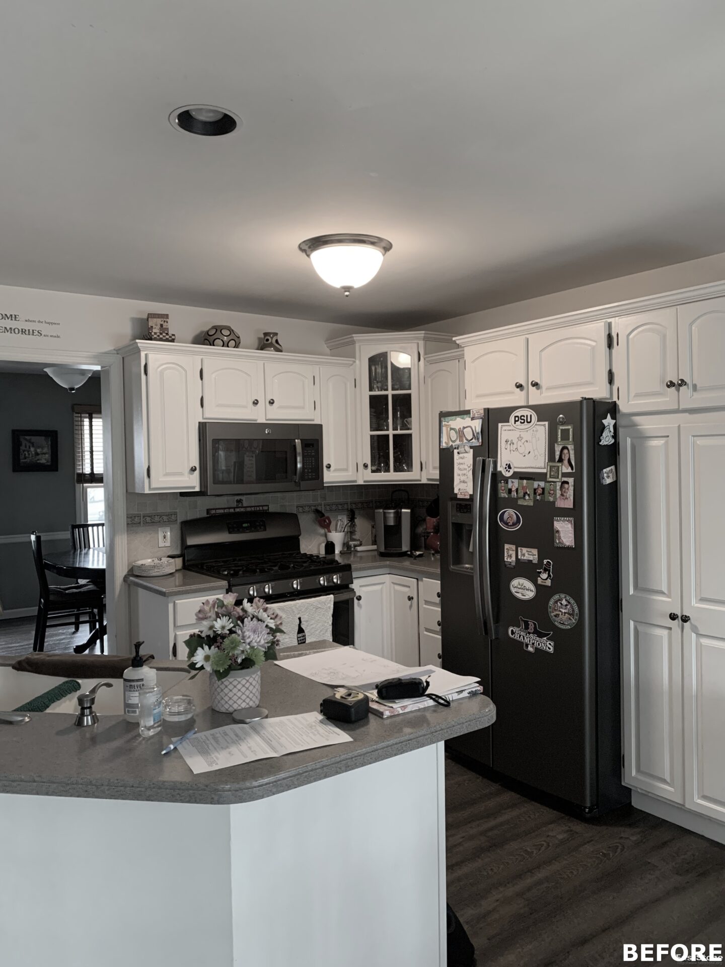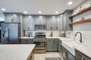 The focal point of this kitchen remodel is the large wooden center island which serves as both prep space and seating. The lighter color palette and new appliances in the space brighten the overall look of the kitchen, and the ceiling-height cabinetry, crown moulding and lighting create an open and airy feel as well. The kitchen area now flows organically into the dining area and an added pantry provides plenty of storage.