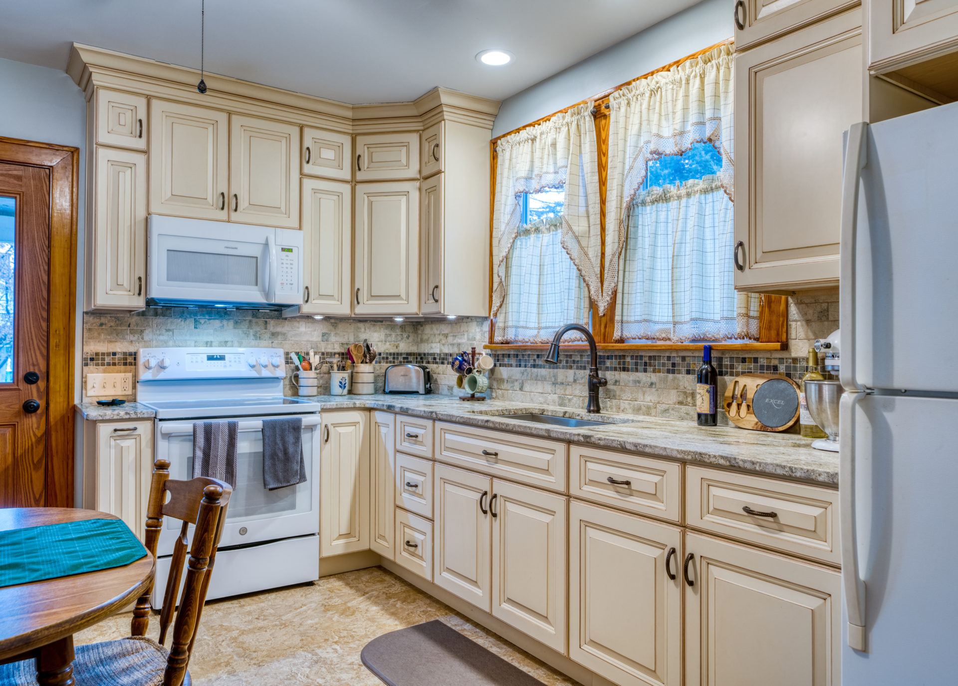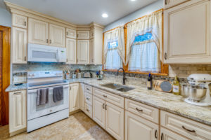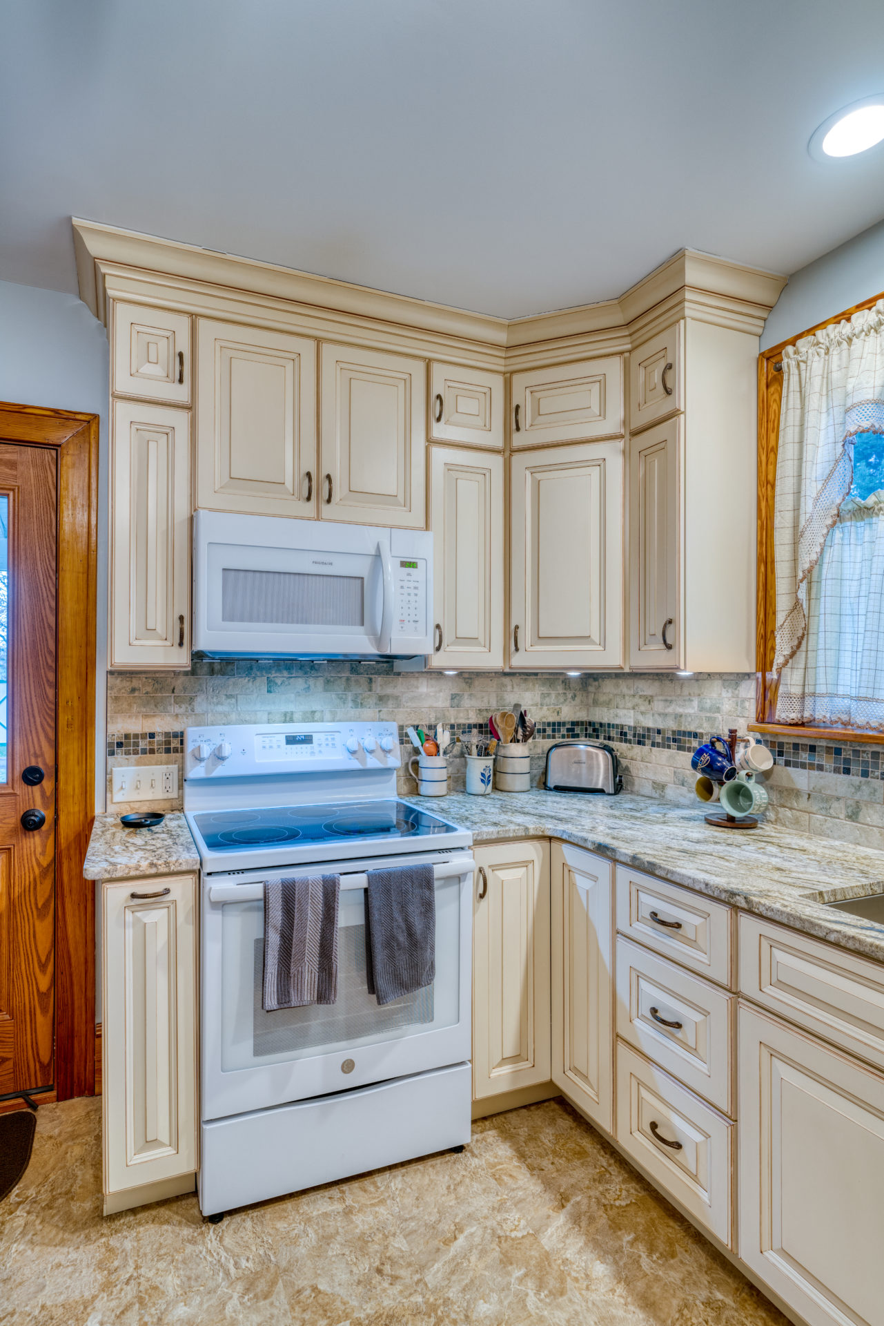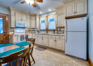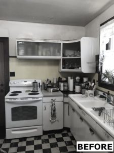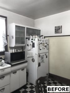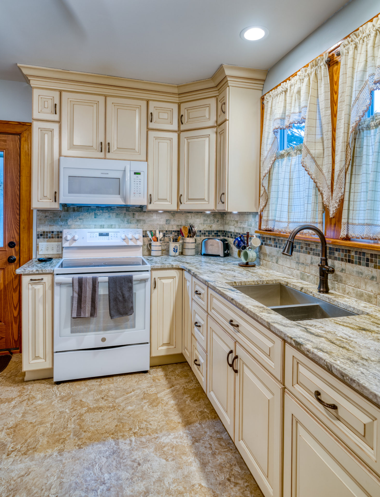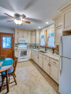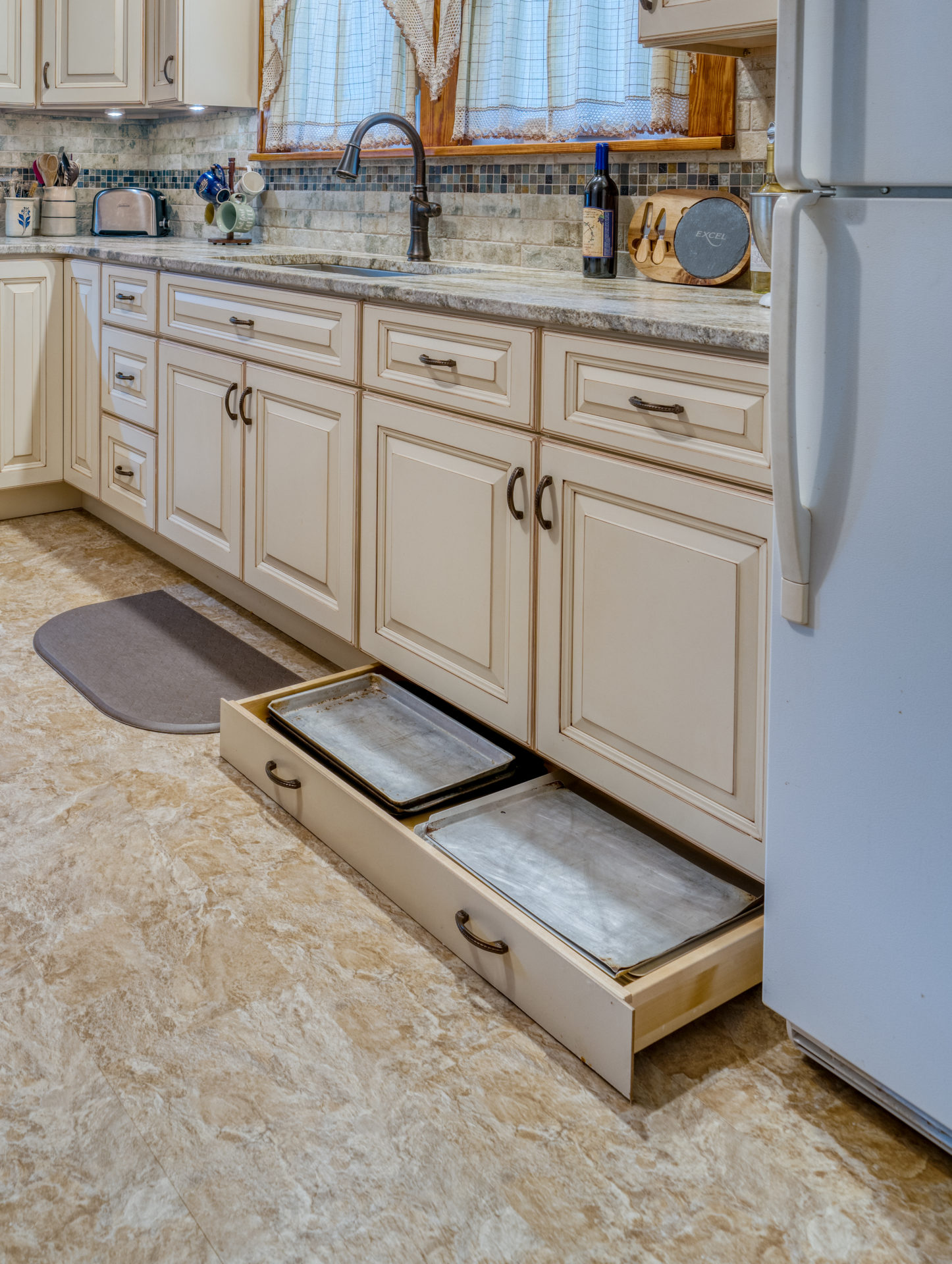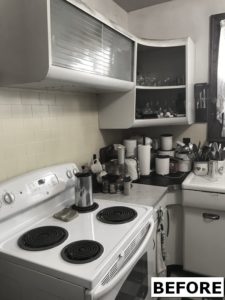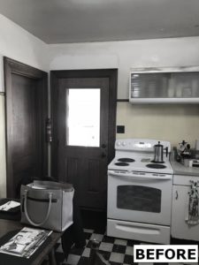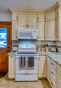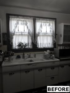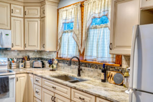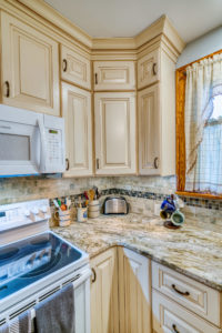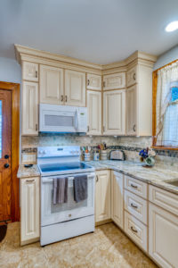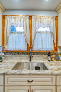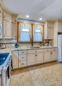 This kitchen remodel utilized the same original footprint of the space, but solved a common dilemma for many home owners… lack of storage space. As you can see from the before pictures, cabinet space was very limited in the original kitchen. This in turn affected the counter work space as the counter space was also being used for storage. In designing the remodel, upper and lower cabinetry was maximized to accommodate all the home owners’ storage needs. The new cabinets extend to the ceiling, which also makes the kitchen feel larger and the custom cabinetry, granite countertops, and stone backsplash further update and elevate this new culinary space that now has a storage place for everything – including a large lower drawer for holding sheet pans and cookie sheets.