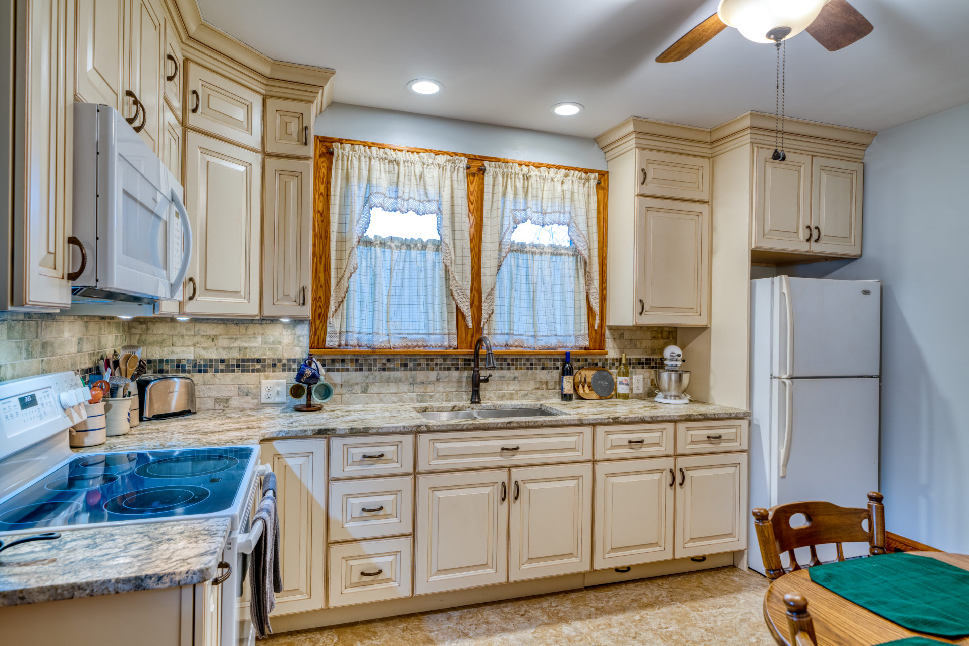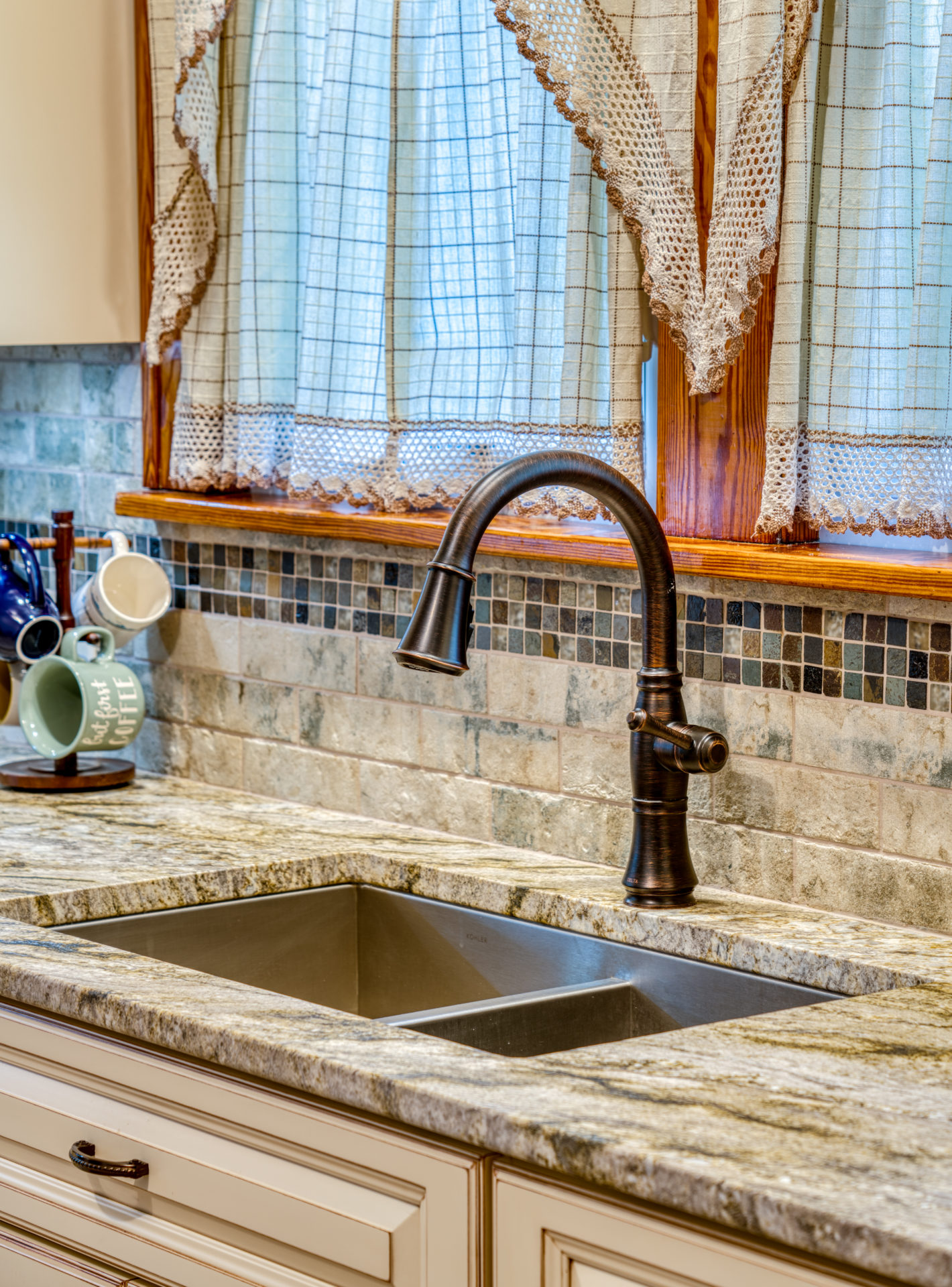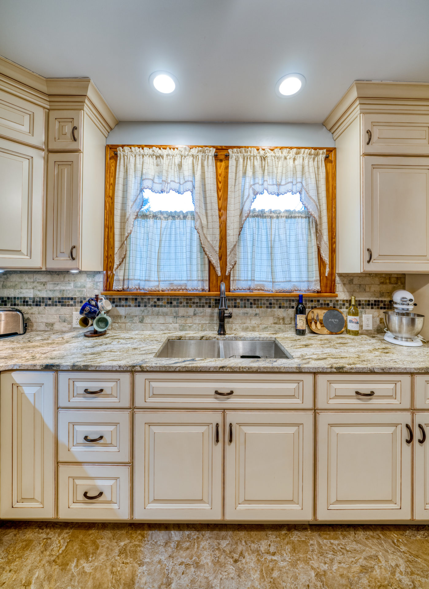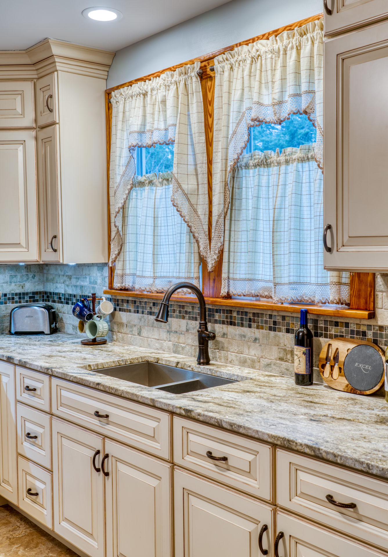 This kitchen remodel utilized the same original footprint of the space, but solved a common dilemma for many home owners… lack of storage space. As you can see from the before pictures, cabinet space was very limited in the original kitchen. This in turn affected the counter work space as the counter space was also being used for storage. In designing the remodel, upper and lower cabinetry was maximized to accommodate all the home owners’ storage needs. The new cabinets extend to the ceiling, which also makes the kitchen feel larger and the custom cabinetry, granite countertops, and stone backsplash further update and elevate this new culinary space that now has a storage place for everything – including a large lower drawer for holding sheet pans and cookie sheets.