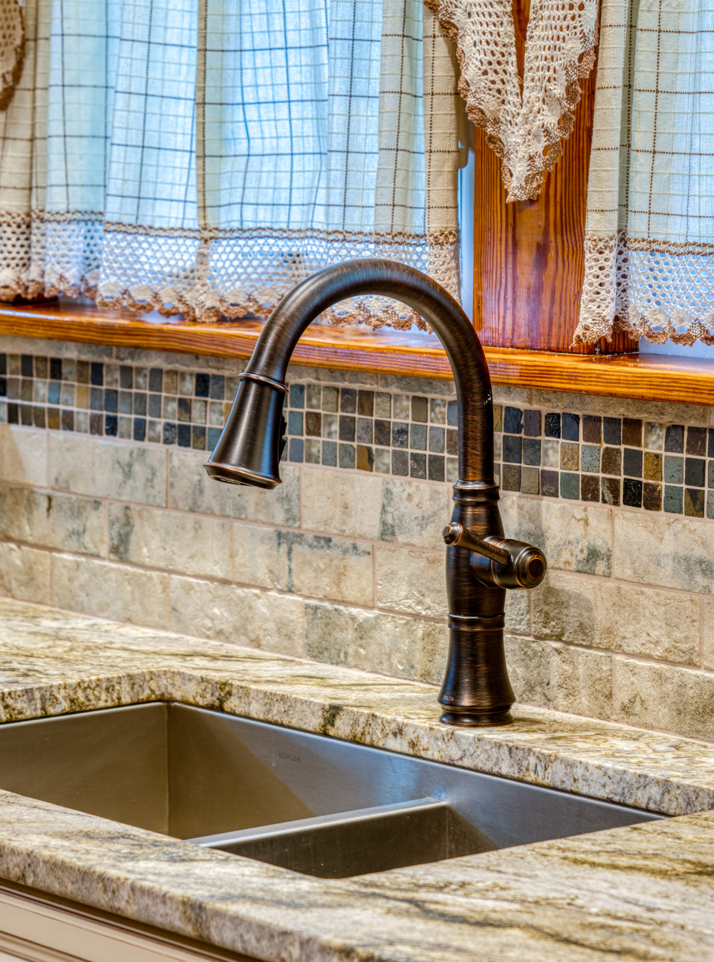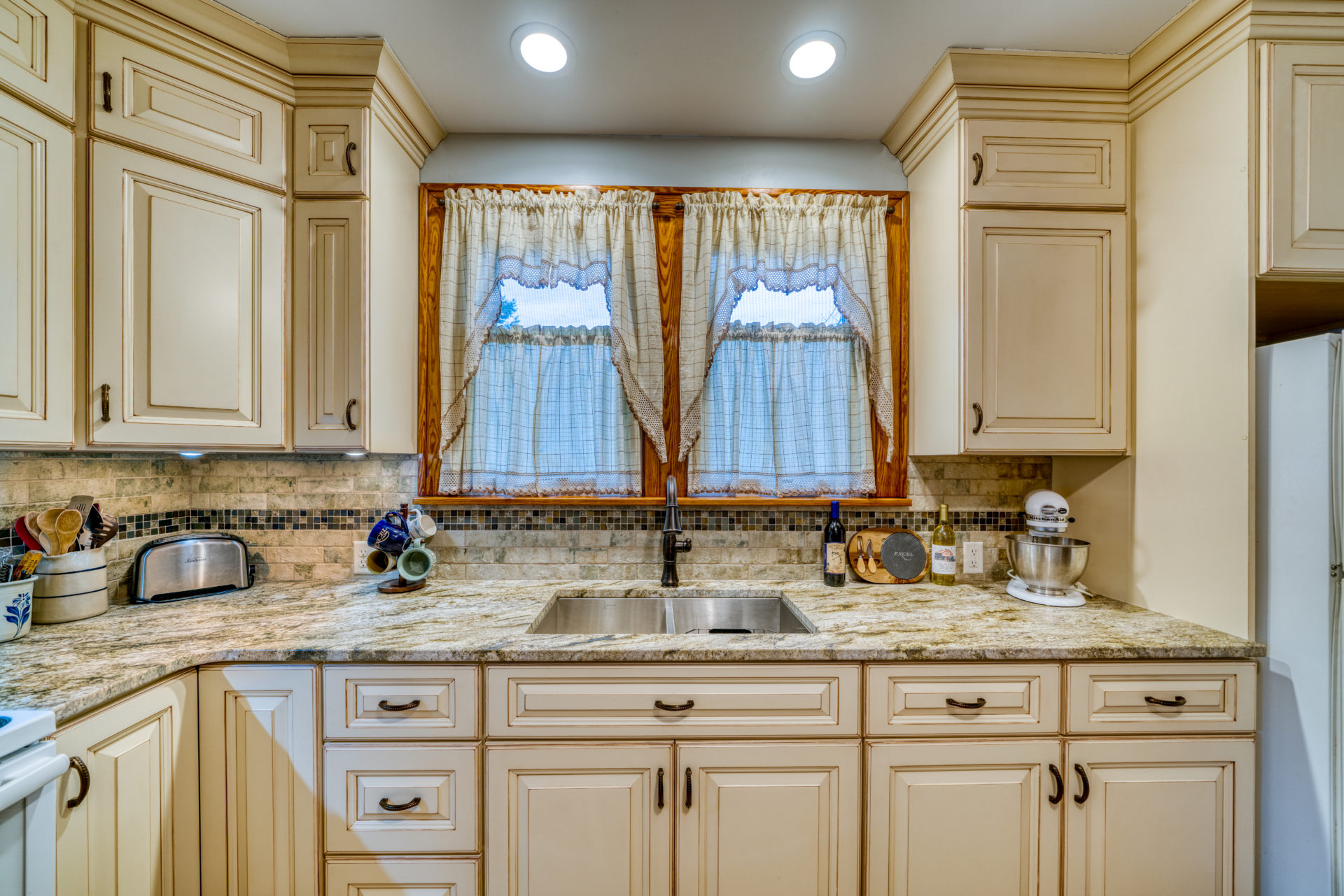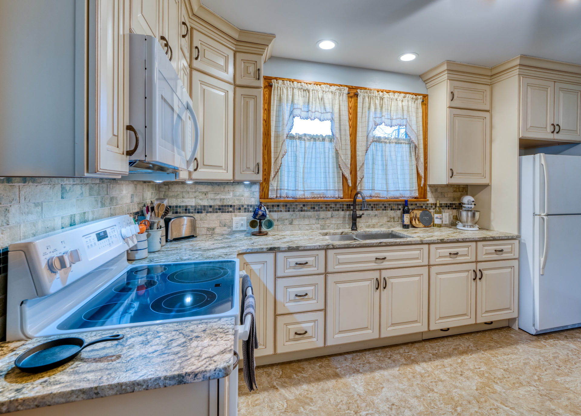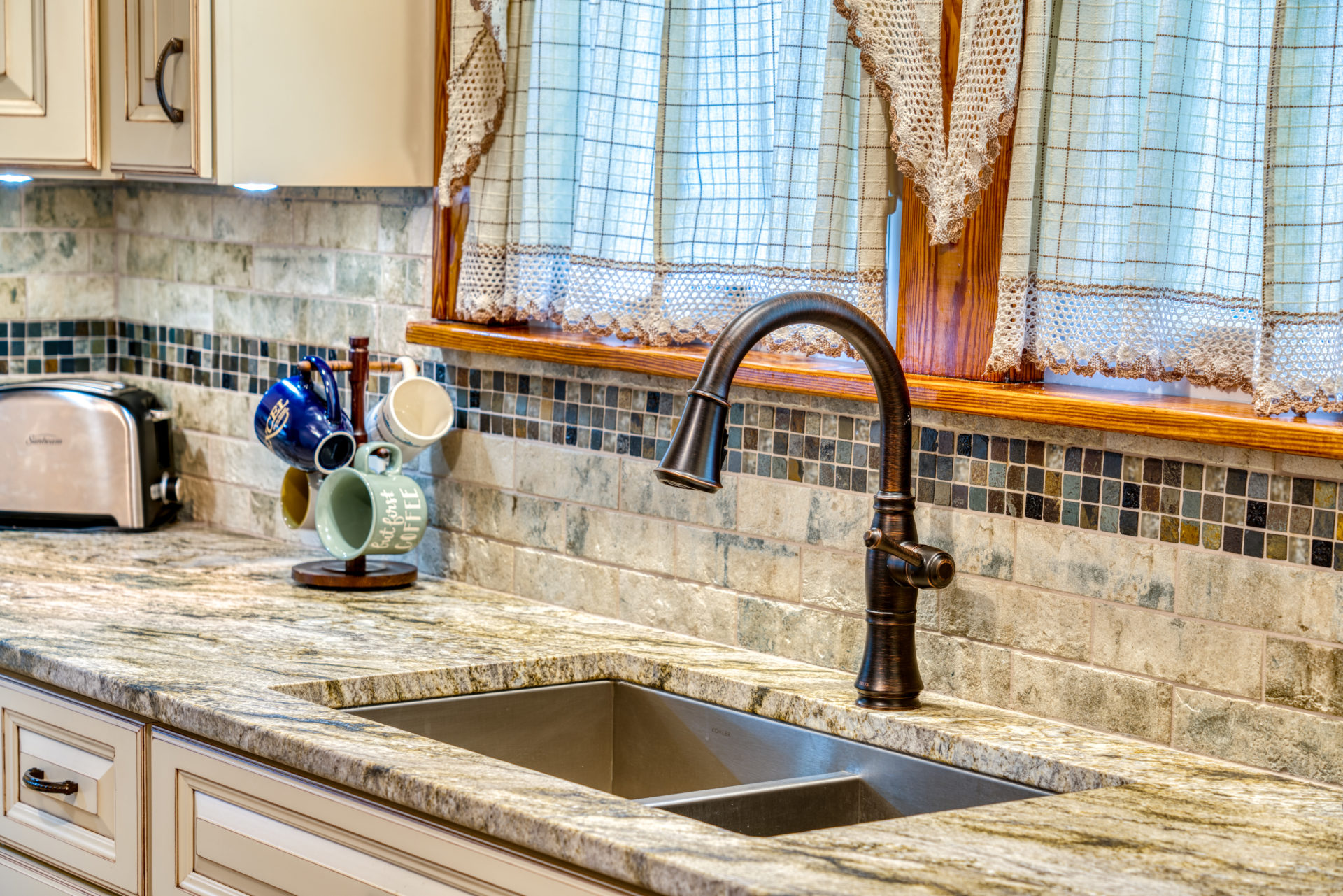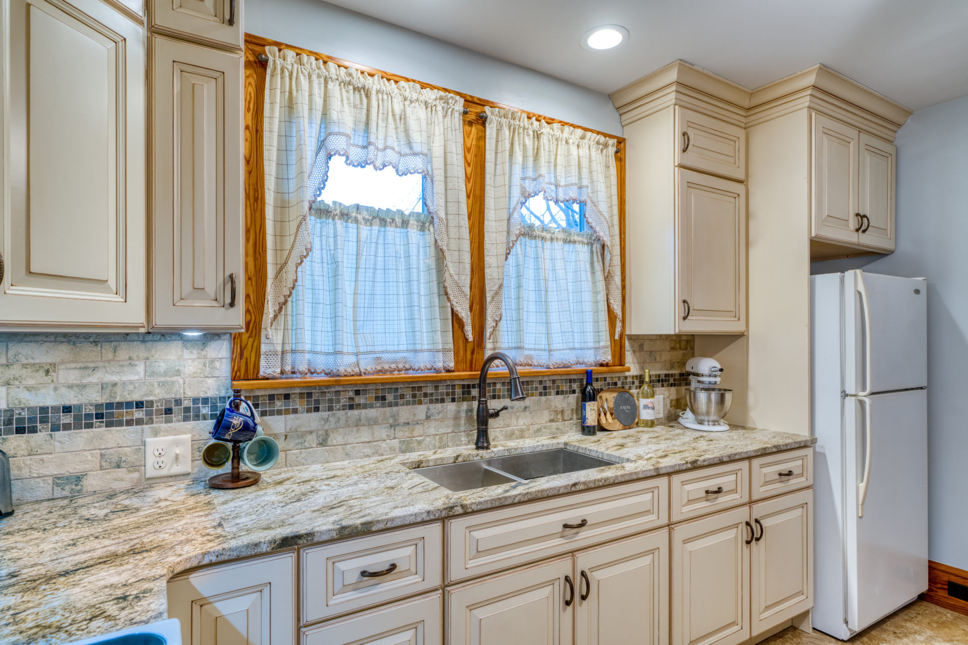 This kitchen remodel utilized the same original footprint of the space, but solved a common dilemma for many home owners… lack of storage space. As you can see from the before pictures, cabinet space was very limited in the original kitchen. This in turn affected the counter work space as the counter space was also being used for storage. In designing the remodel, upper and lower cabinetry was maximized to accommodate all the home owners’ storage needs. The new cabinets extend to the ceiling, which also makes the kitchen feel larger and the custom cabinetry, granite countertops, and stone backsplash further update and elevate this new culinary space that now has a storage place for everything – including a large lower drawer for holding sheet pans and cookie sheets.