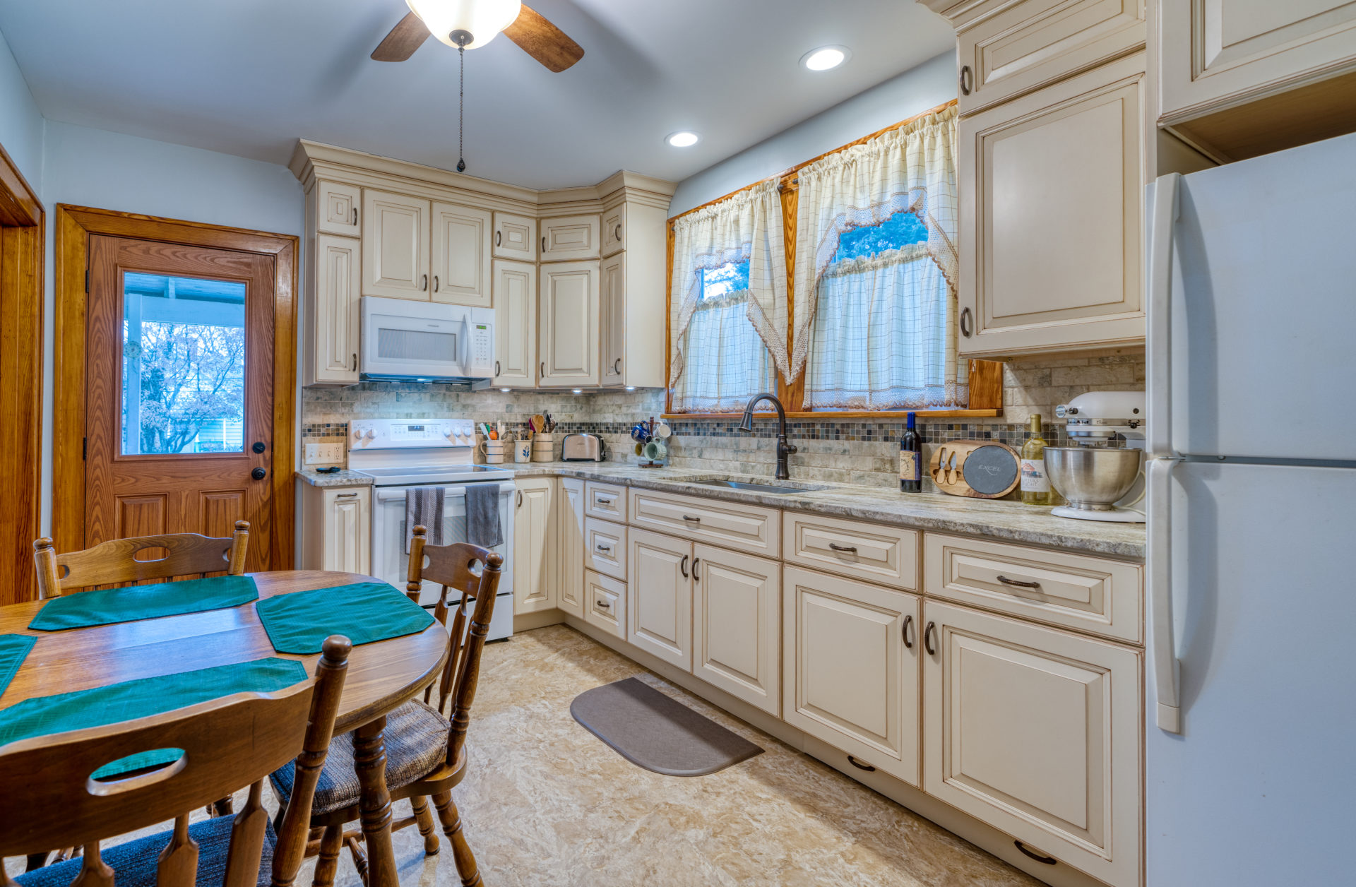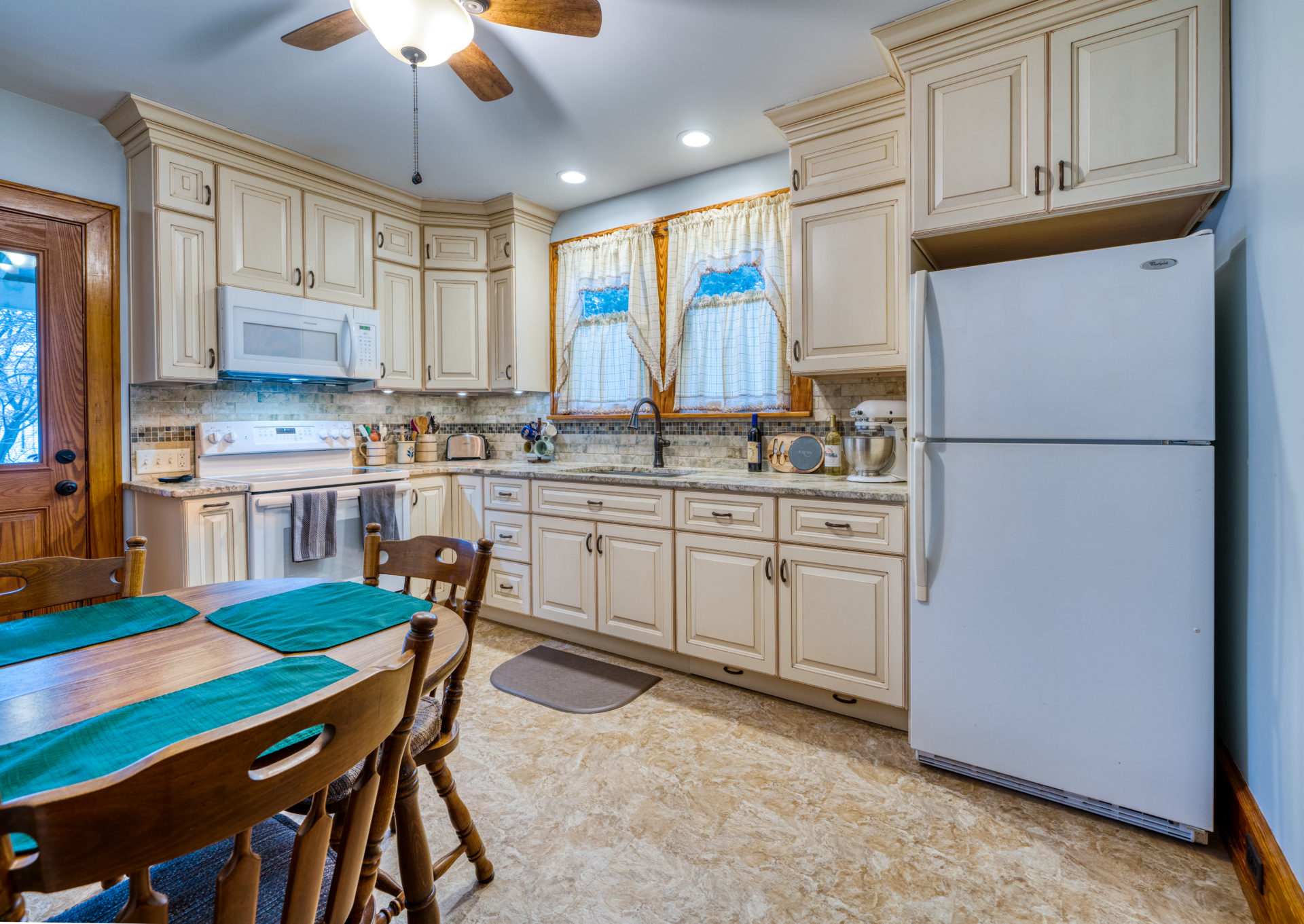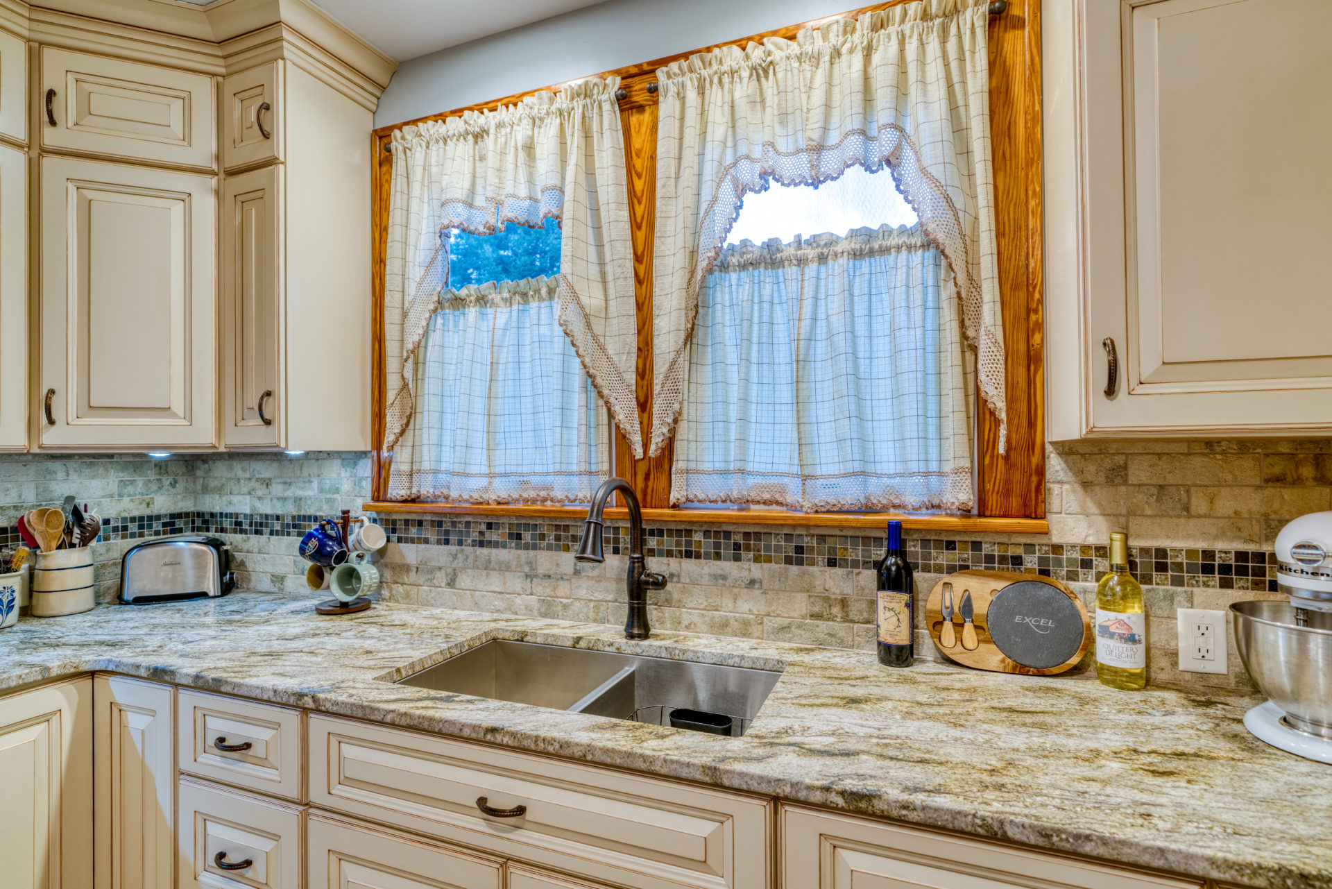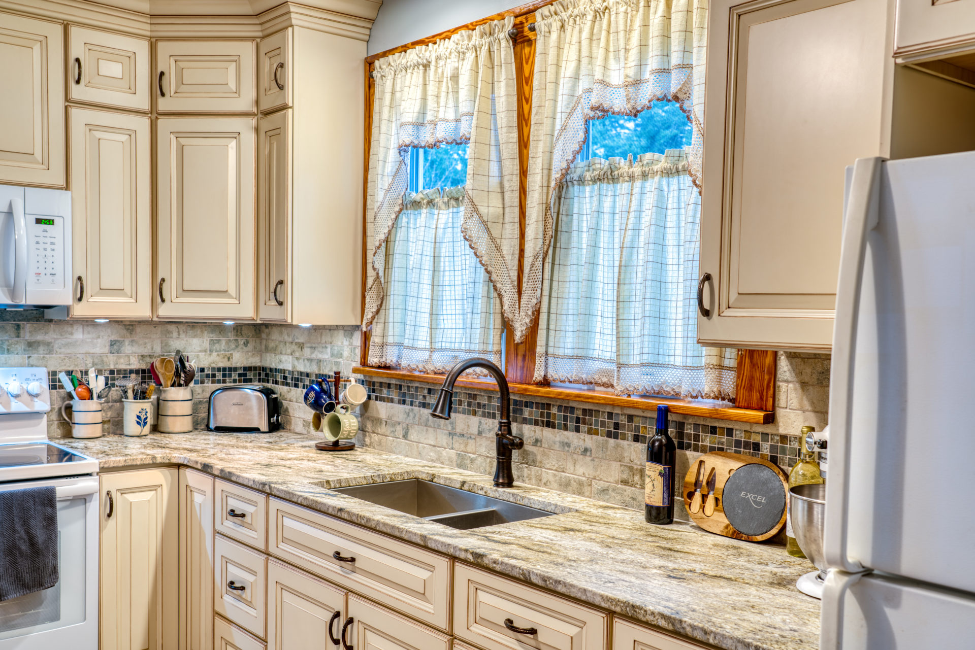 This kitchen remodel utilized the same original footprint of the space, but solved a common dilemma for many home owners… lack of storage space. As you can see from the before pictures, cabinet space was very limited in the original kitchen. This in turn affected the counter work space as the counter space was also being used for storage. In designing the remodel, upper and lower cabinetry was maximized to accommodate all the home owners’ storage needs. The new cabinets extend to the ceiling, which also makes the kitchen feel larger and the custom cabinetry, granite countertops, and stone backsplash further update and elevate this new culinary space that now has a storage place for everything – including a large lower drawer for holding sheet pans and cookie sheets.