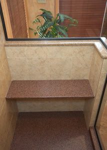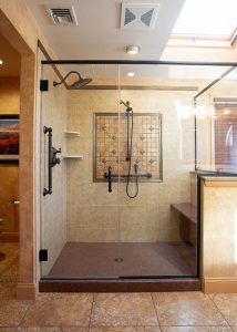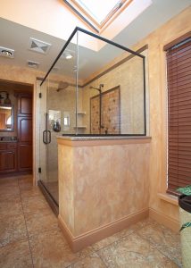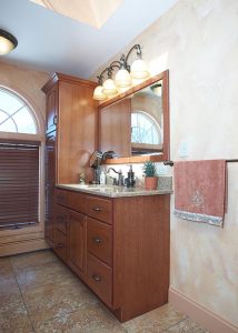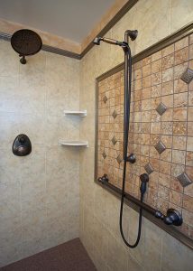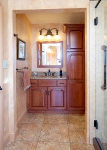 This primary bathroom retreat makes the most of the natural light and window feature, and the rich woods and earth tones create a welcoming primary bathroom retreat.