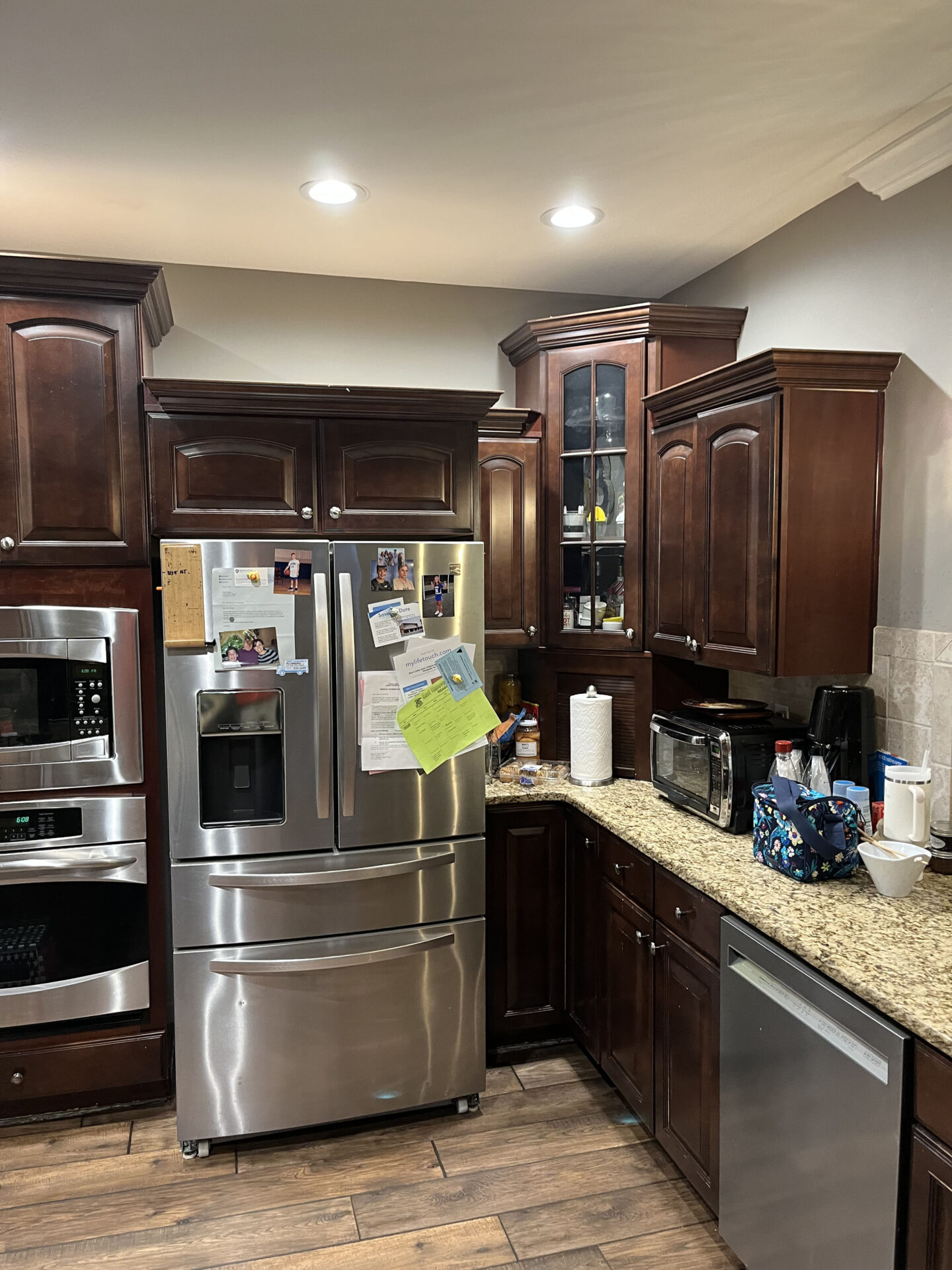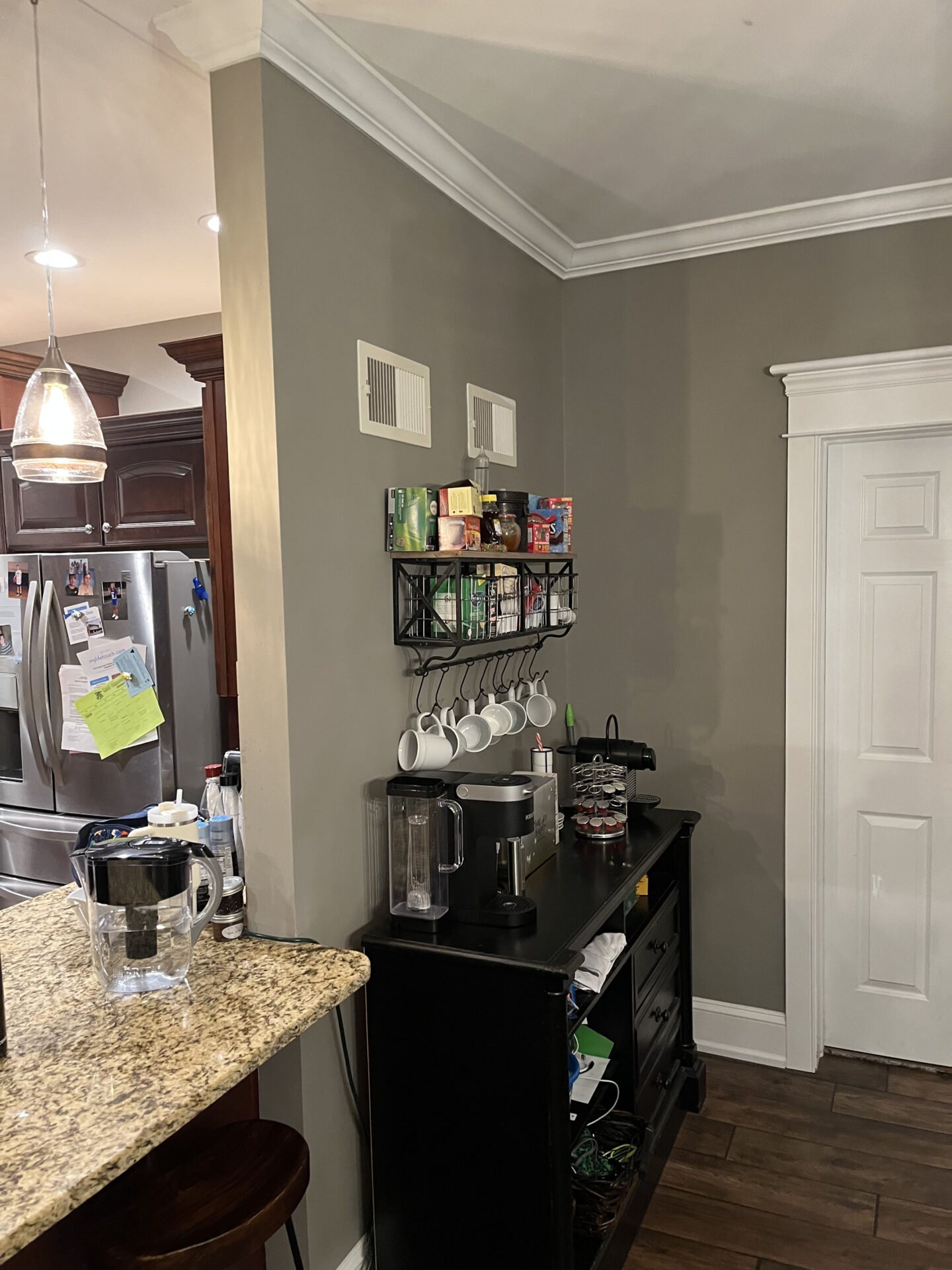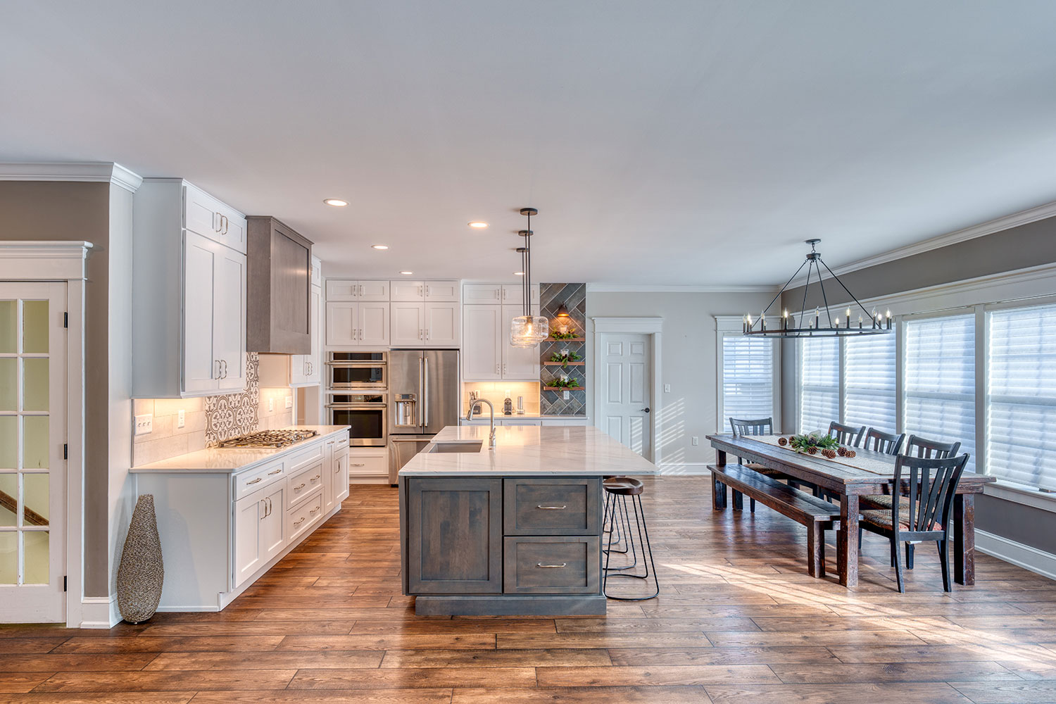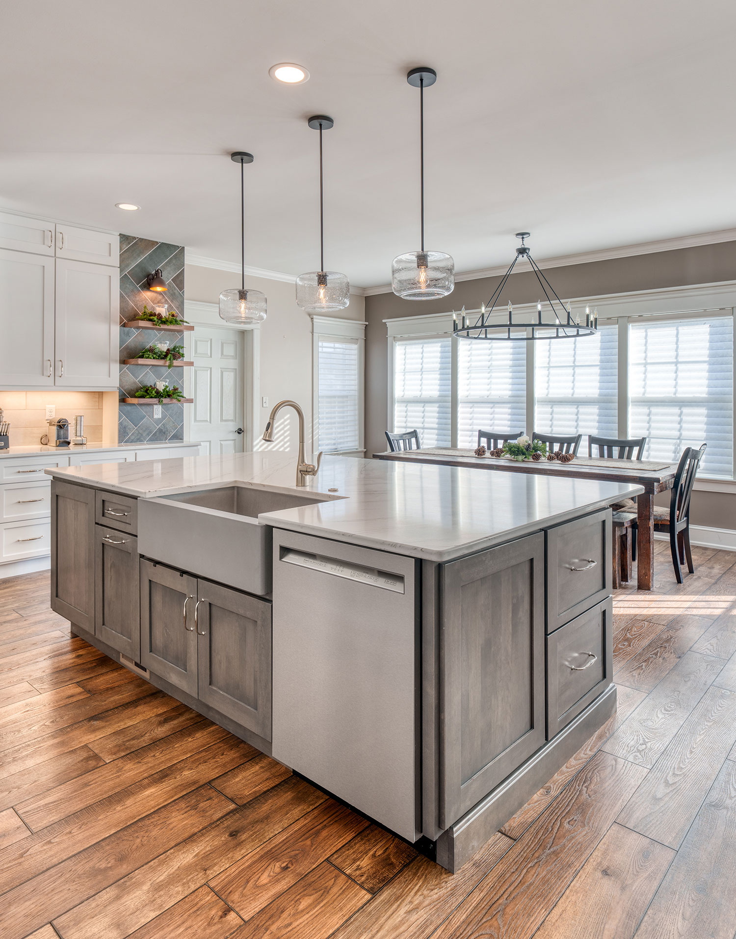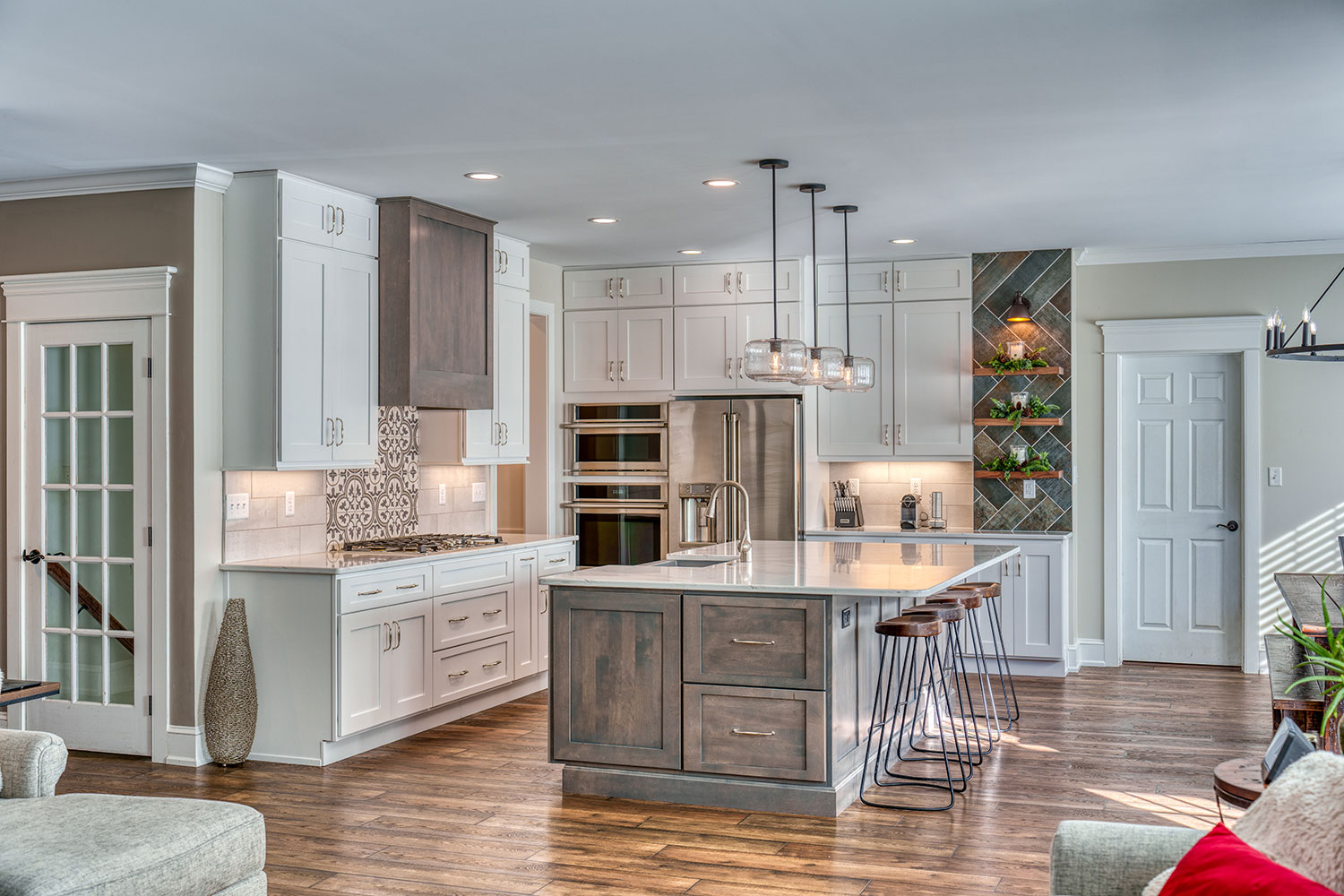 A Modern Rustic Kitchen Renovation combines the warmth and charm of rustic elements with sleek, contemporary design features. It features four bar stools, wooden shelves, a coffee bar, and elegant tile behind the stove.