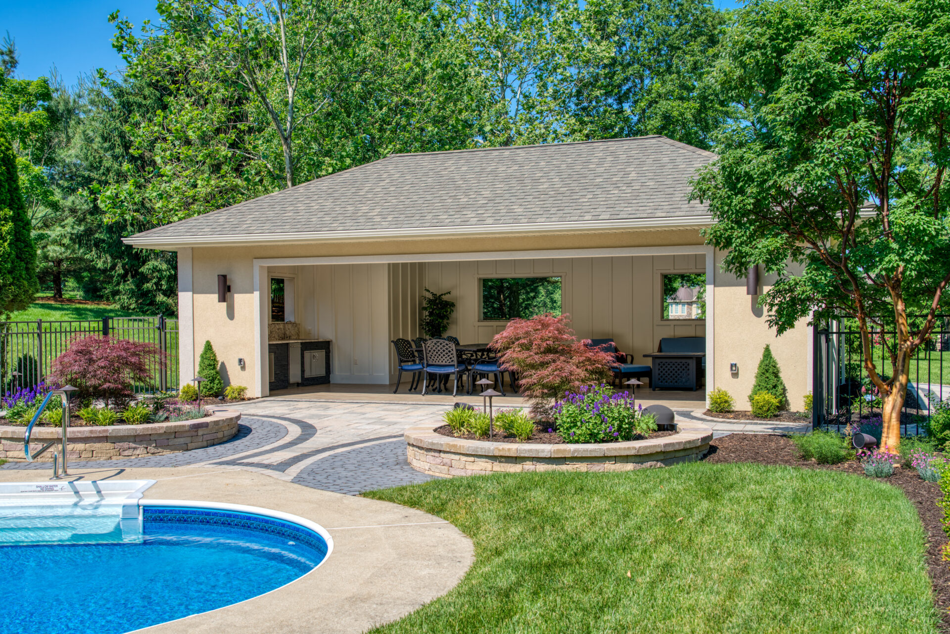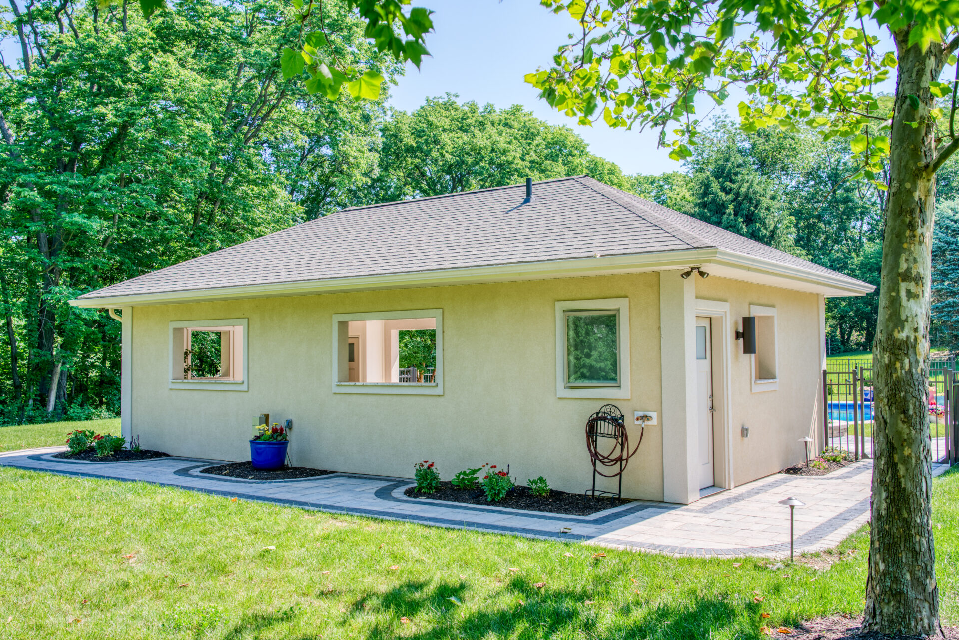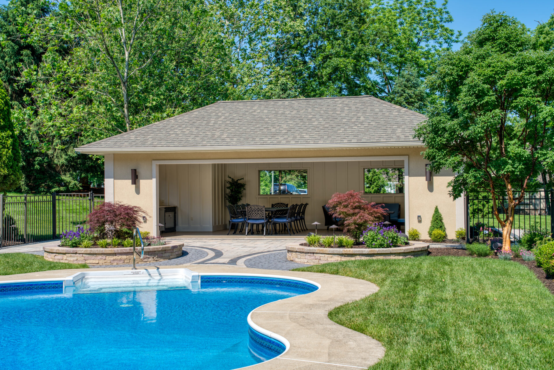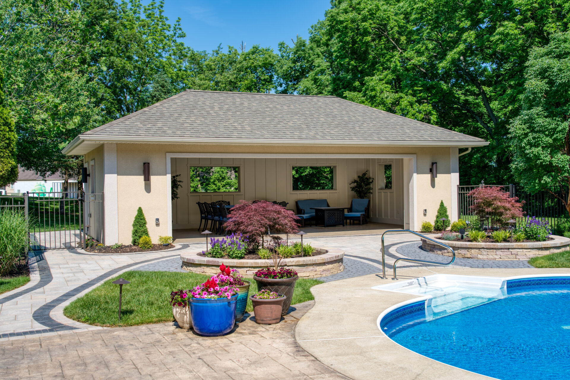Check out this custom design and build poolhouse complete with bathroom, kitchen area and dining space. Absolutely paradise for relaxing and entertaining!