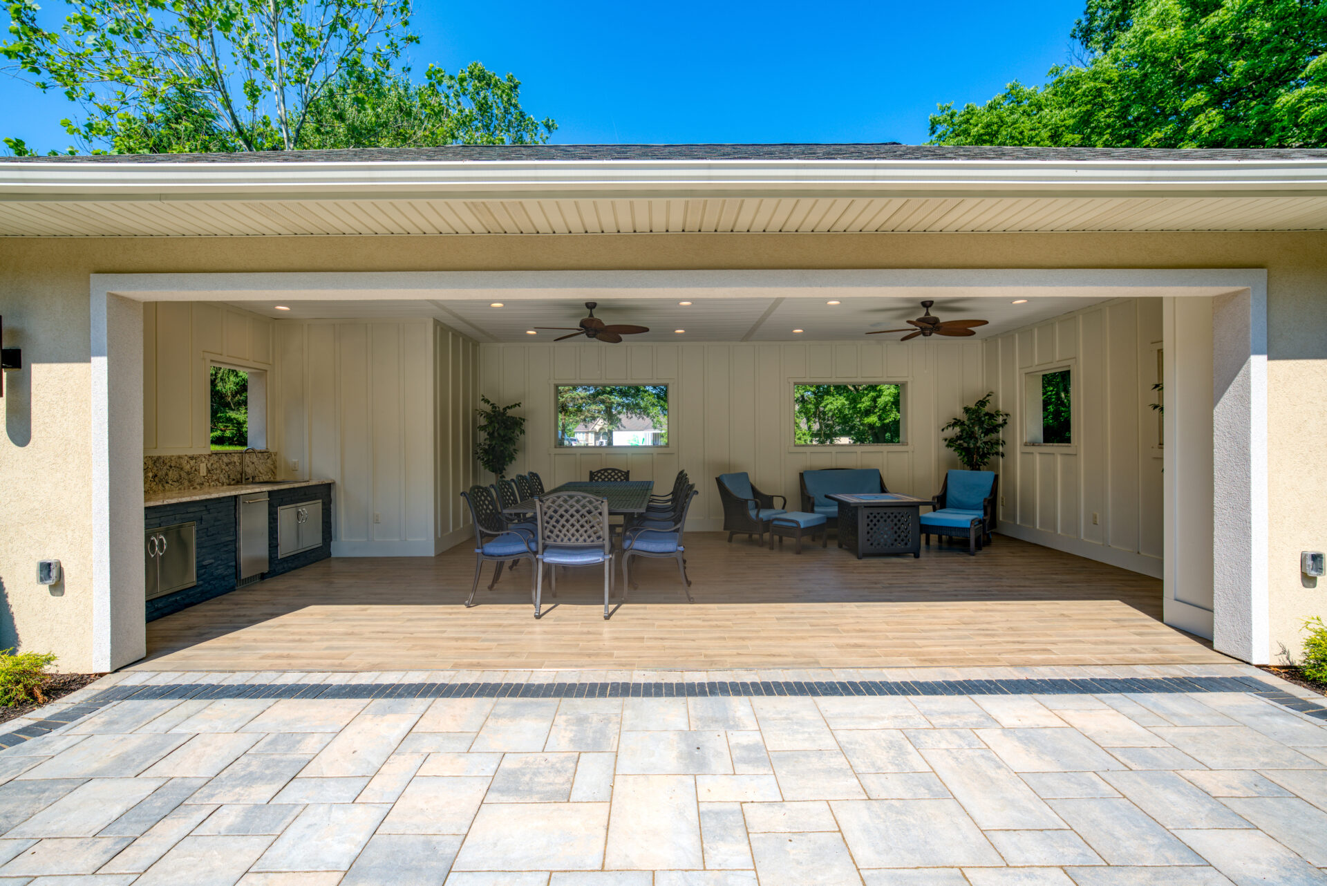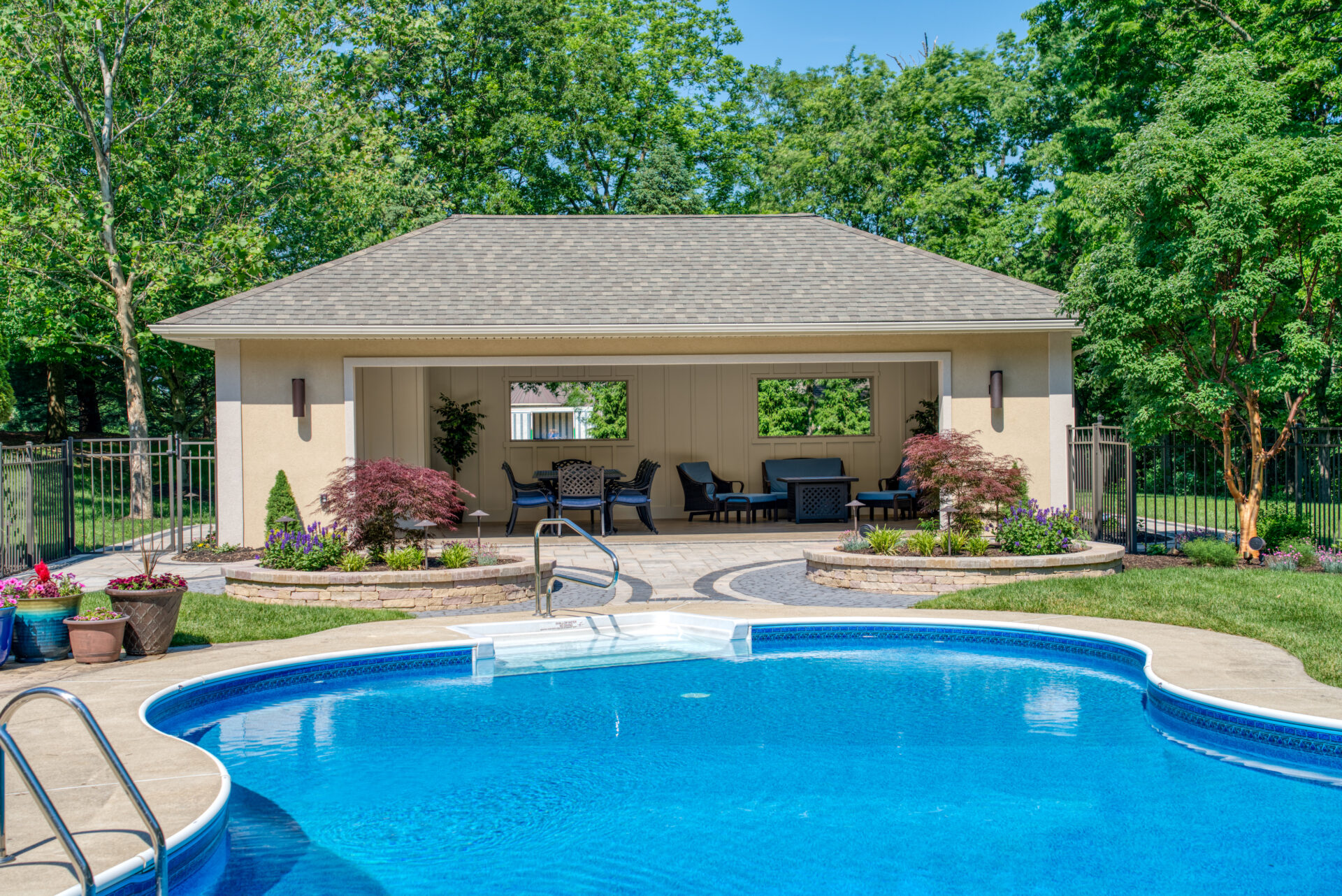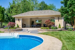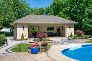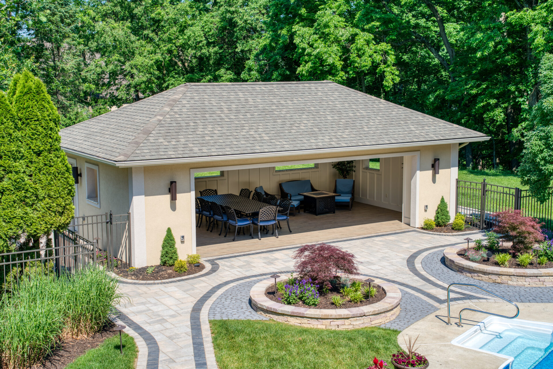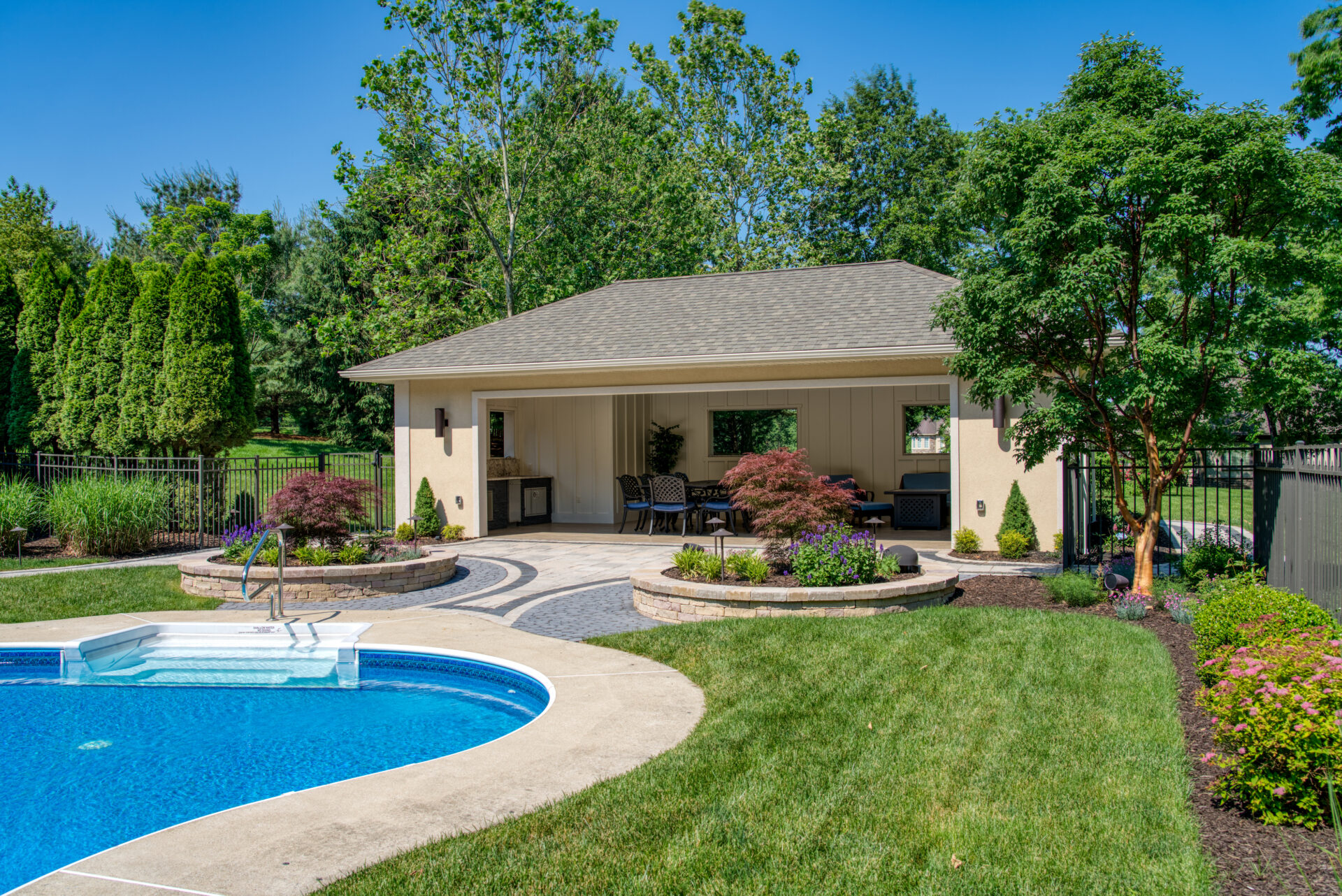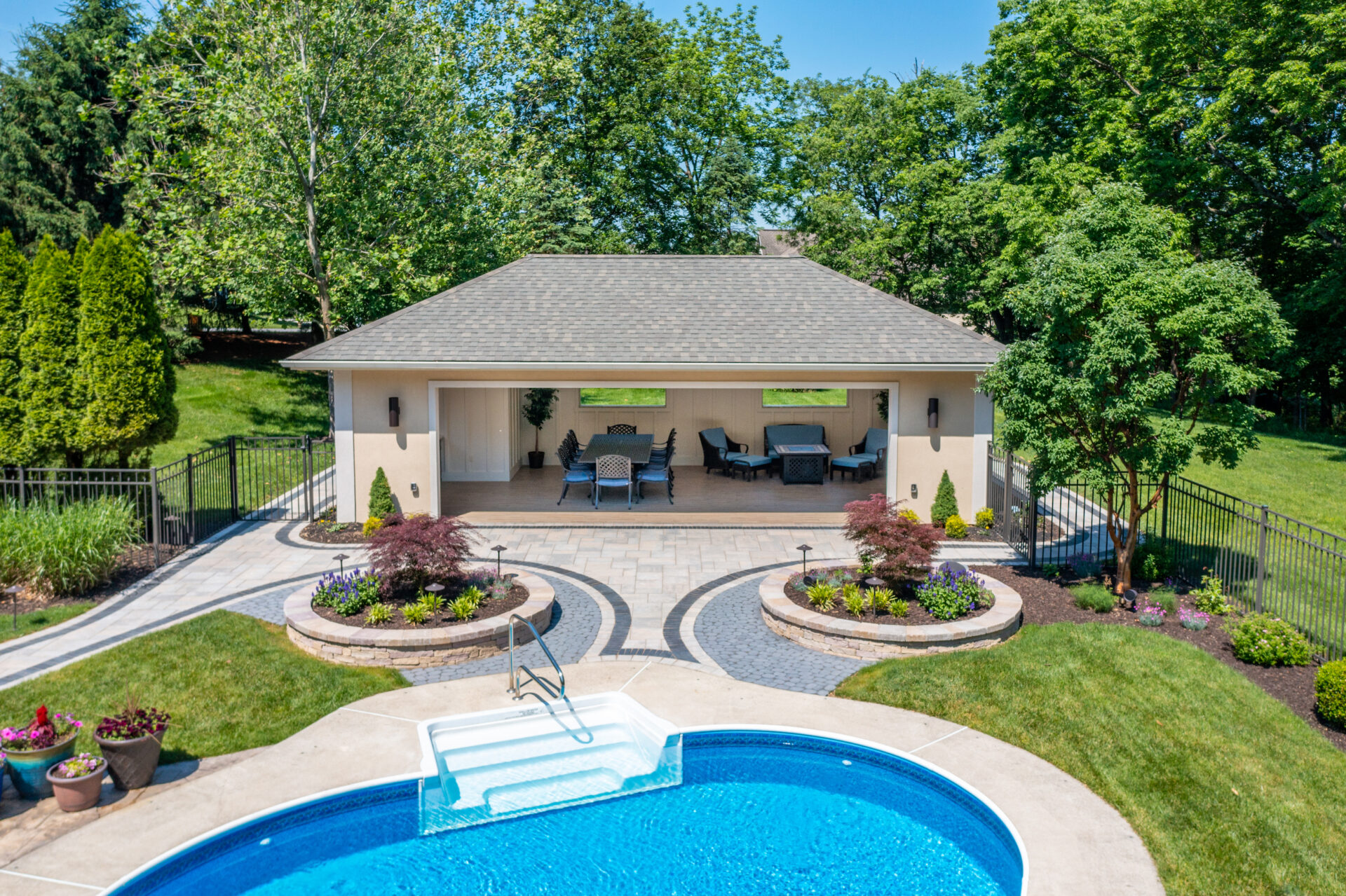 Check out this custom design and build poolhouse complete with bathroom, kitchen area and dining space. Absolutely paradise for relaxing and entertaining!