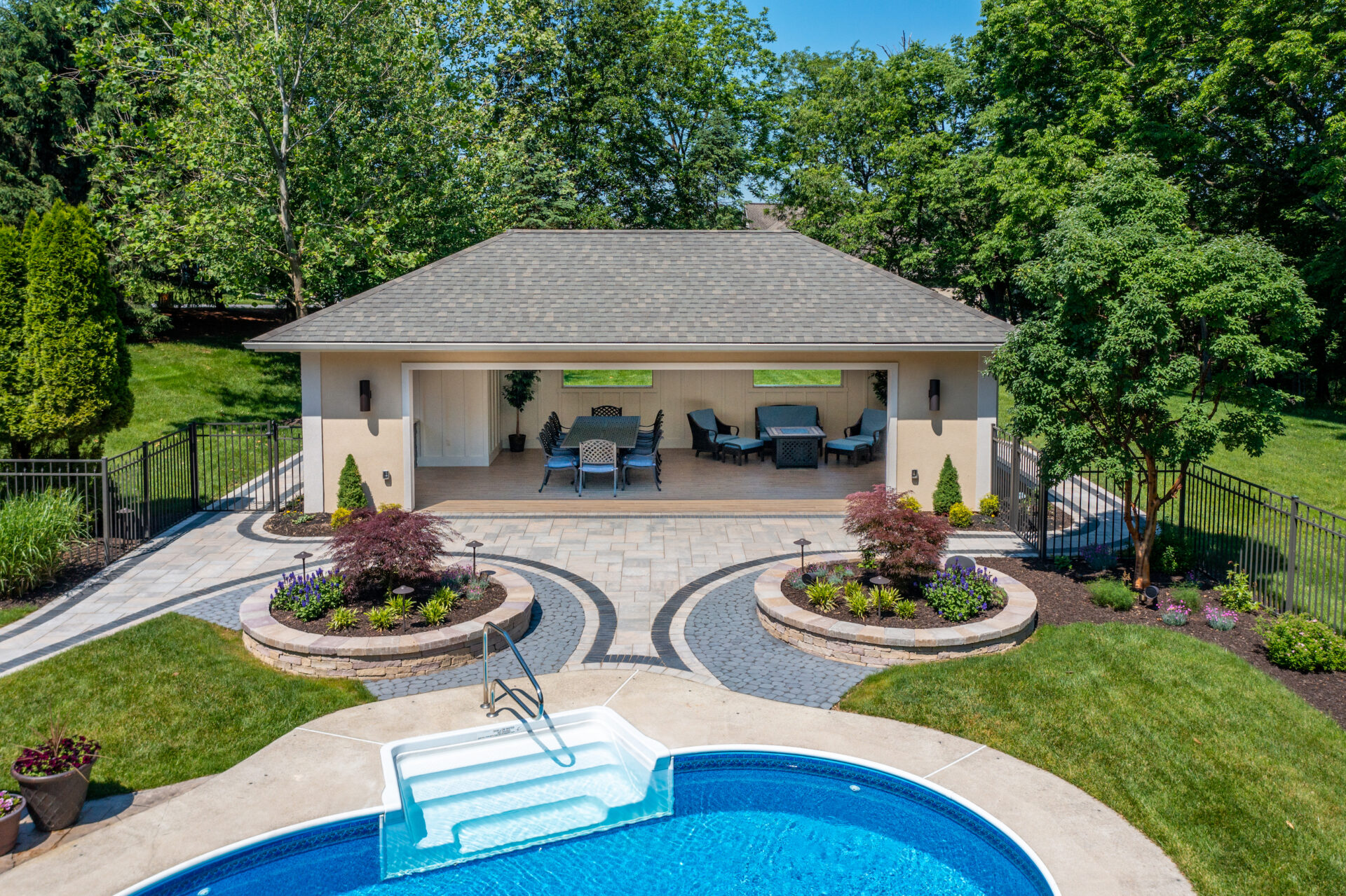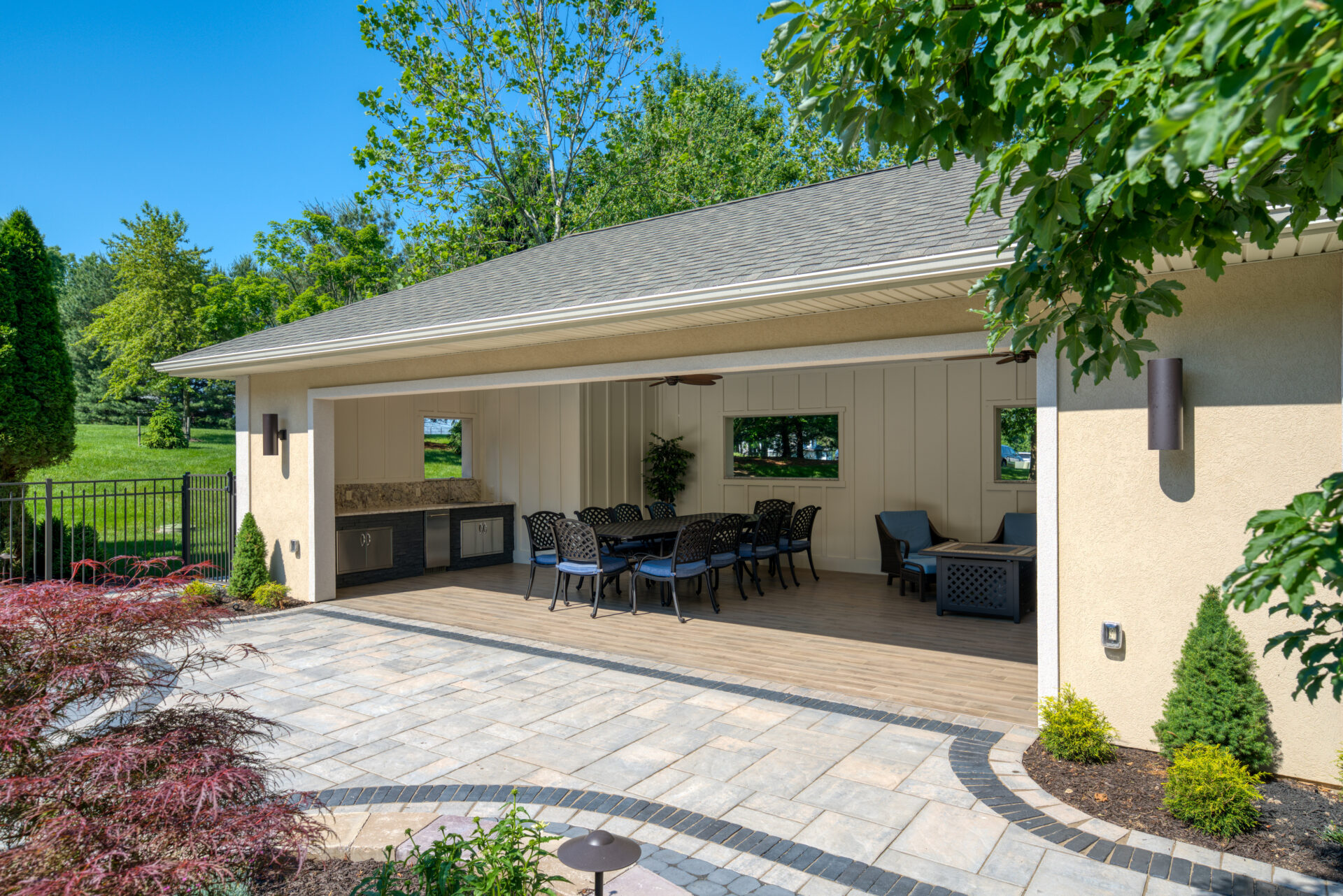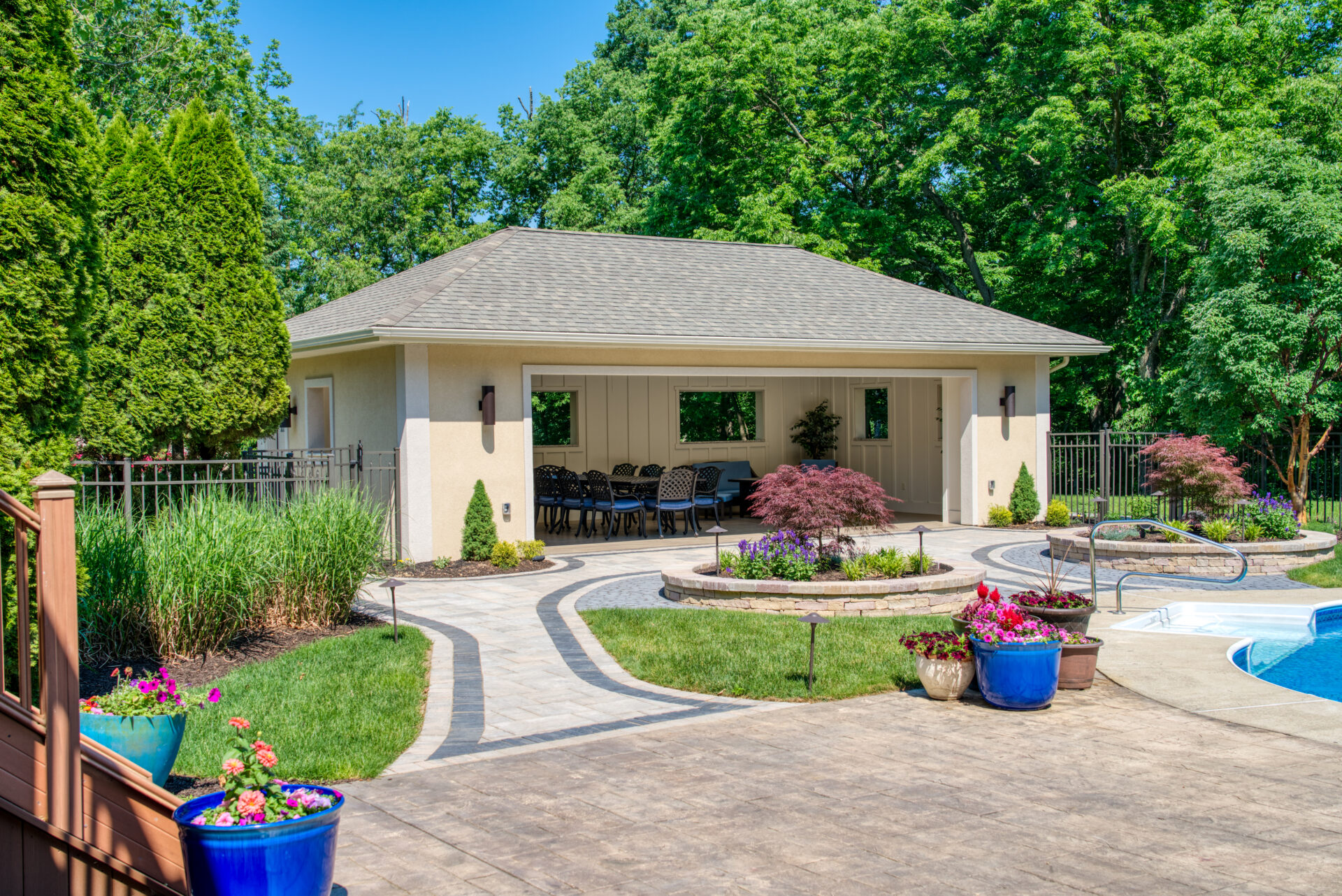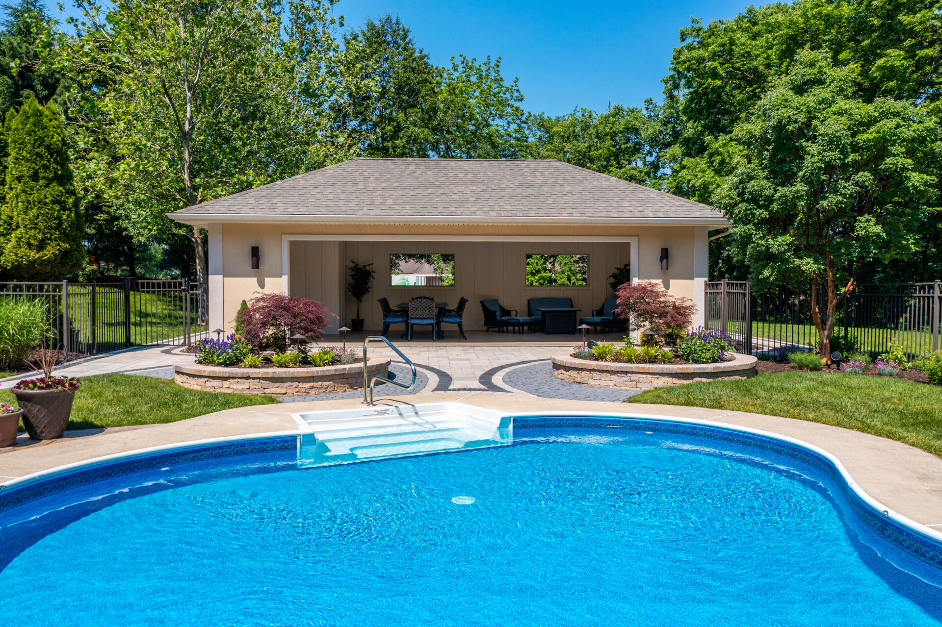 Check out this custom design and build poolhouse complete with bathroom, kitchen area and dining space. Absolutely paradise for relaxing and entertaining!