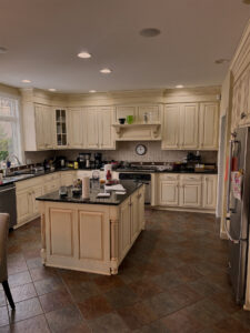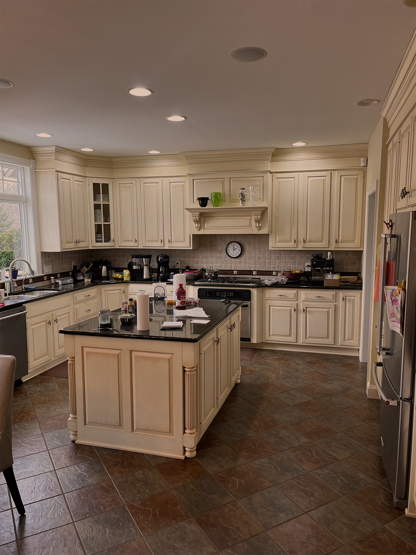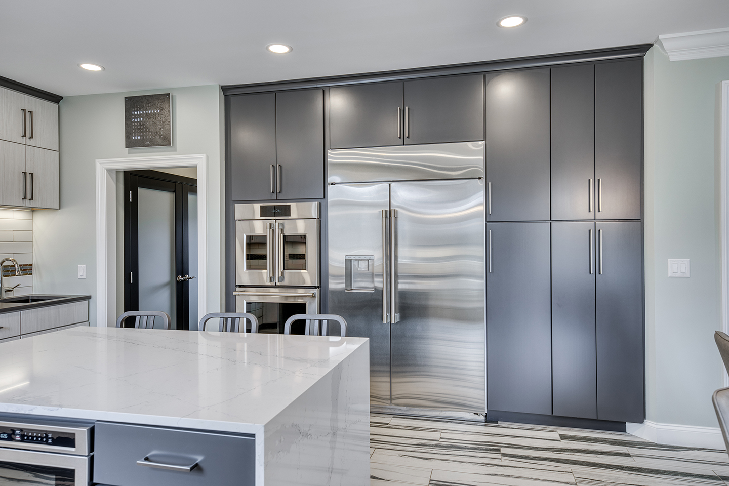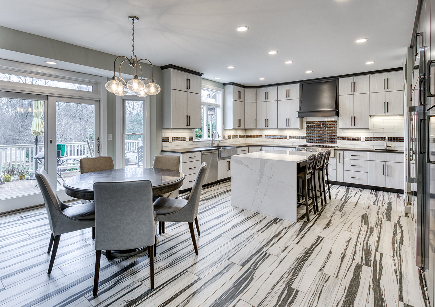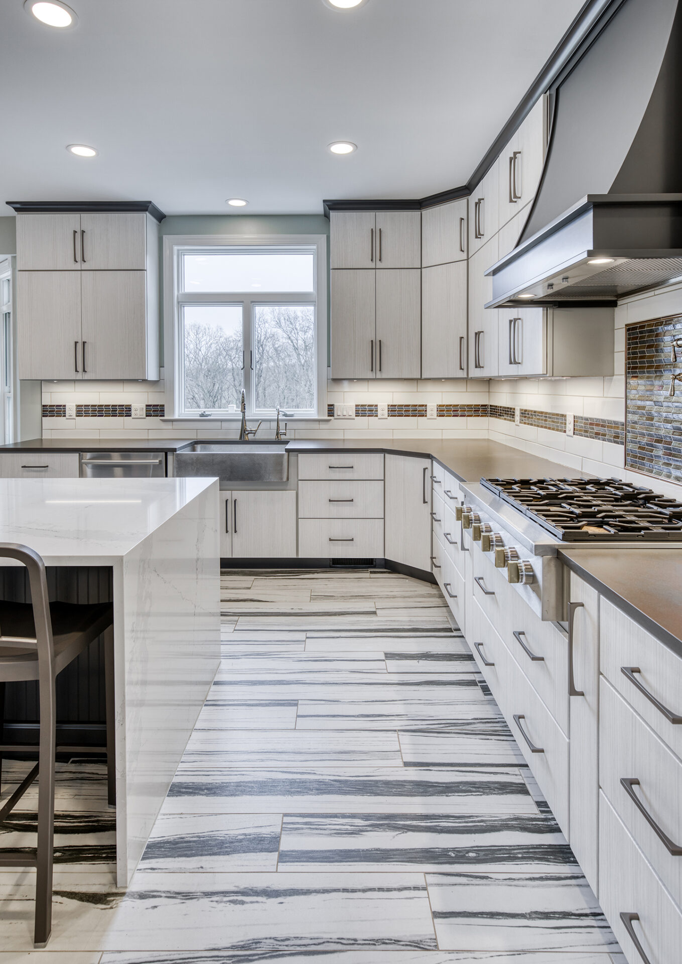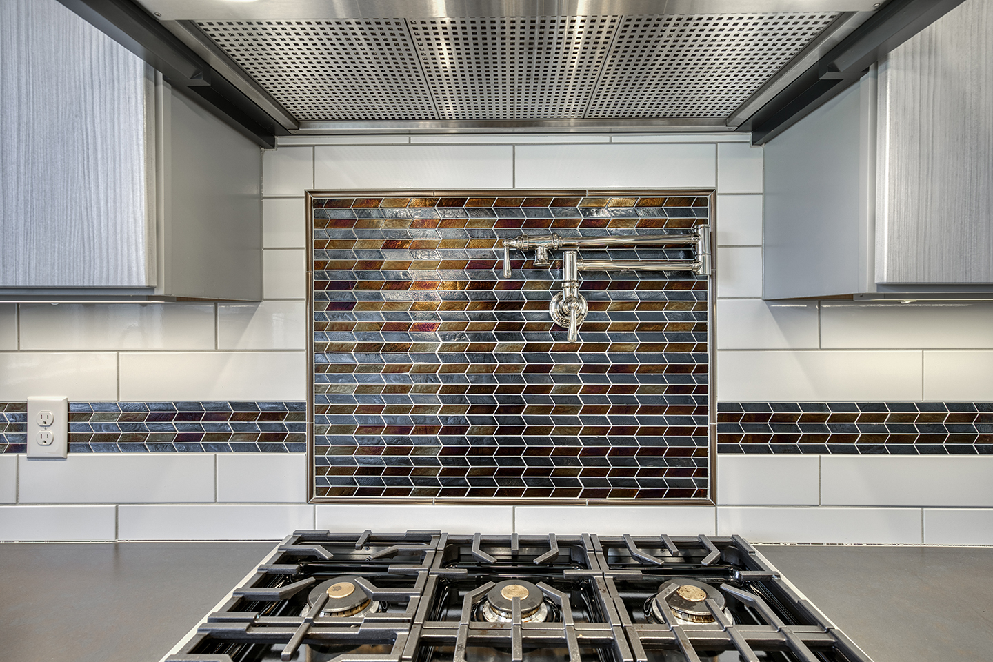 This kitchen remodel features a clean and modern design with a waterfall island, subway tile, and a stunning tile accent behind the stove. This complete transformation welcomes family and friends into a light-filled space for eating and gathering.