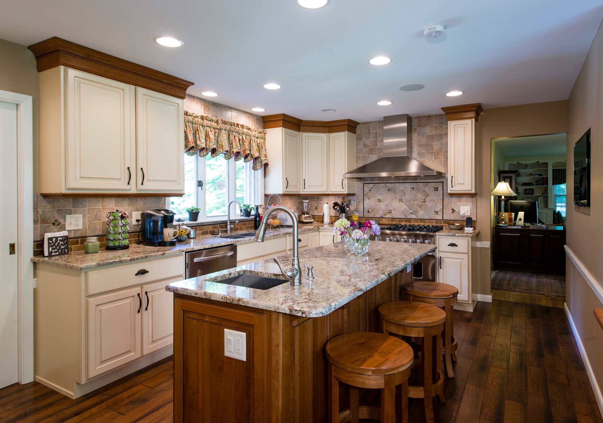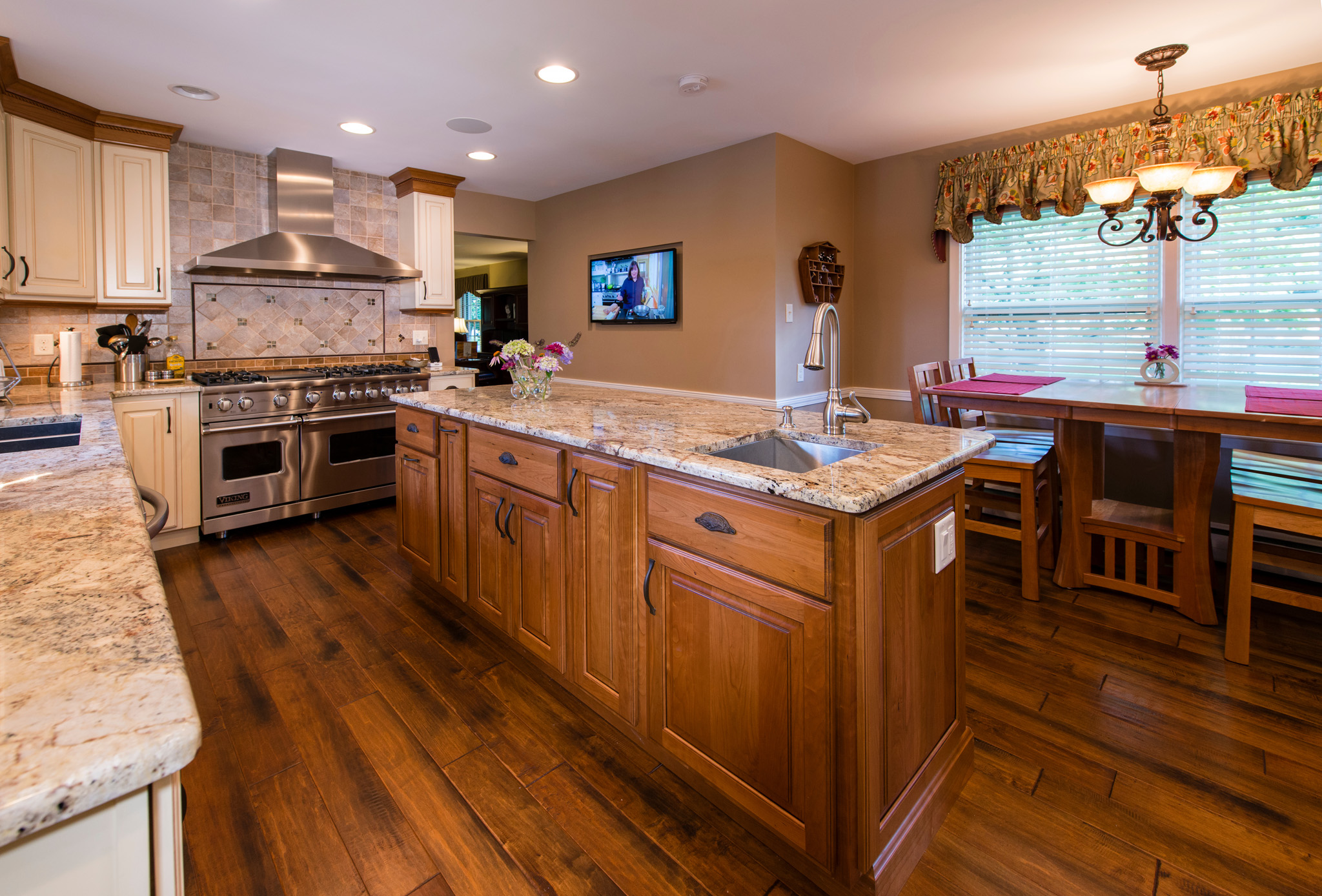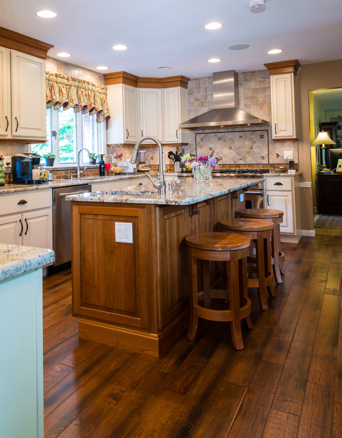 Warm wood flooring, contrasting cabinetry and high-end stainless steel appliances create a welcome appeal to the this kitchen. The extended island now features a prep sink and stool seating, which adds functionality and provides more room for family and guests in the kitchen.