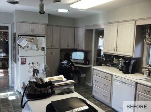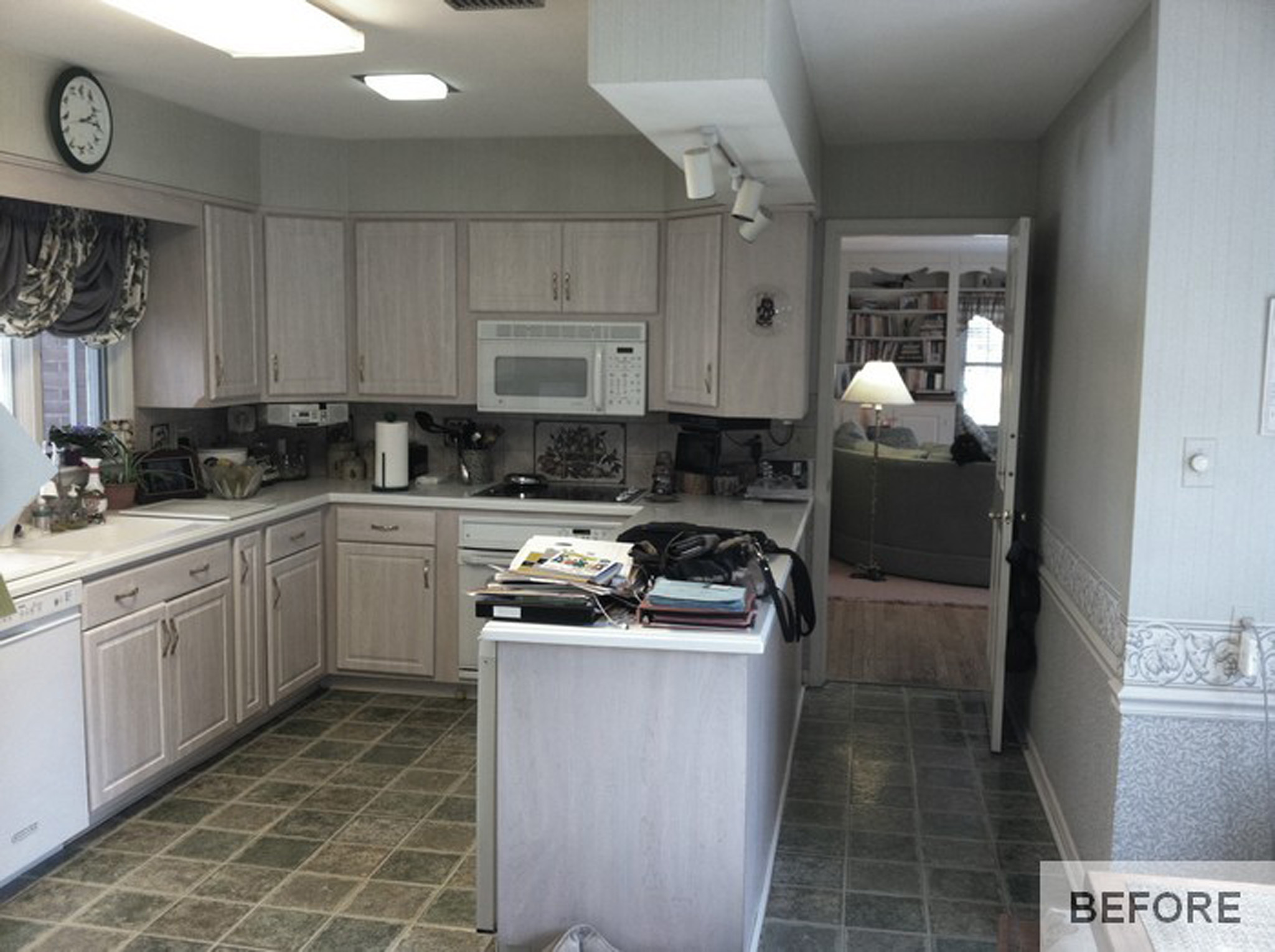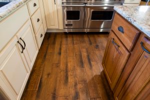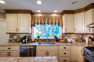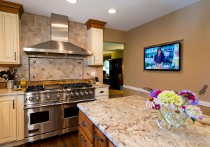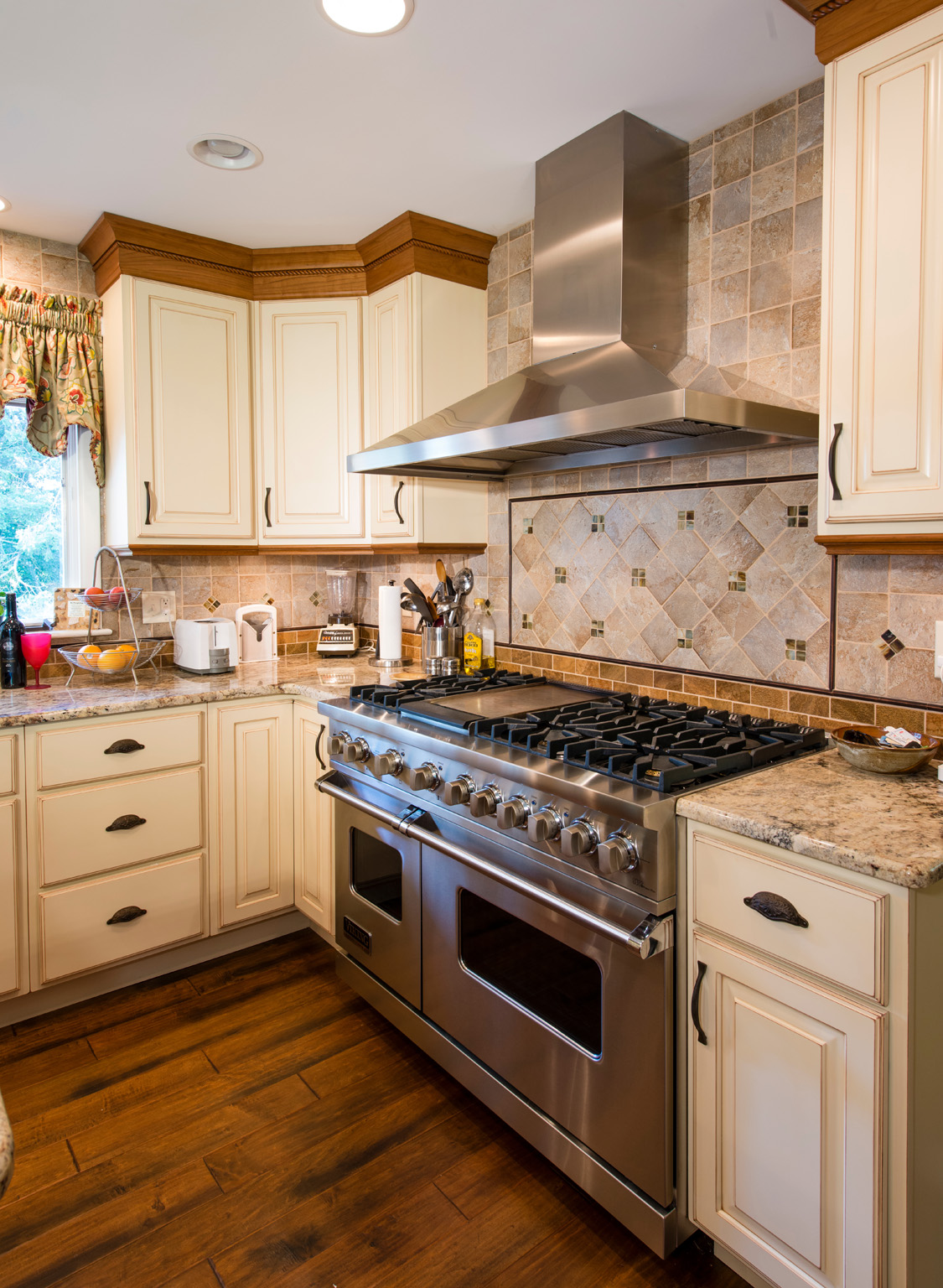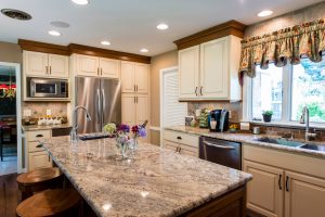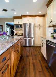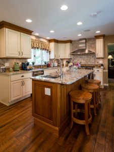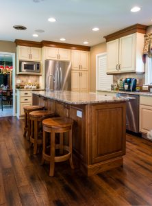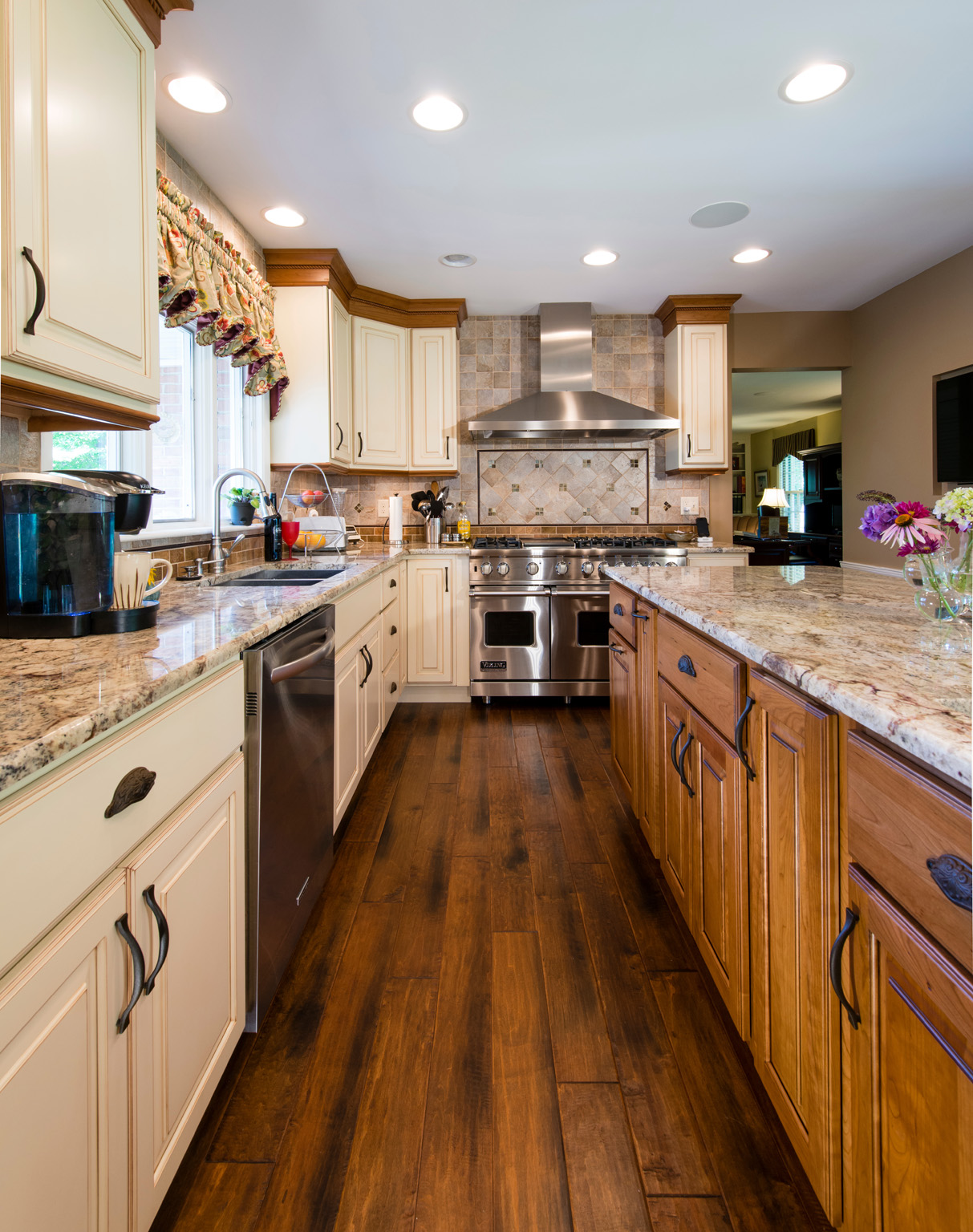 Warm wood flooring, contrasting cabinetry and high-end stainless steel appliances create a welcome appeal to the this kitchen. The extended island now features a prep sink and stool seating, which adds functionality and provides more room for family and guests in the kitchen.