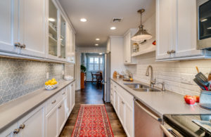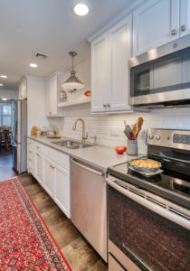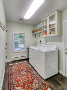 The couple was very involved in every detail over the 2-month long project, from the outside Rhode-Island inspired look with a bright red door and contrasting dark grey exterior, to the custom details on the interior such as the distressed-look vinyl planking in the kitchen and laundry area, and the shallow kitchen cabinet specifically designed to hold their spice collection.